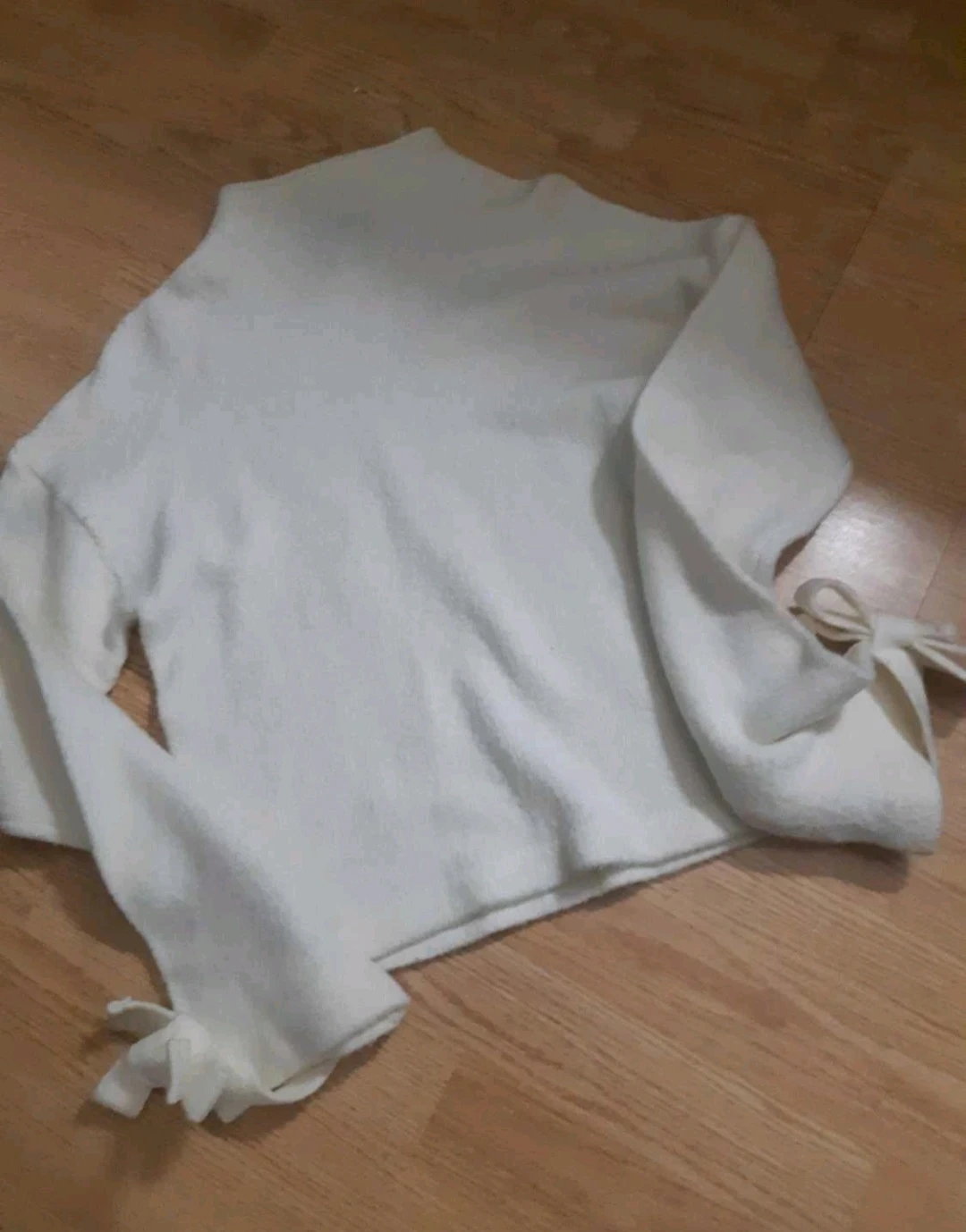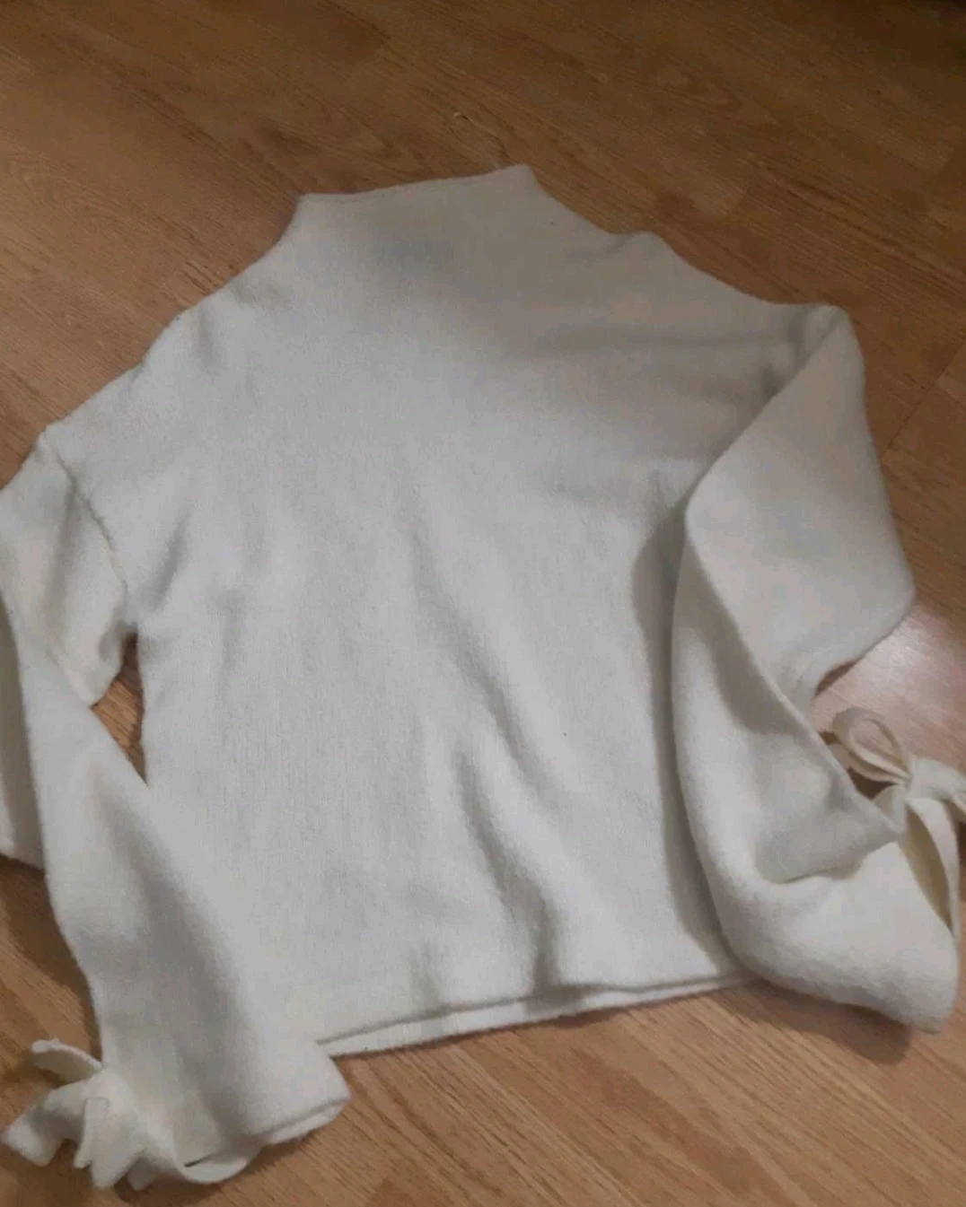 A cozy cream-coloured knit sweater! It features a mock neck and cute tie details on the sleeves. Perfect for layering or wearing on its own!