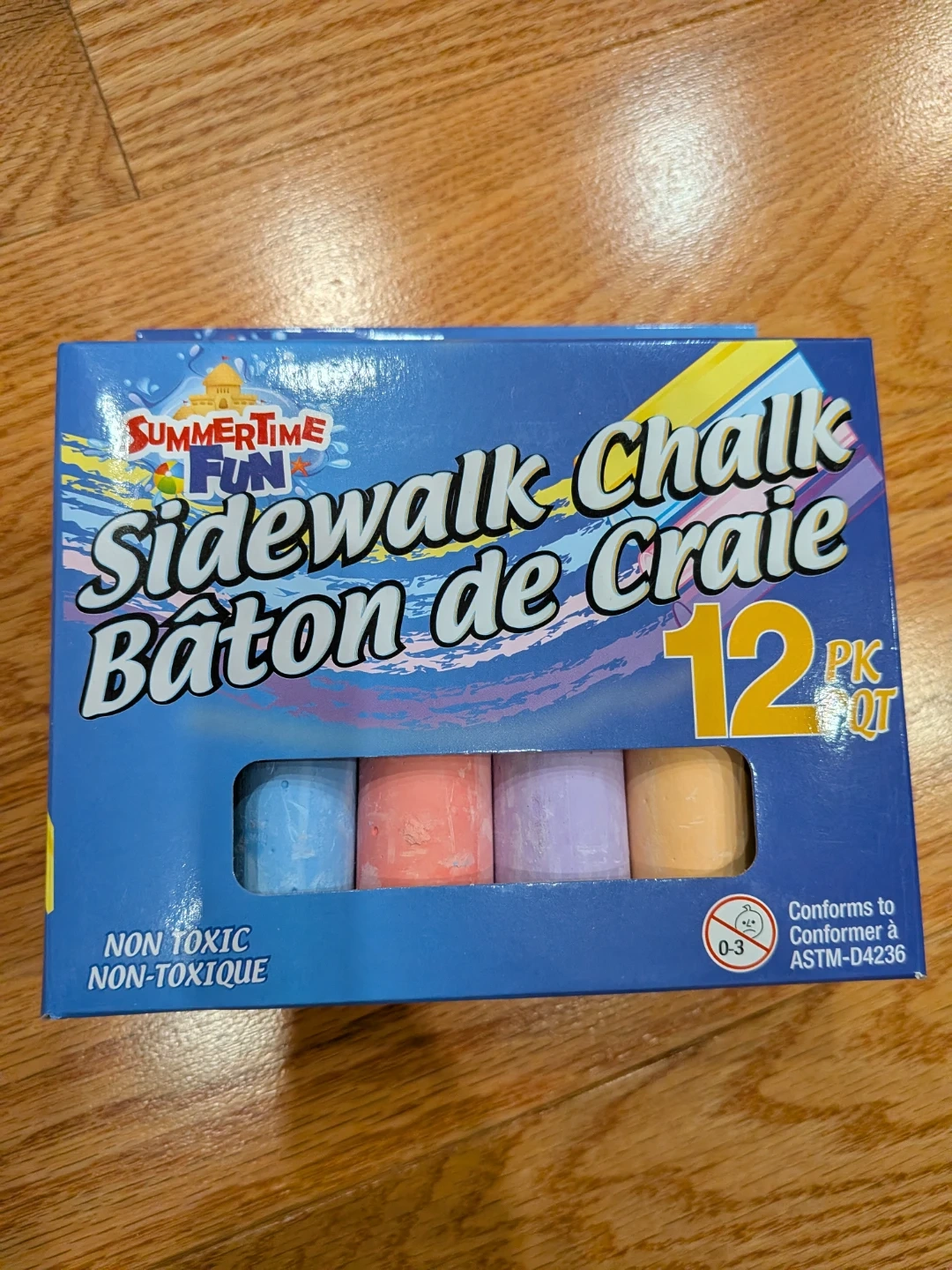 Selling a box of Summertime Fun sidewalk chalk! This set comes with 12 pieces in a variety of fun colours. It's non-toxic and conforms to ASTM-D4236, making it safe for kids aged 0-3