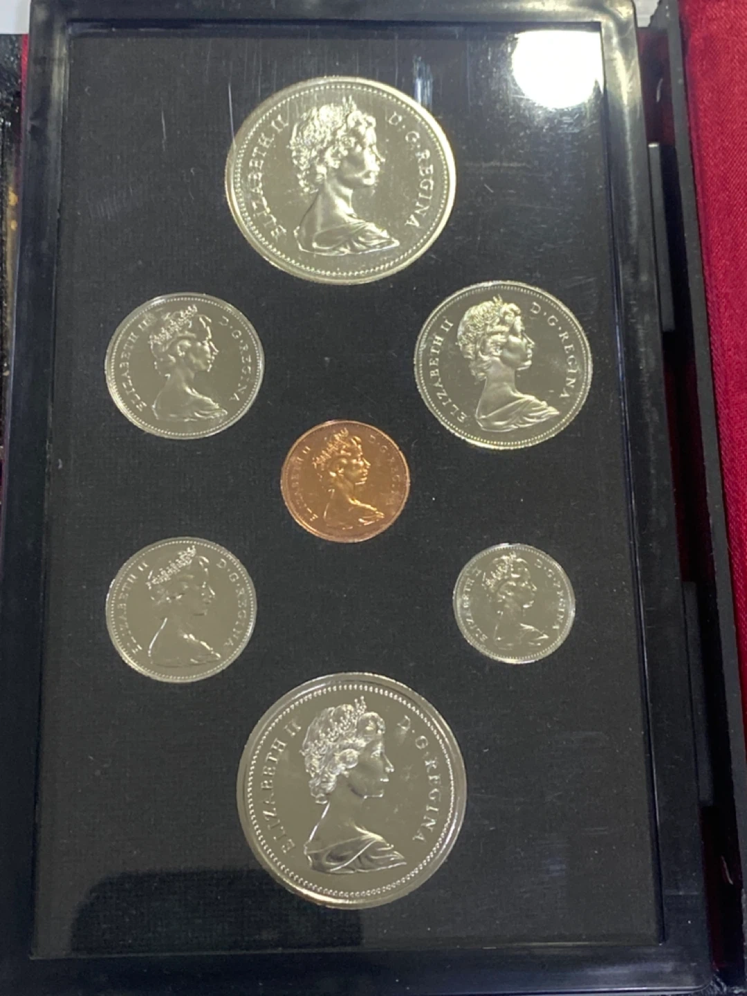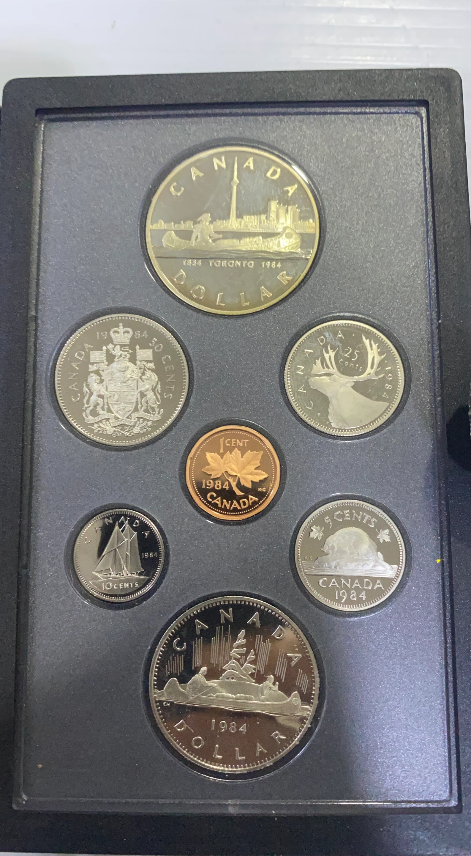 Selling a 1984 coin set from the Royal Canadian Mint. It includes all the denominations from that year, from the 1 cent piece to the dollar. The coins are in great shape and come in the original case. A nice addition to any collection!
