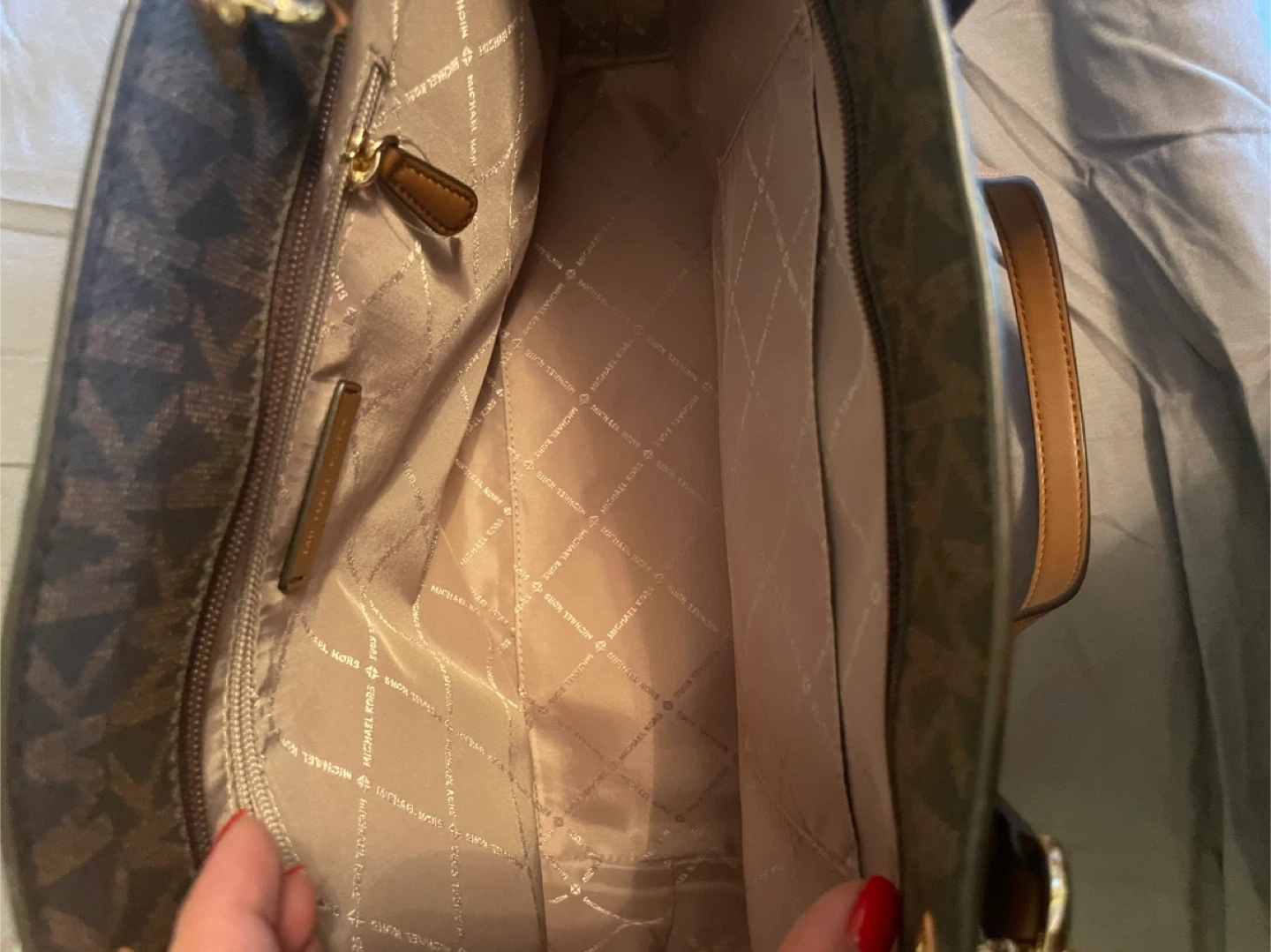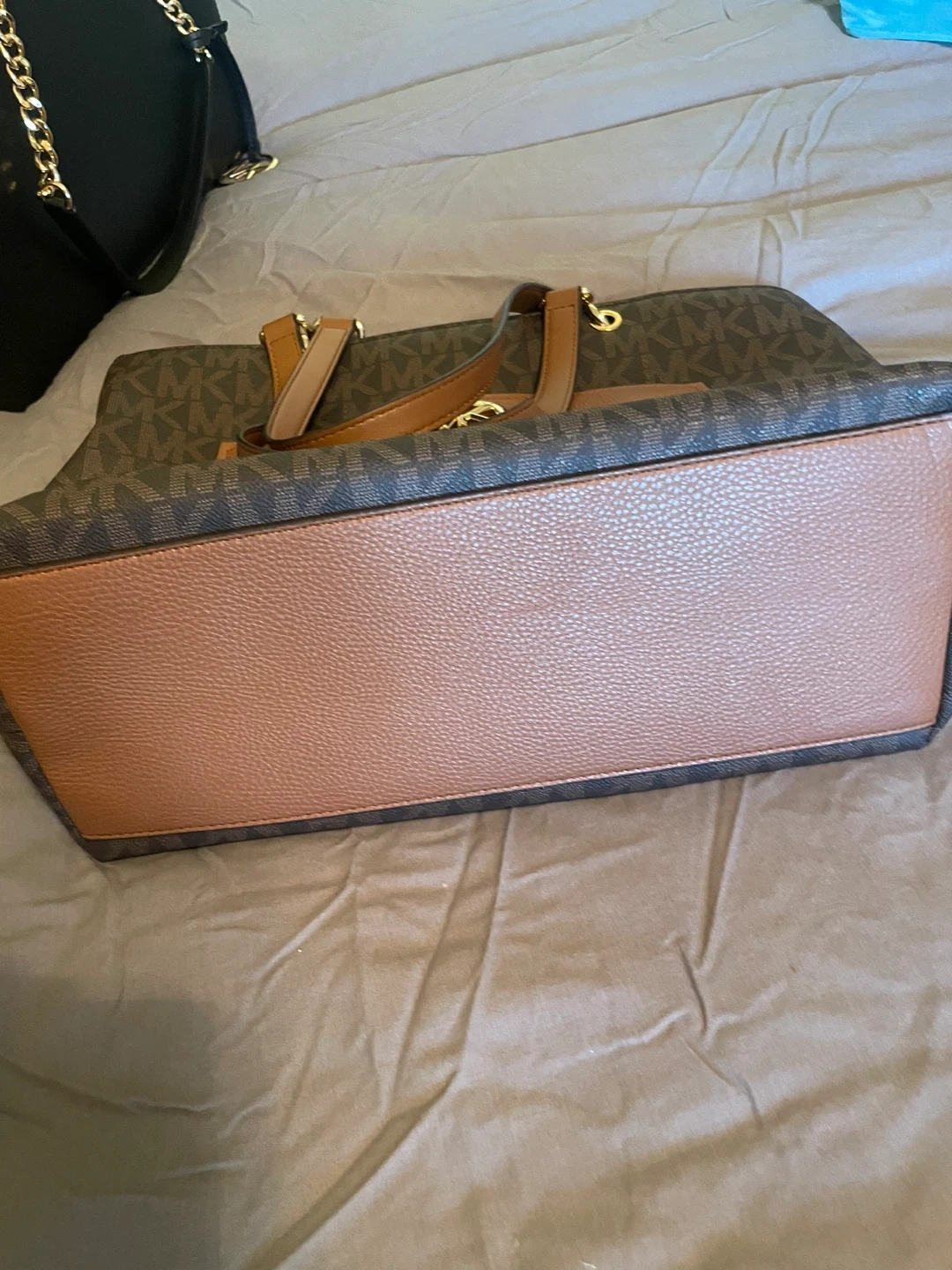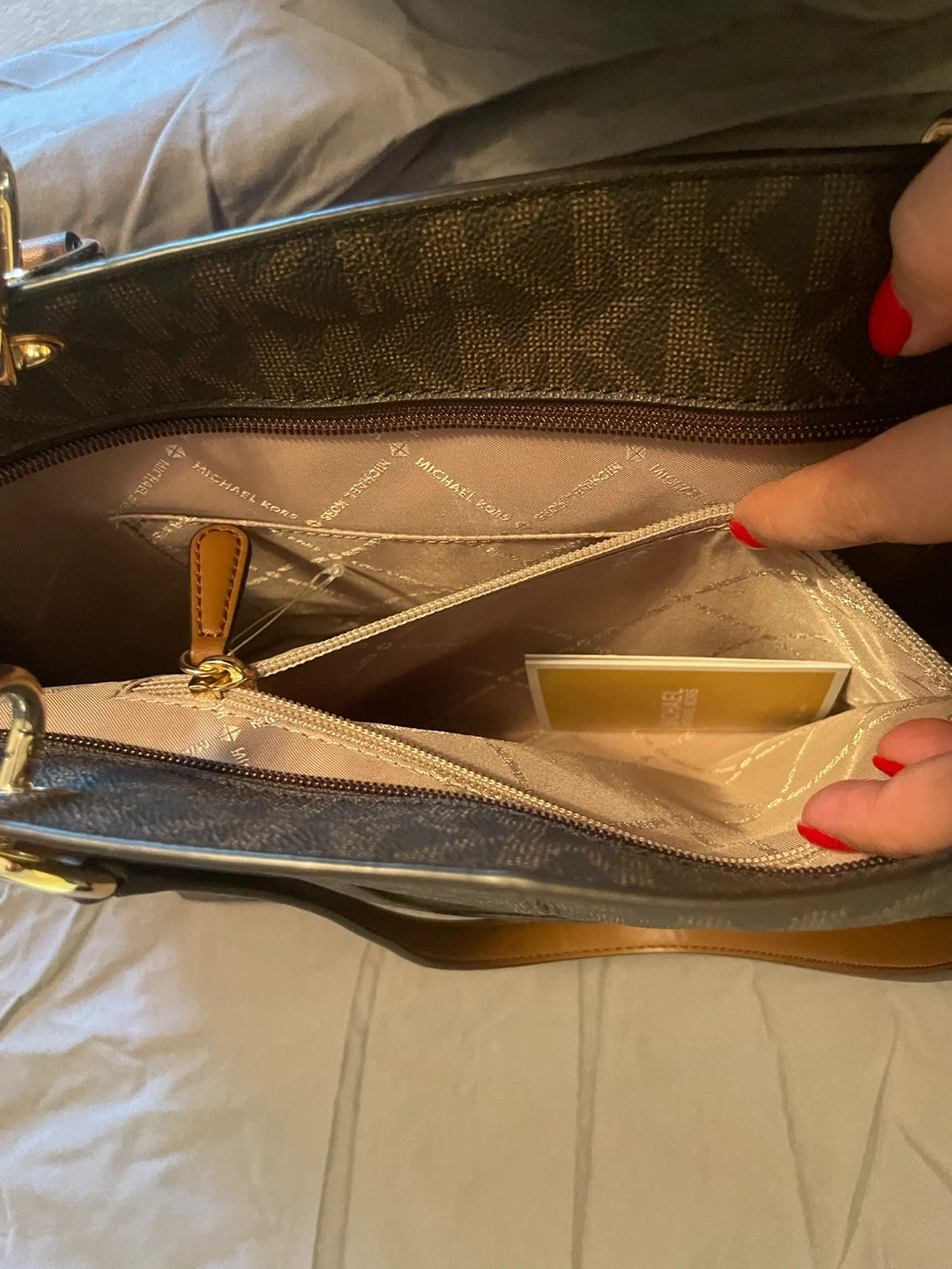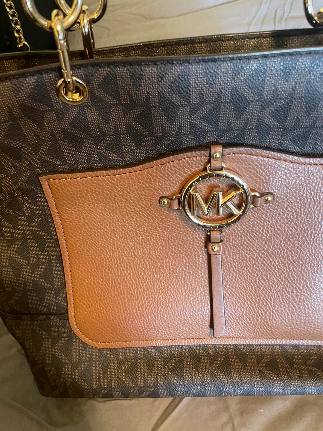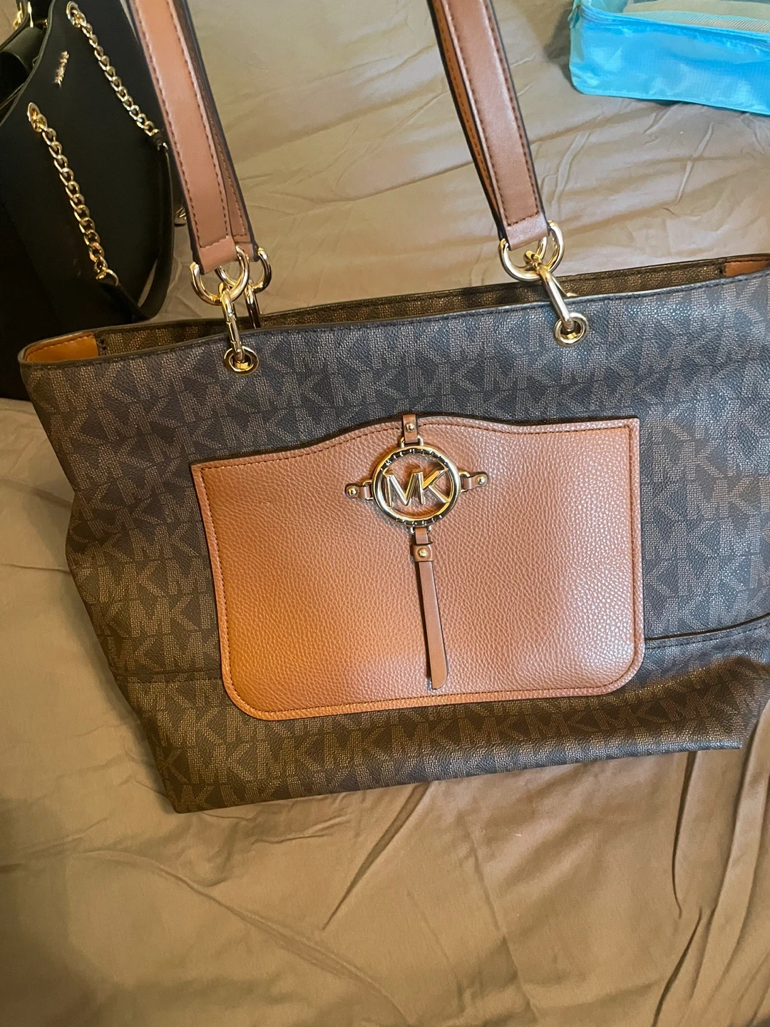 Selling a Michael Kors tote bag. It features the signature MK logo pattern and brown leather accents. Note like new worn only twice.