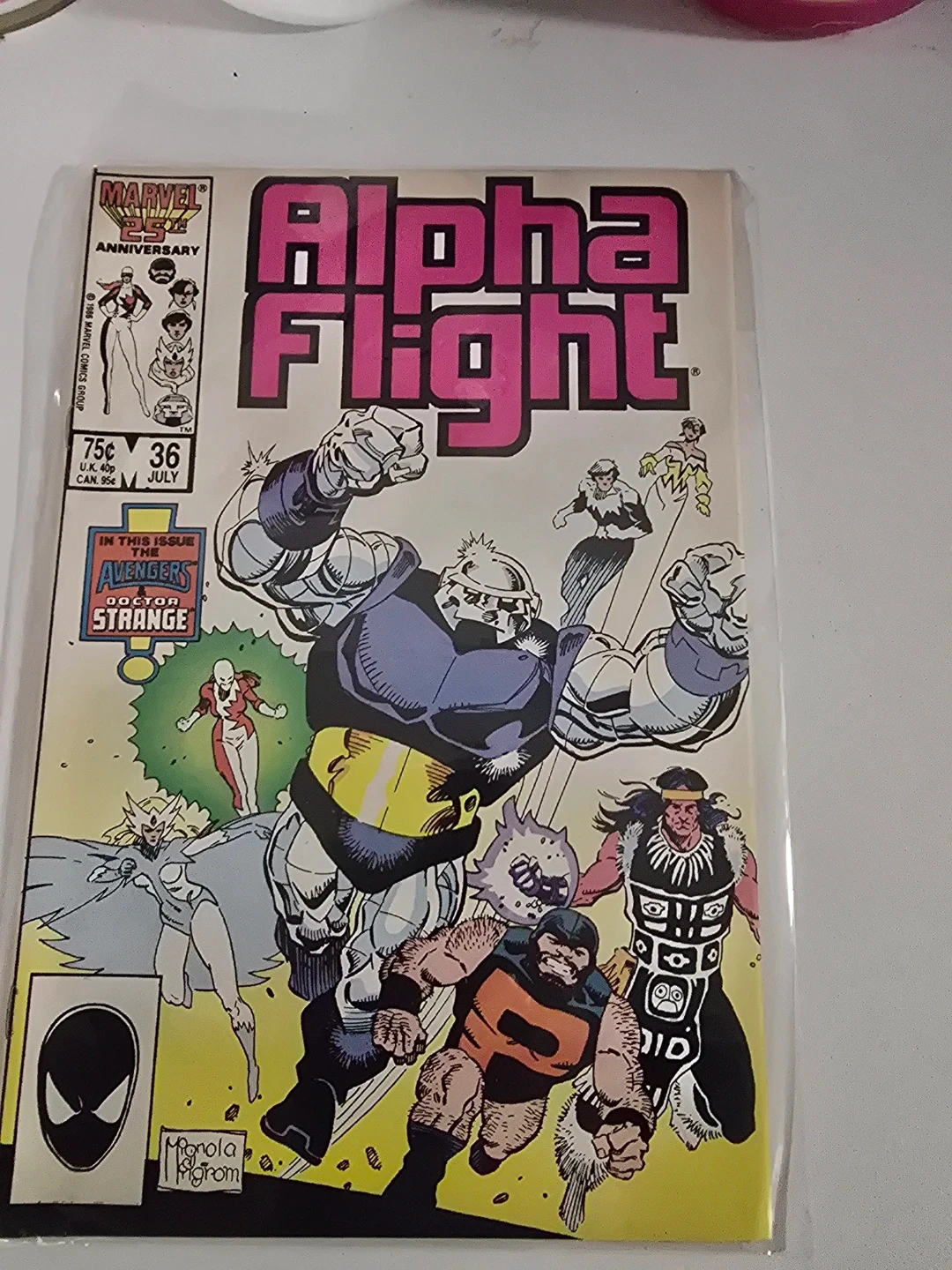 Selling Alpha Flight issue #36 comic book. This is a Marvel Comics Group publication from July. It also features Power Pack and The Amazing Spider-Man with tips on sexual abuse prevention.