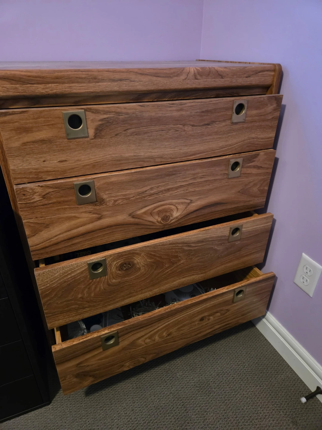 Here's a lovely wooden dresser with four drawers. It's perfect for adding some extra storage to your bedroom or any other room in the house. The wood grain is really beautiful and adds a touch of warmth to the space