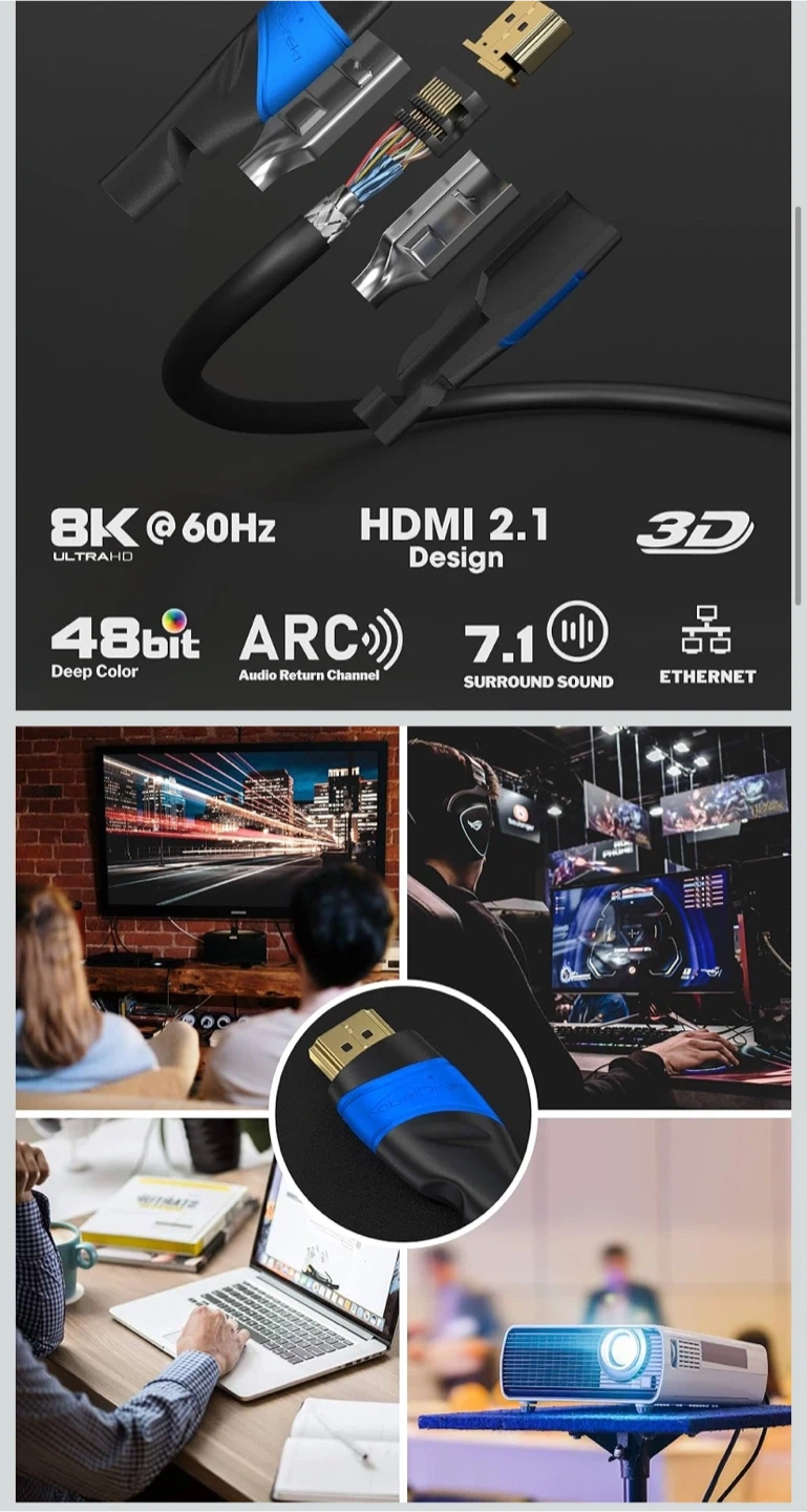 Selling a brand new KabelDirekt High Speed HDMI Cable, still in its original packaging! This is a 6ft cable, perfect for connecting your devices. It supports 8K at 60Hz and HDMI 2.1, ensuring a high-quality connection for your home theatre or gaming setup. The cable also features ARC (Audio Return Channel) and supports 7.1 surround sound.
