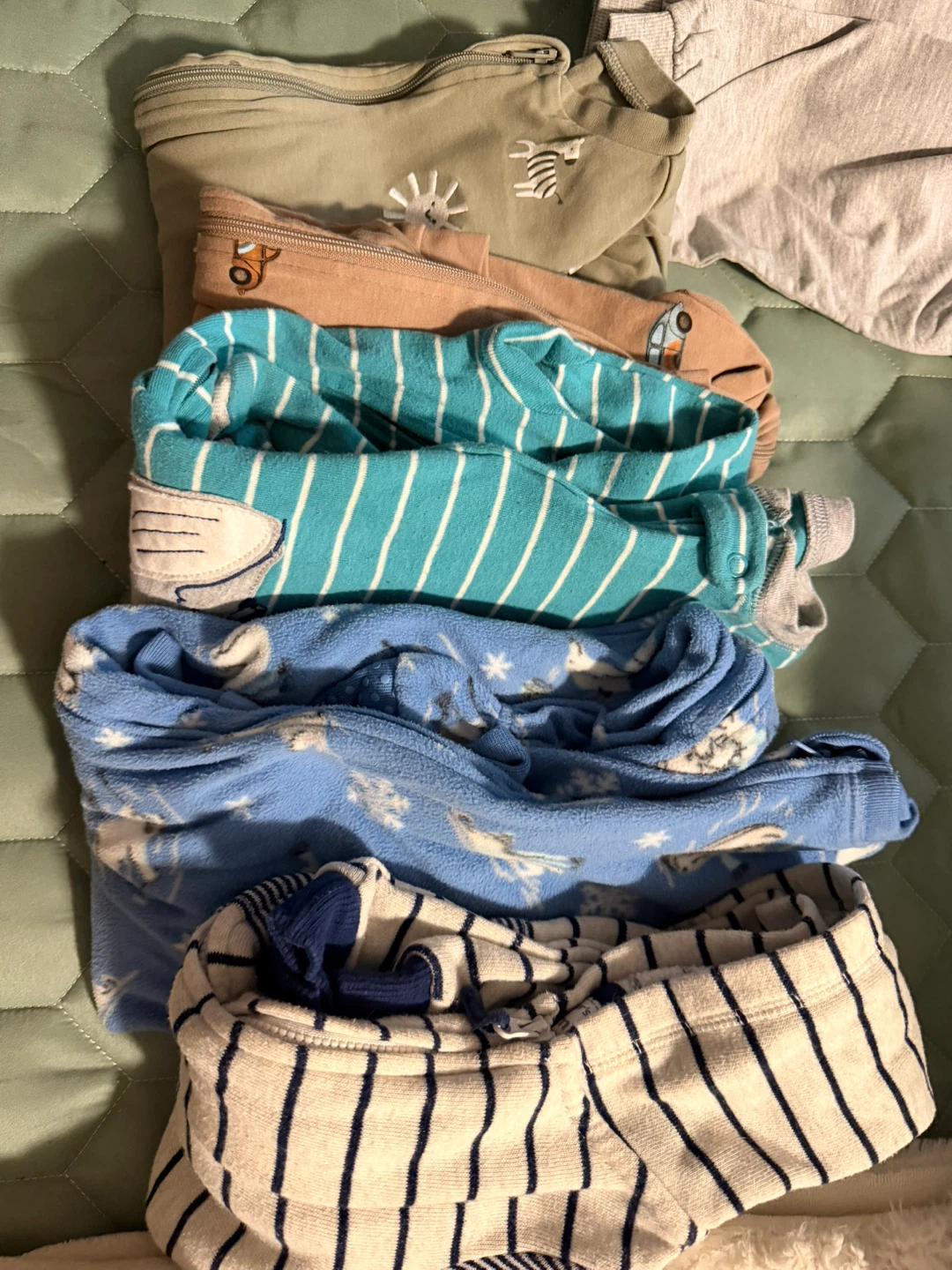 A bundle of baby sleep sacks and pajamas in various colours and patterns. Perfect for keeping your little one comfy and snug during sleep time!