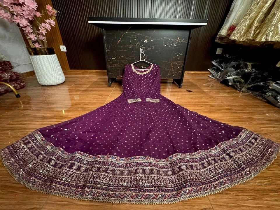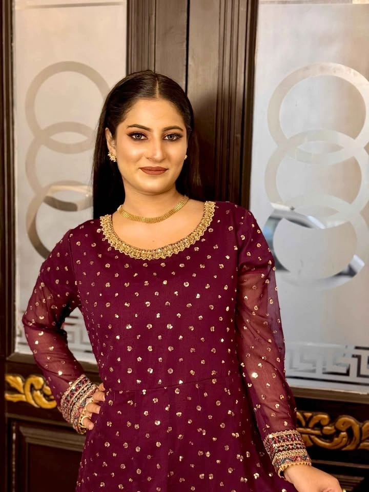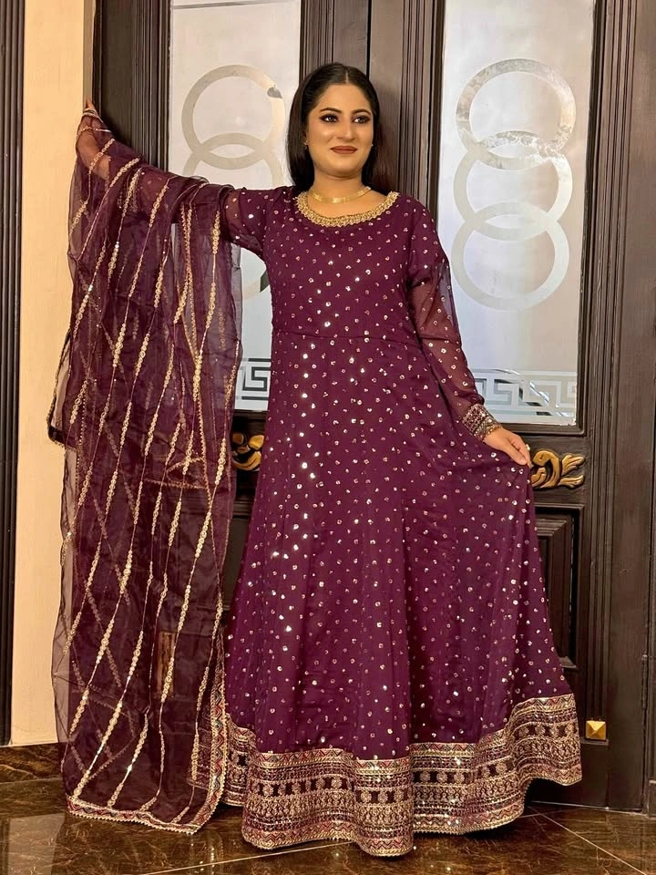 Available in sizes small, medium, and large. Chiffon dress with heavy sequence work and a flairy, maxi-style design on both the front and back.