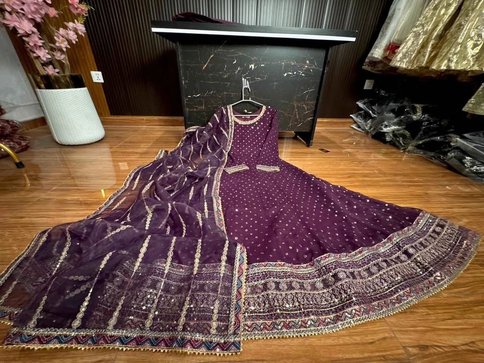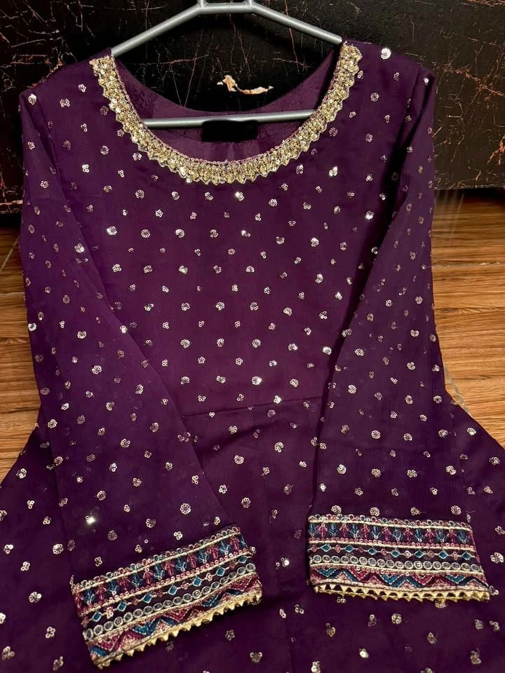 It comes with an embroidered Organza Dupatta and silk trousers.
