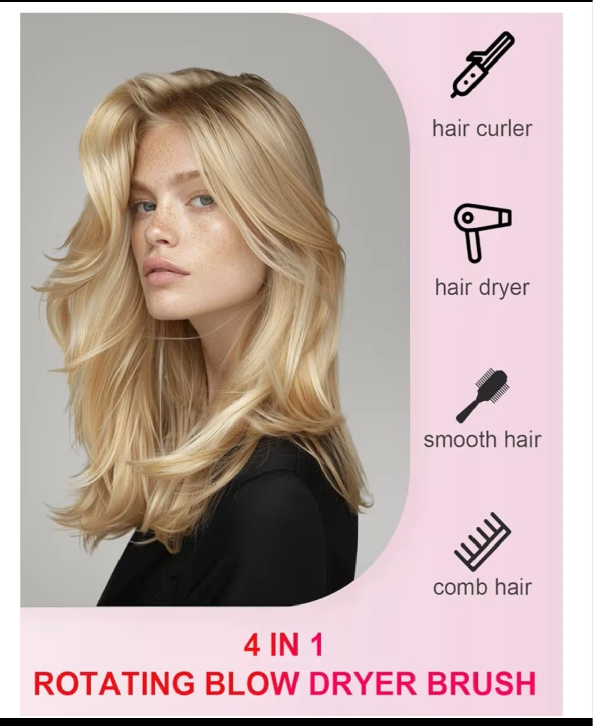 Selling a hot air brush multi-styler! It's a 4-in-1 rotating blow dryer brush that can be used as a hair curler, hair dryer, and for smooth and comb hair. It is 900W and styles your hair quickly and efficiently!