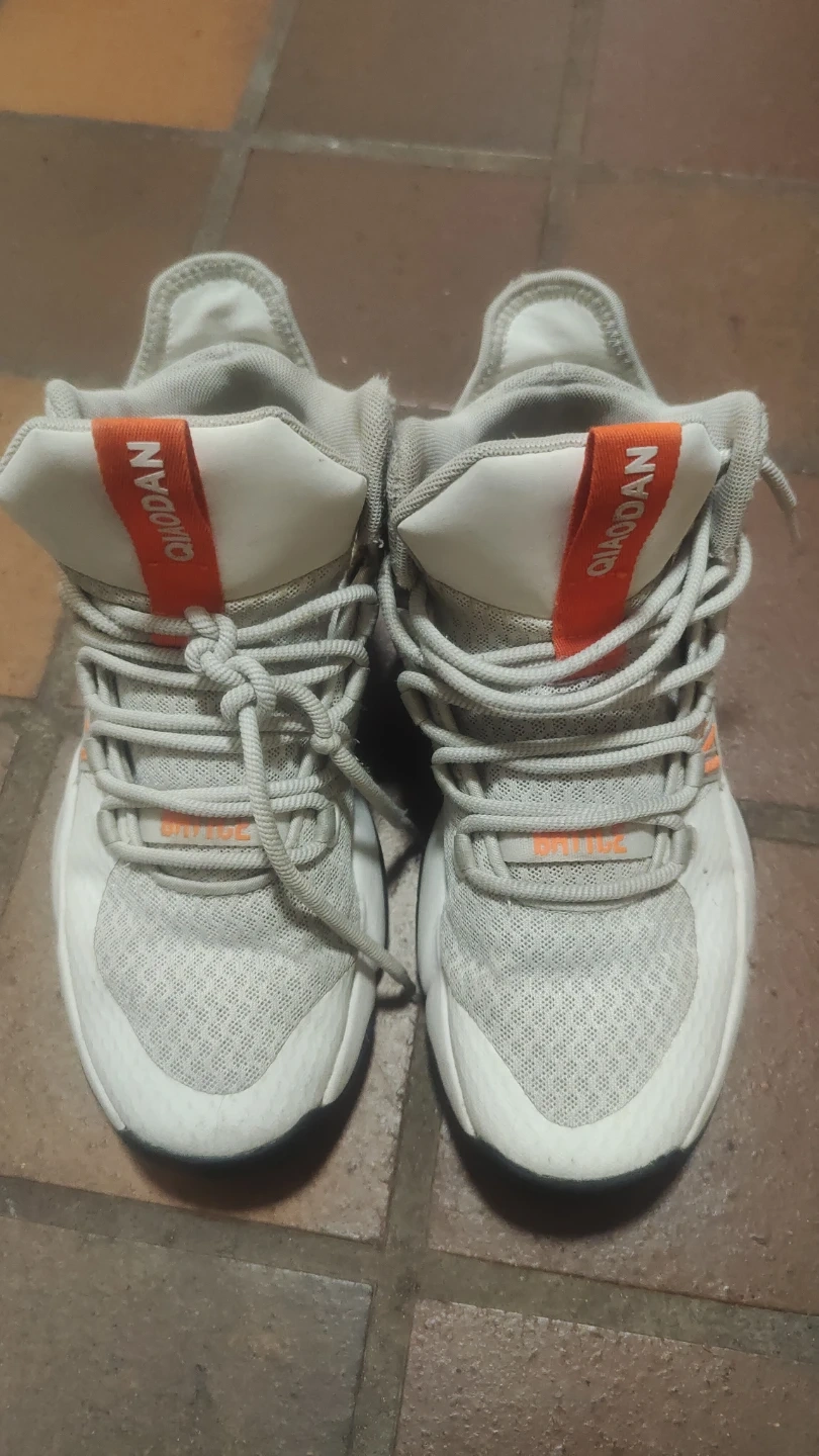 Selling a pair of Qiao Dan athletic shoes. They are white with orange accents and in good condition. Perfect for running or everyday wear!