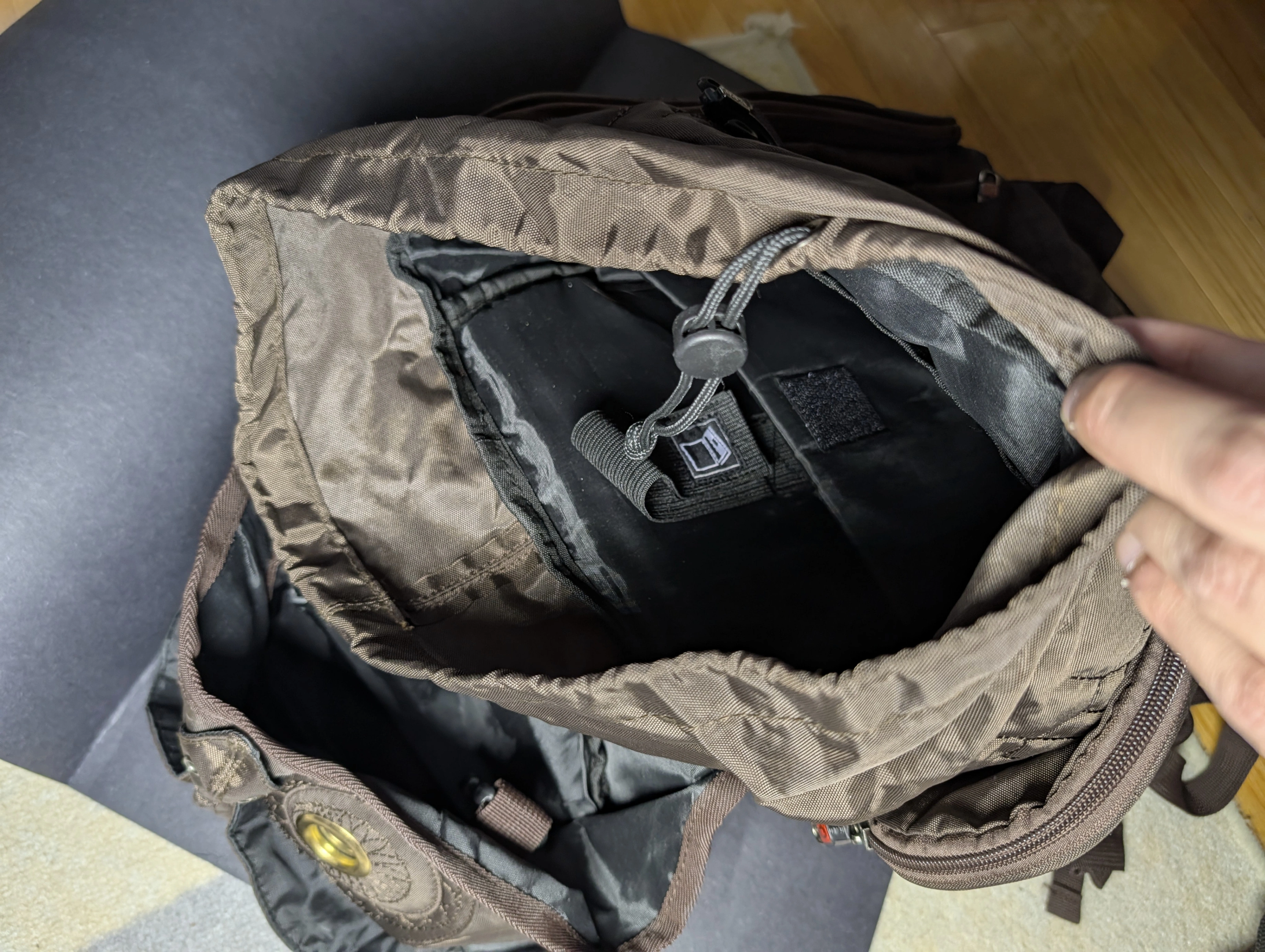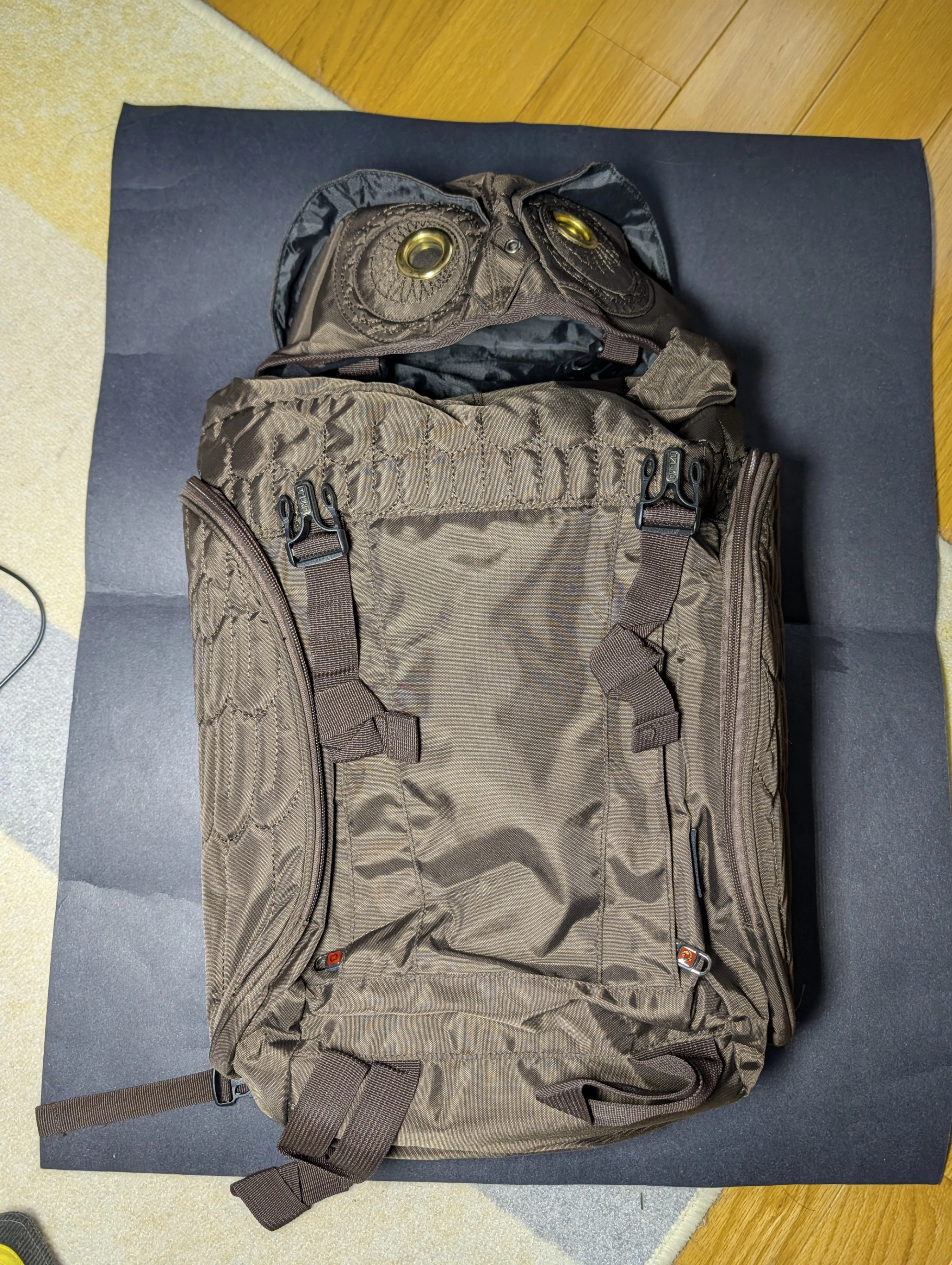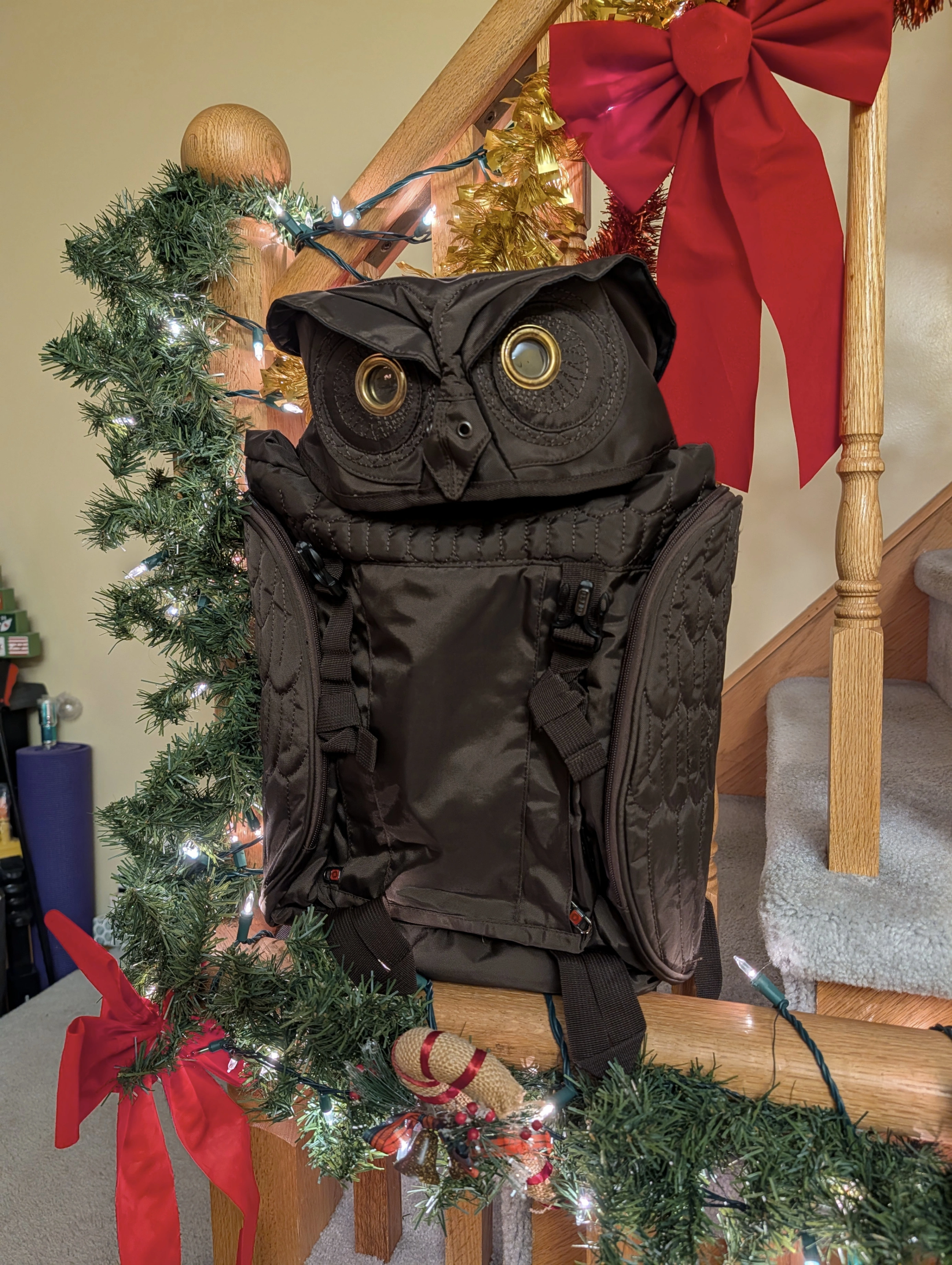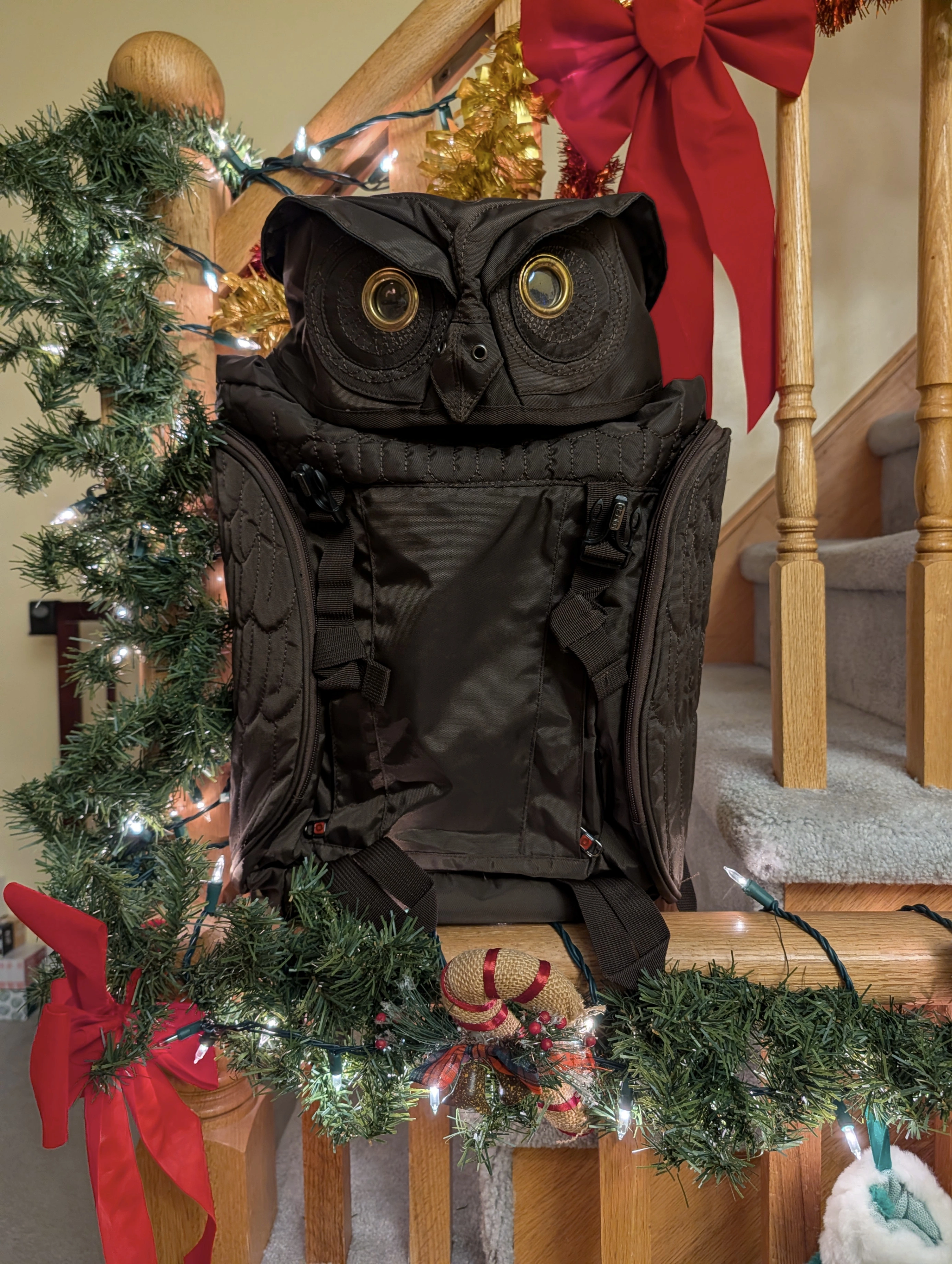 A laptop backpack with an owl design. Brown, although it looks like it's black in the pictures.