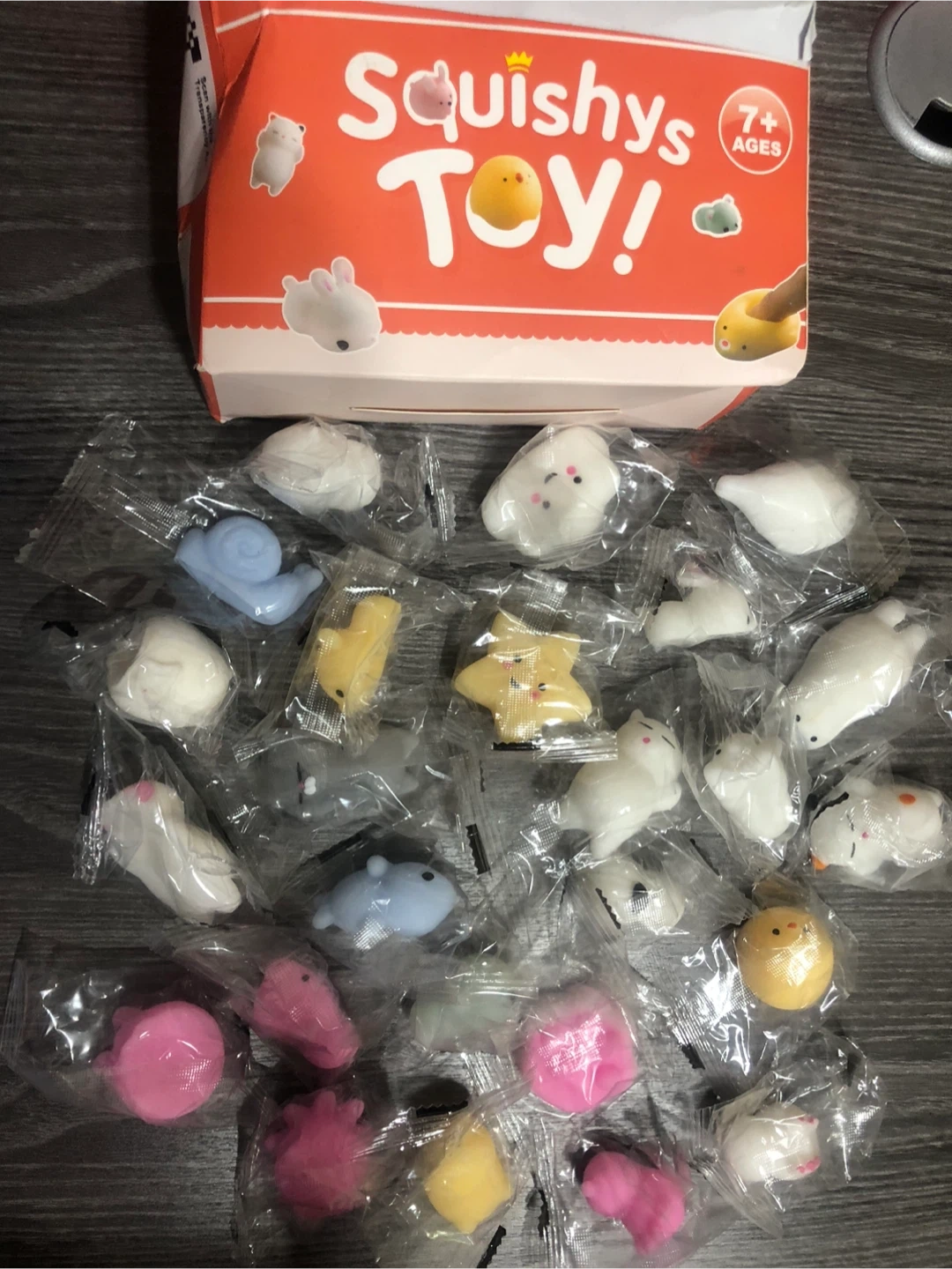 Selling a box of Squishys Toy! These are recommended for ages 7 and up. They come in various shapes and colours and are individually wrapped. Perfect for little hands!