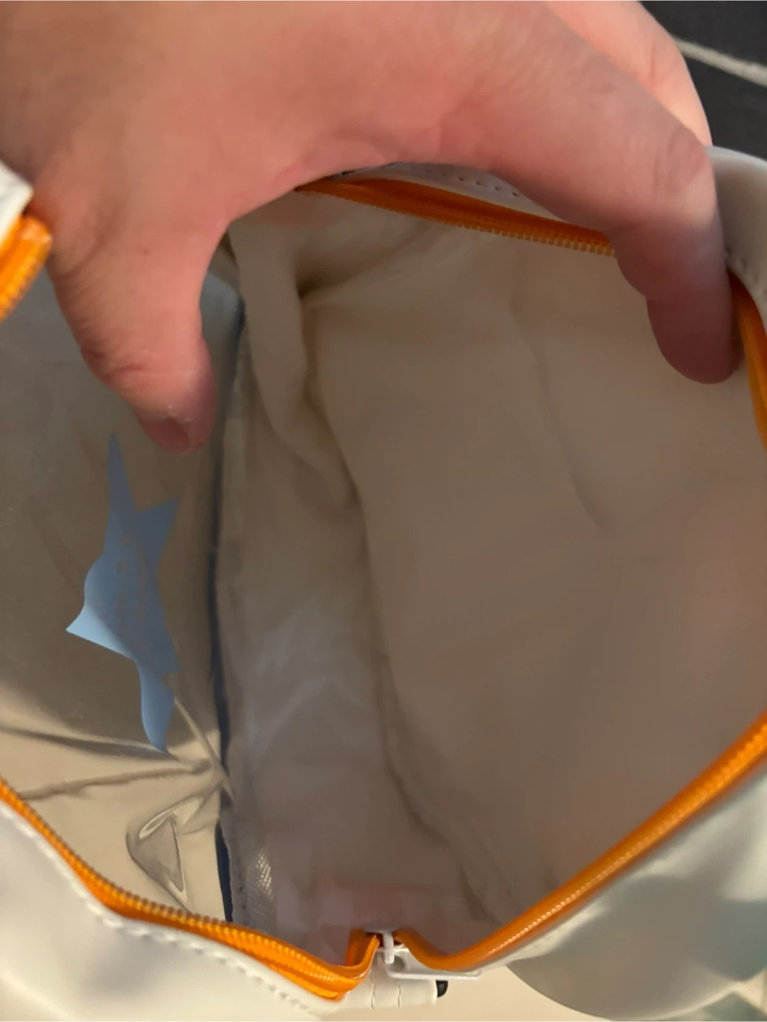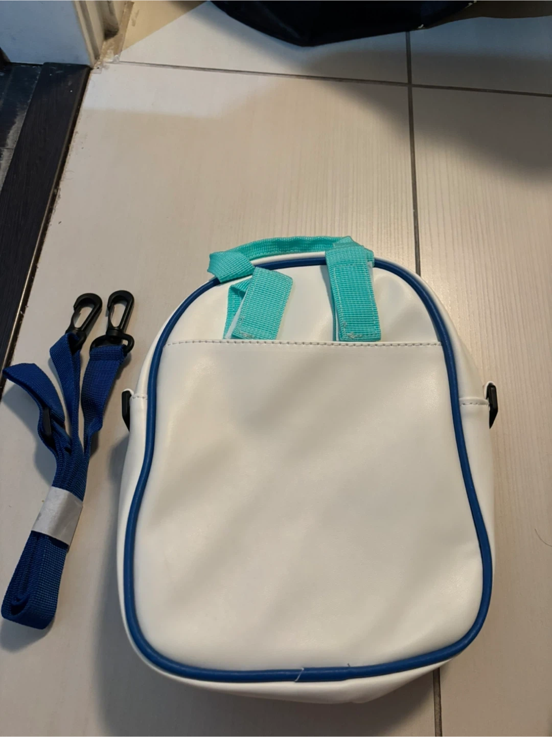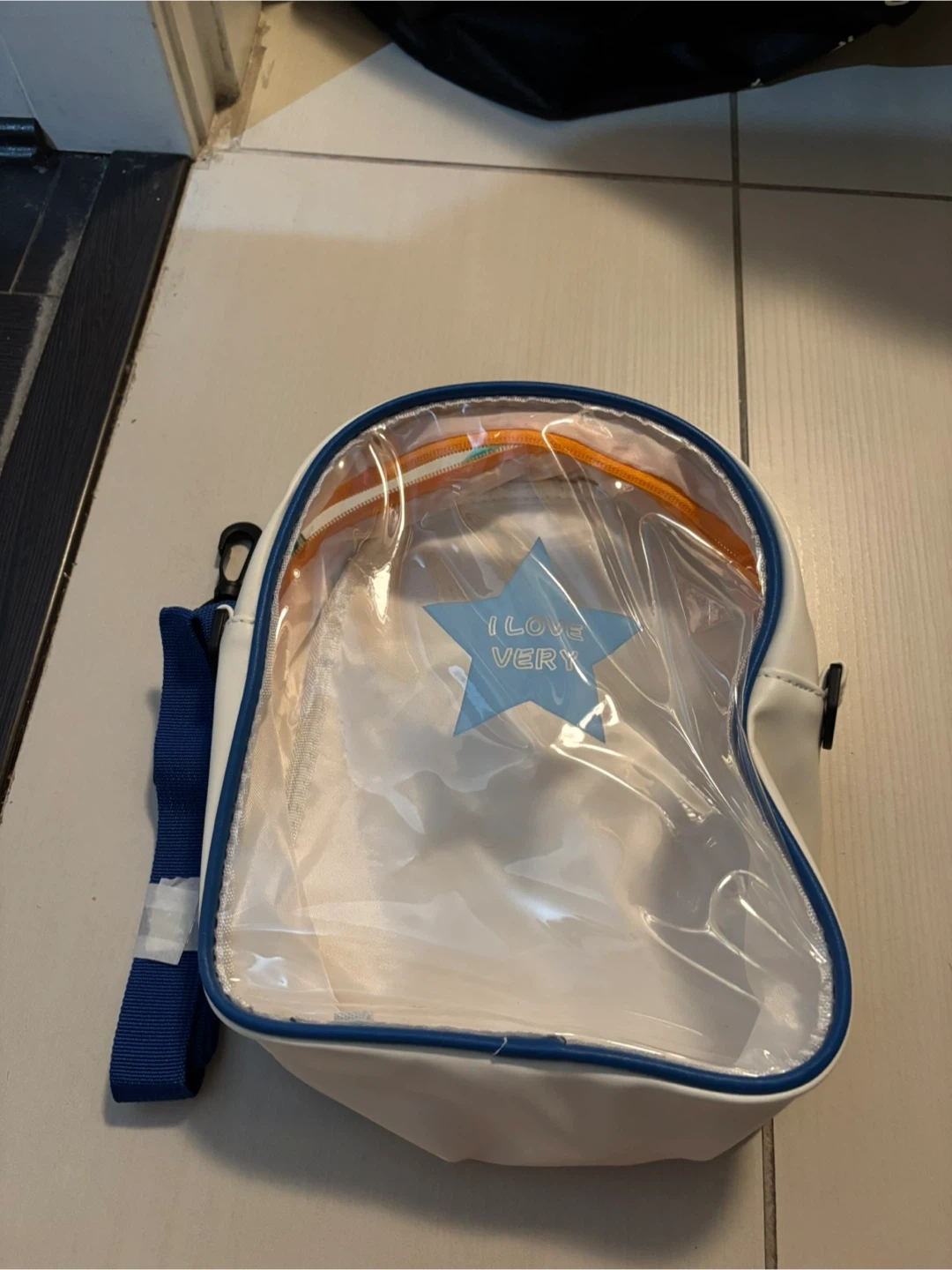 A cute white and blue shoulder bag! It comes with a blue shoulder strap. The inside has an orange zipper and a clear plastic section.