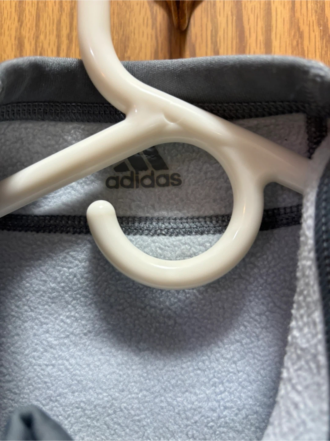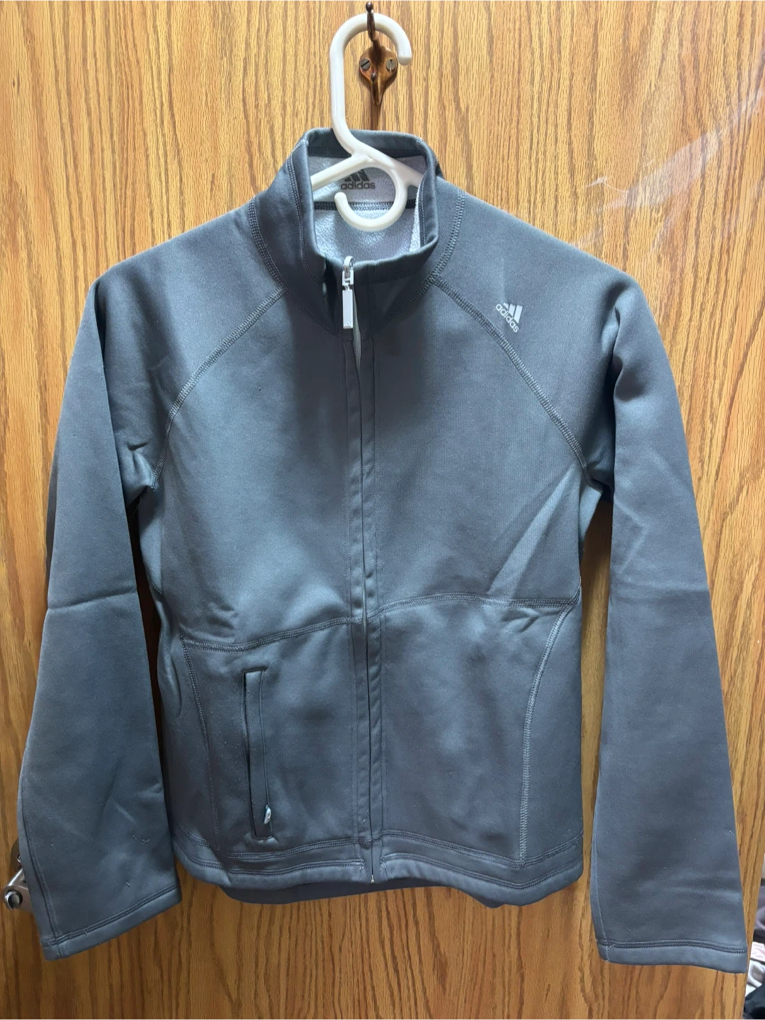 Selling a gray Adidas full zip jacket. It's in great condition and perfect for layering or wearing on its own. The Adidas logo is visible on the front and back.