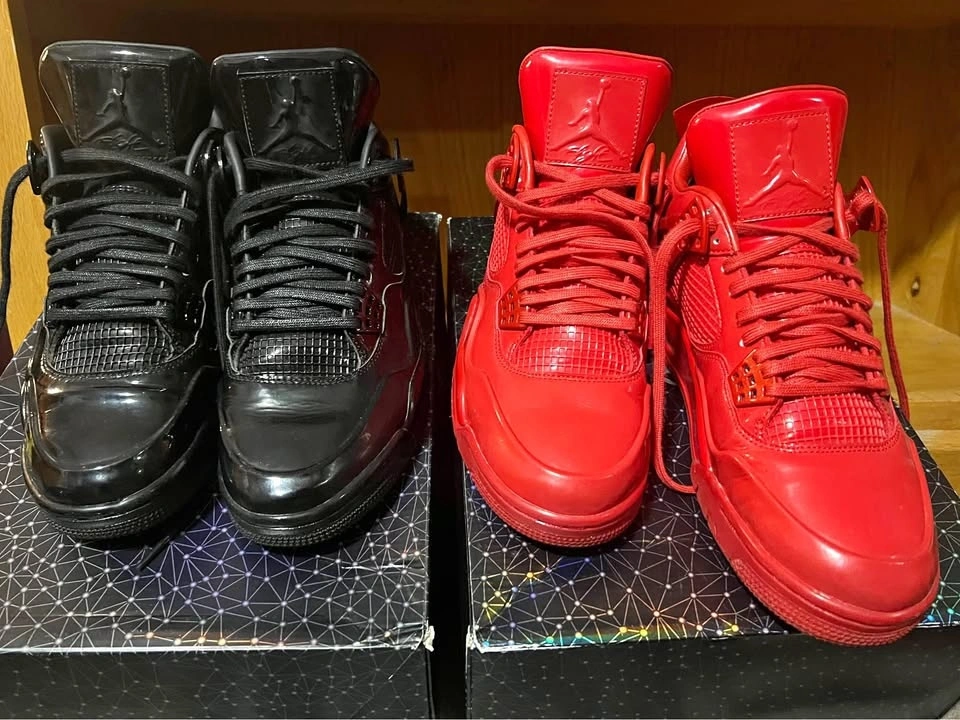 Selling both pairs together for $600 : Air Jordan 4 11Lab4 in Black and Red — the glossy patent leather versions with the premium, futuristic vibe.