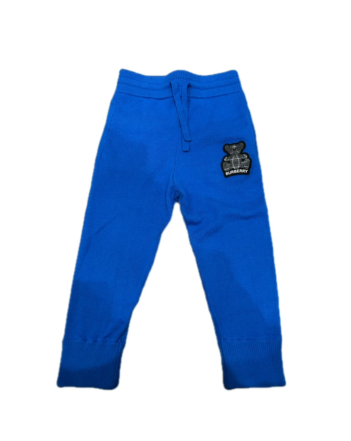 These adorable Burberry kids' sweatpants are in a vibrant blue colour. They feature the iconic Burberry teddy bear patch. The size is 3Y (98cm). They are in great condition and ready for a new little owner!