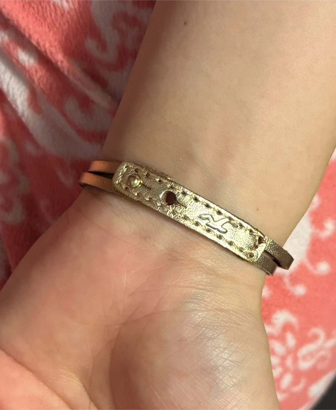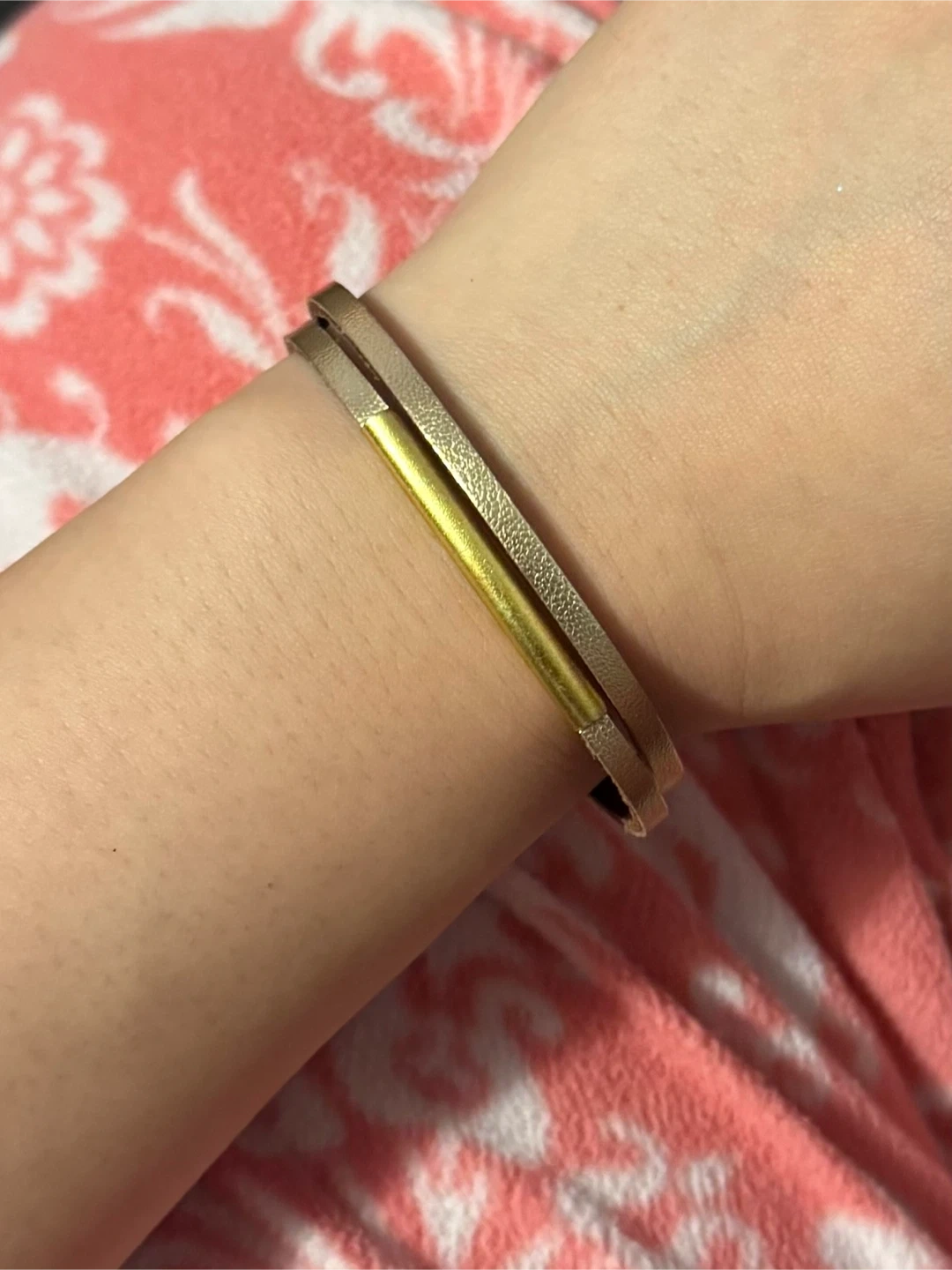 This is Hollister bracelet in a gold colour. It's a stylish accessory that can add a touch of elegance to any outfit. It's made of leather and has a unique design.