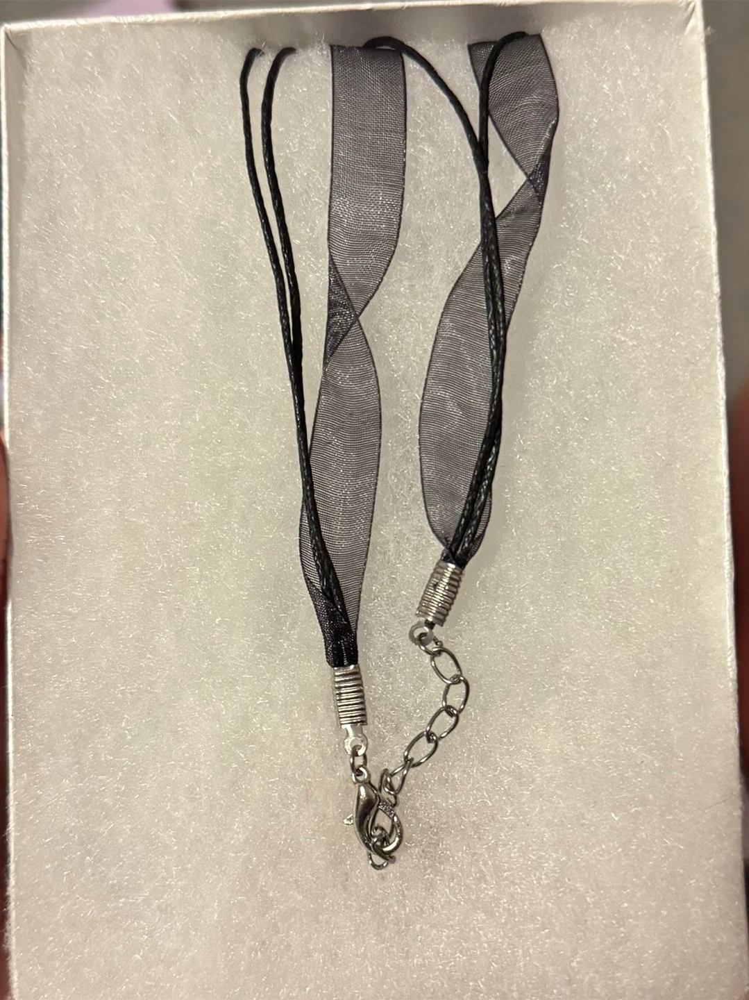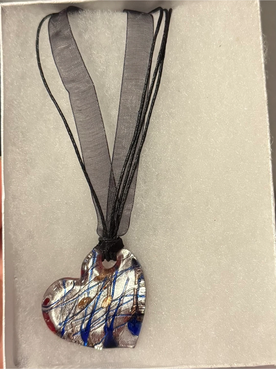 Selling a new glass heart-shaped pendant necklace with a black ribbon. The pendant has a silver base with blue and gold accents. Comes in a gift box!