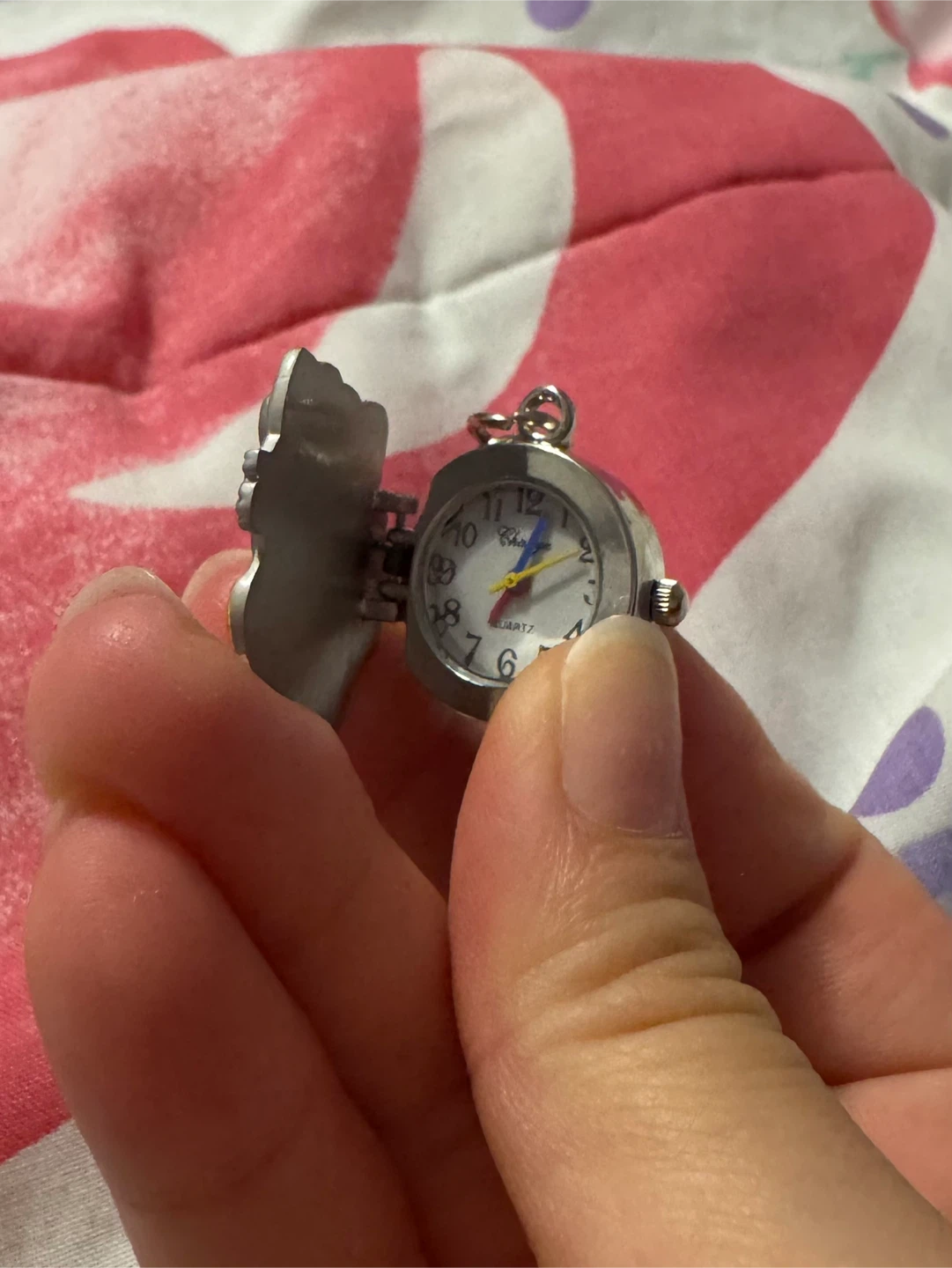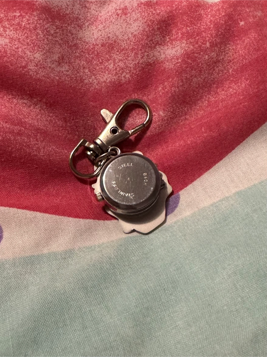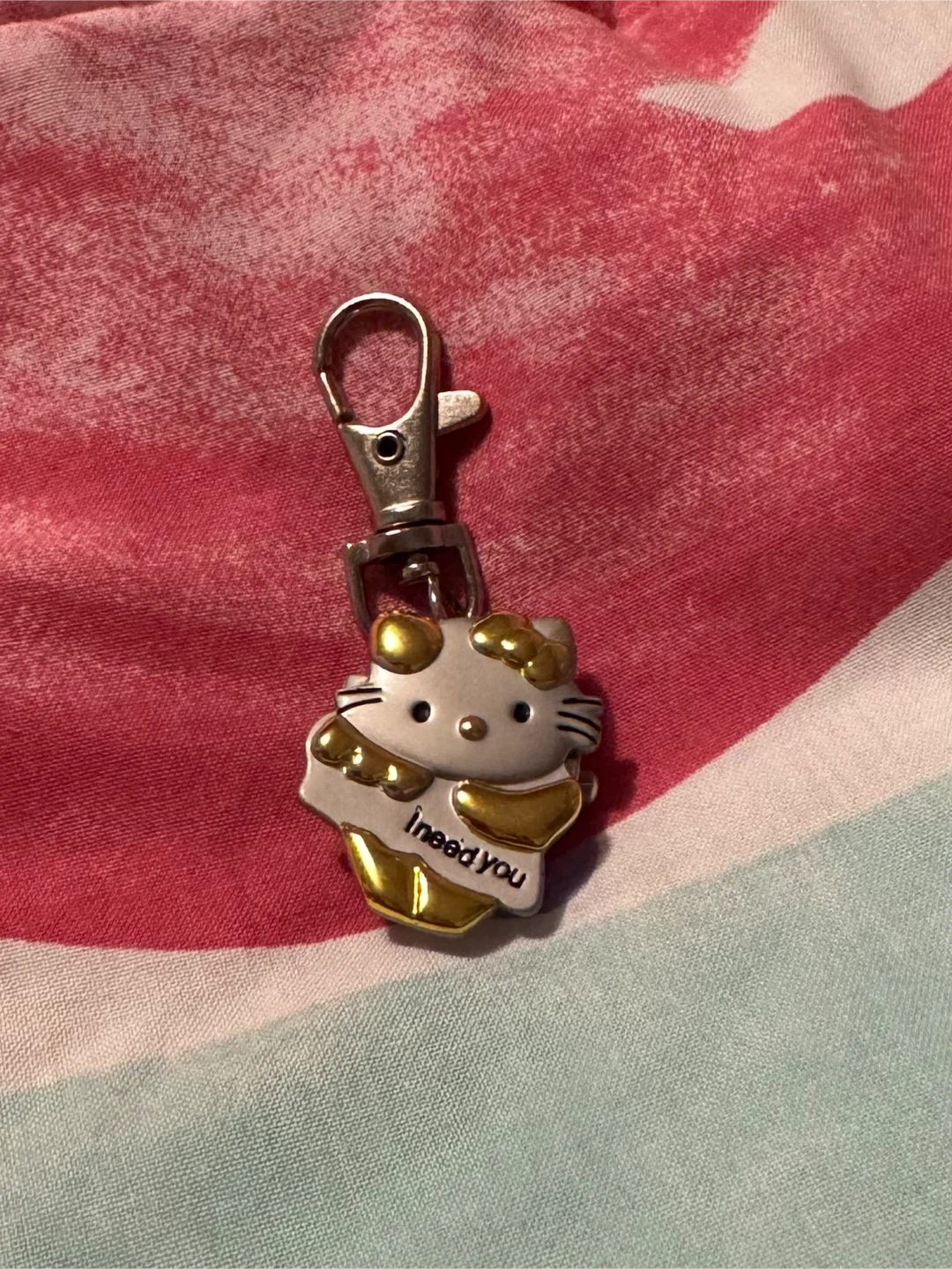 Selling a cute Hello Kitty keychain watch! It's a quartz watch with a stainless steel back. The keychain has a clip and says 'I need you'. It's in good condition and perfect for any Hello Kitty fan