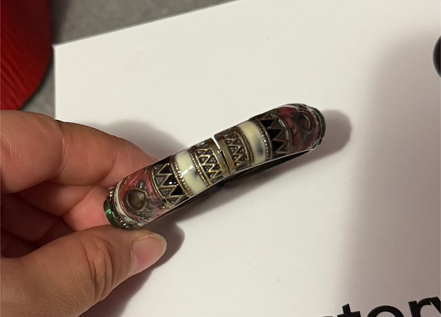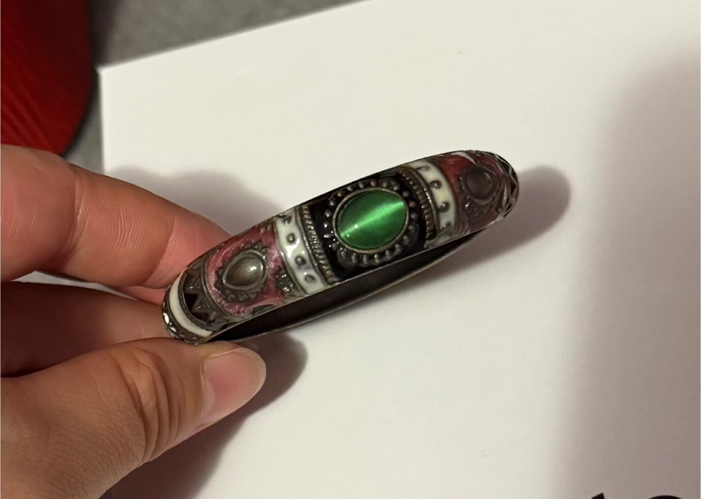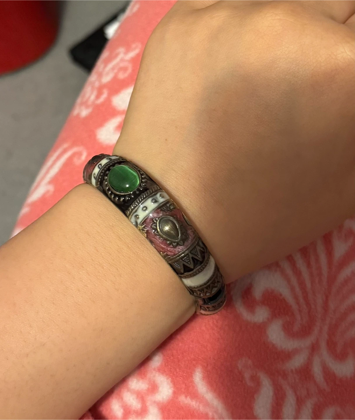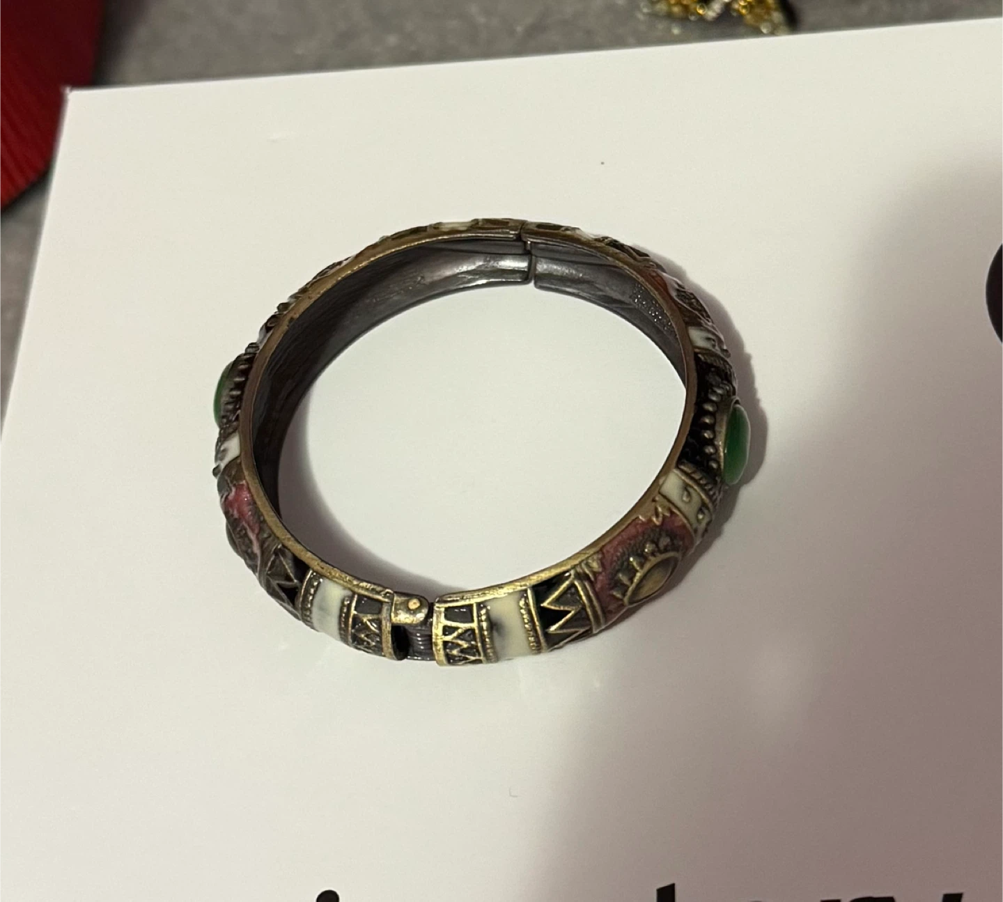 Selling a vintage-style bangle bracelet. It features a mix of colours and patterns with a green stone detail. It's in great condition and would make a lovely addition to any jewelry collection!