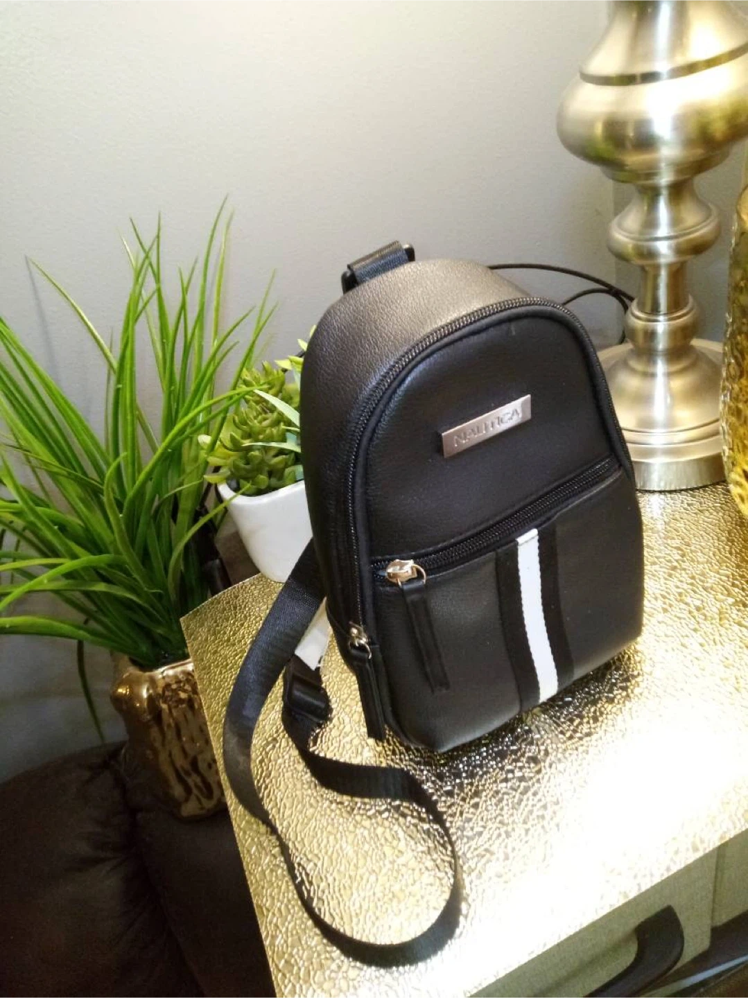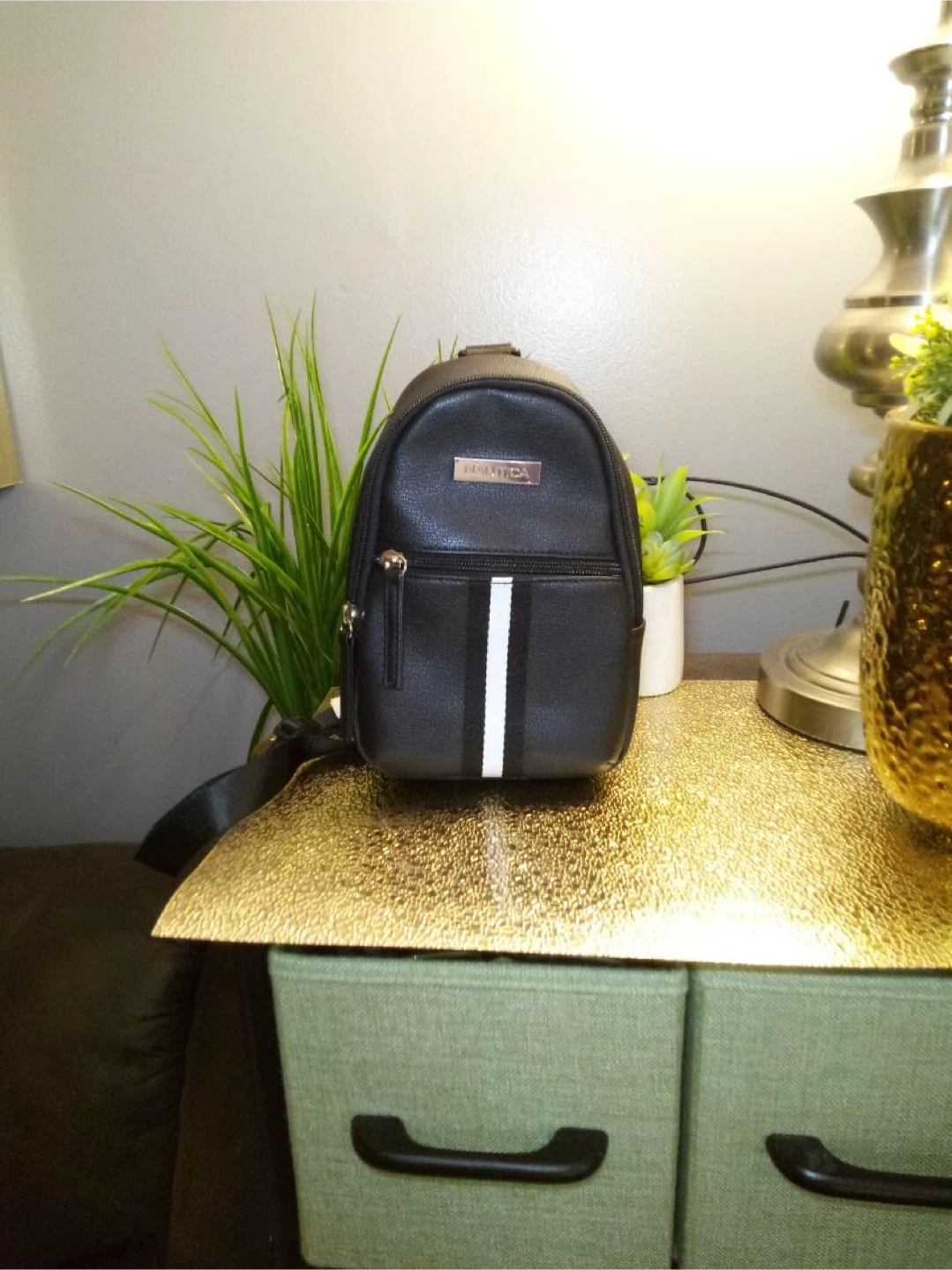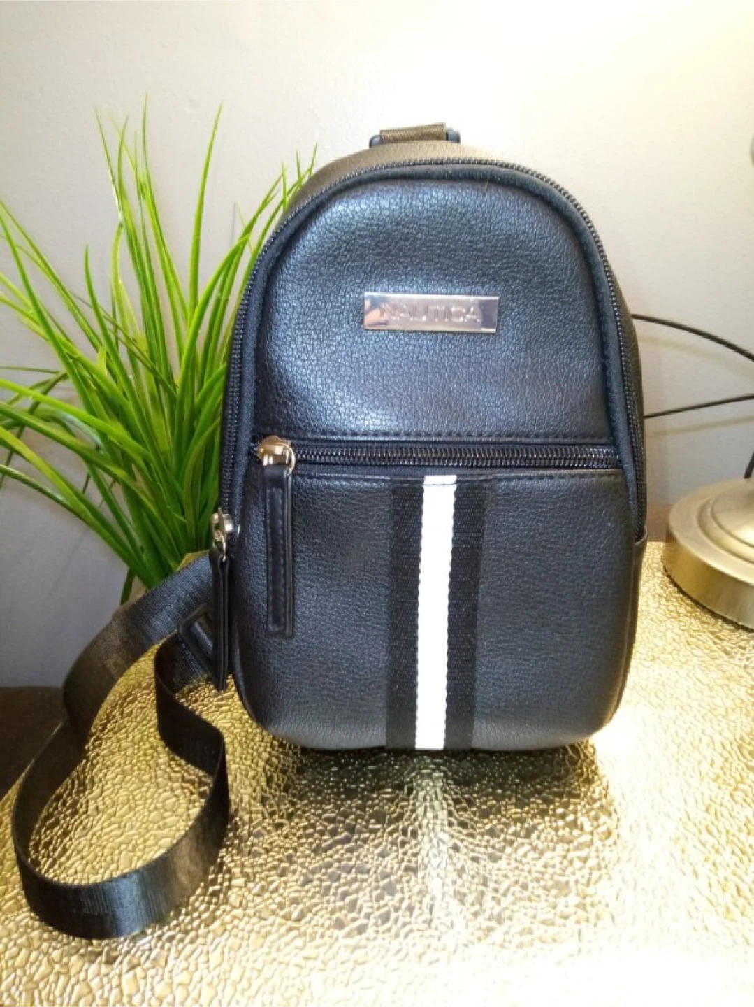 I'm selling a cute Nautica mini sling bag! It's black and perfect for carrying your essentials. The interior fabric of this product is made from 100% recycled plastic bottles
