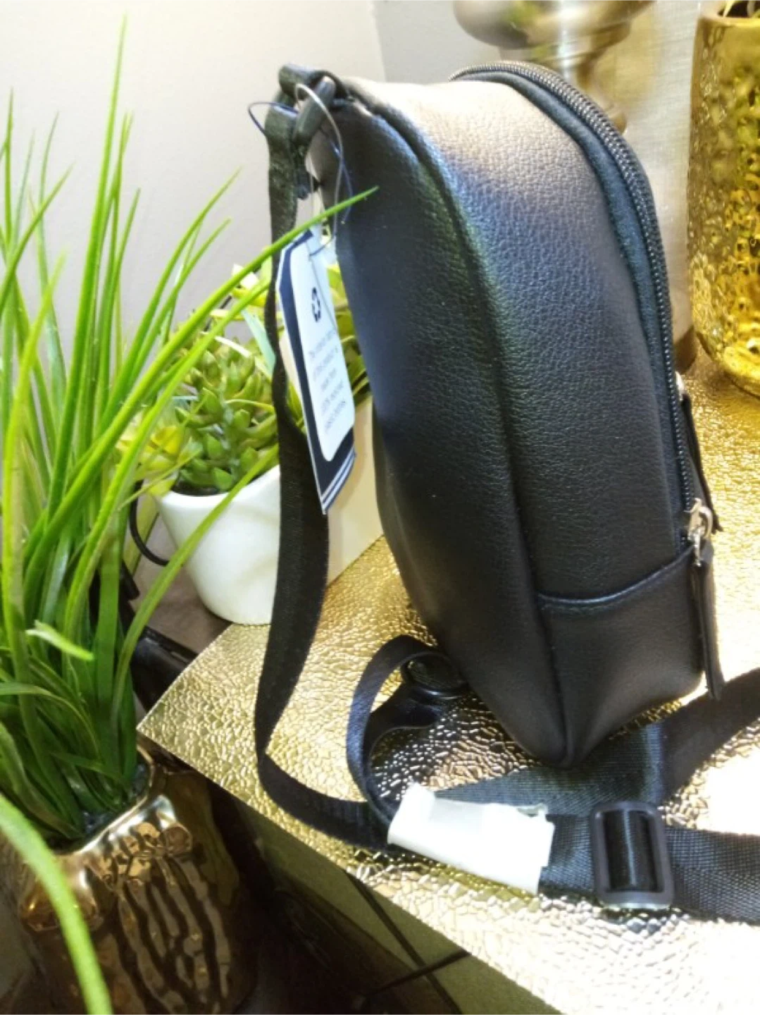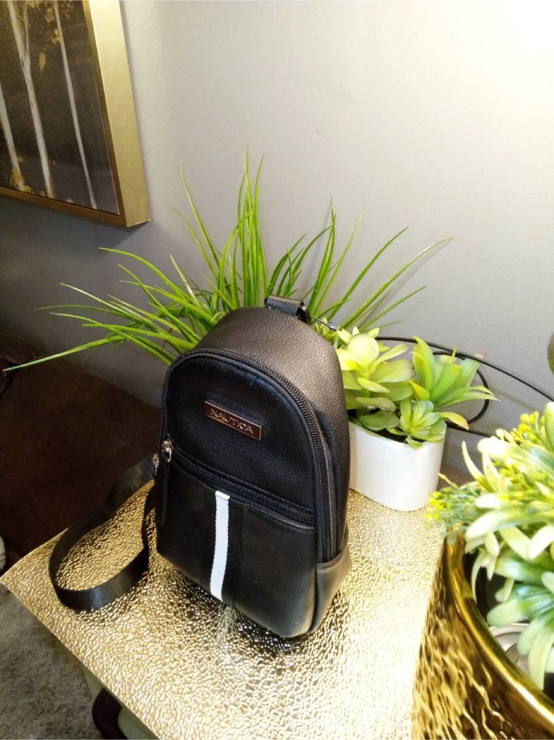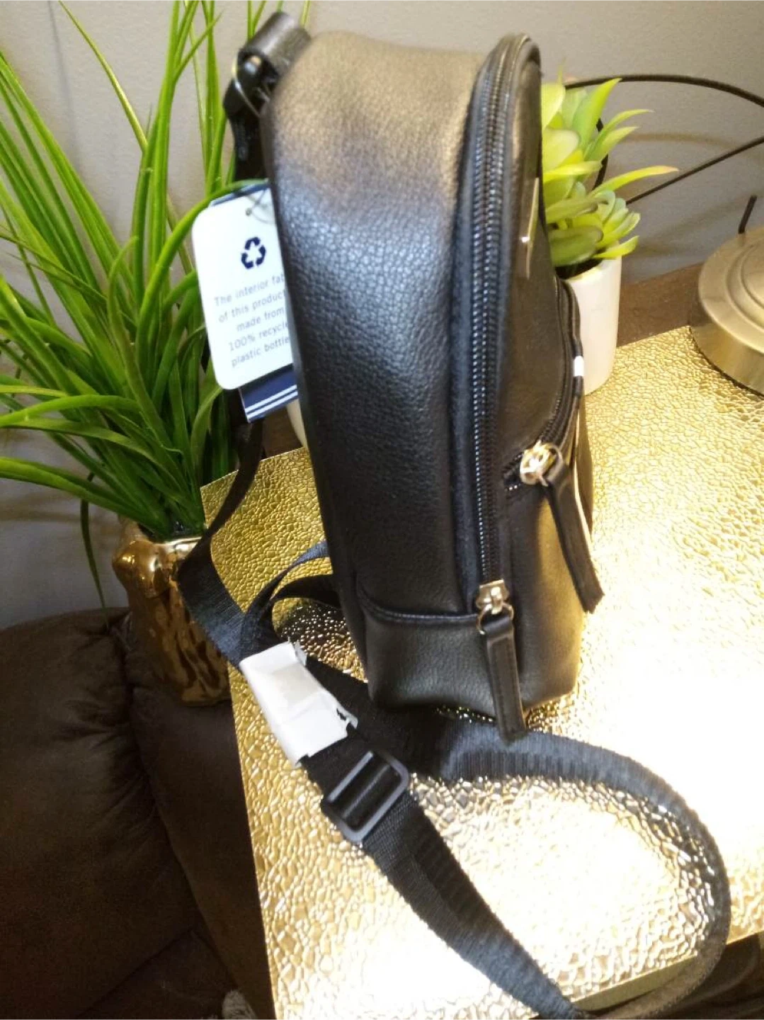 I'm selling a cute Nautica mini sling bag! It's black and perfect for carrying your essentials. The interior fabric of this product is made from 100% recycled plastic bottles