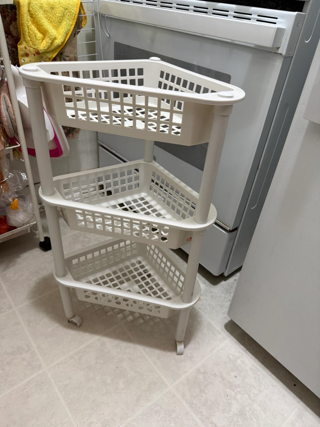 Here's a handy white, three-tier corner shelf! Perfect for adding some extra storage in a small space. It's in great condition and ready to use