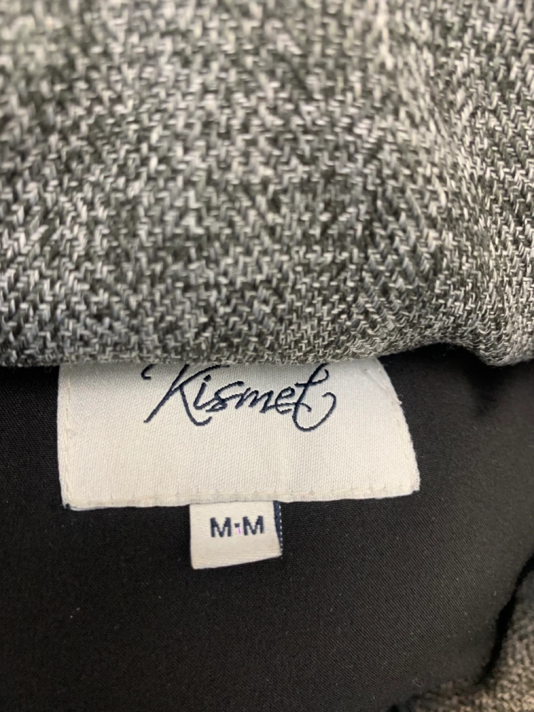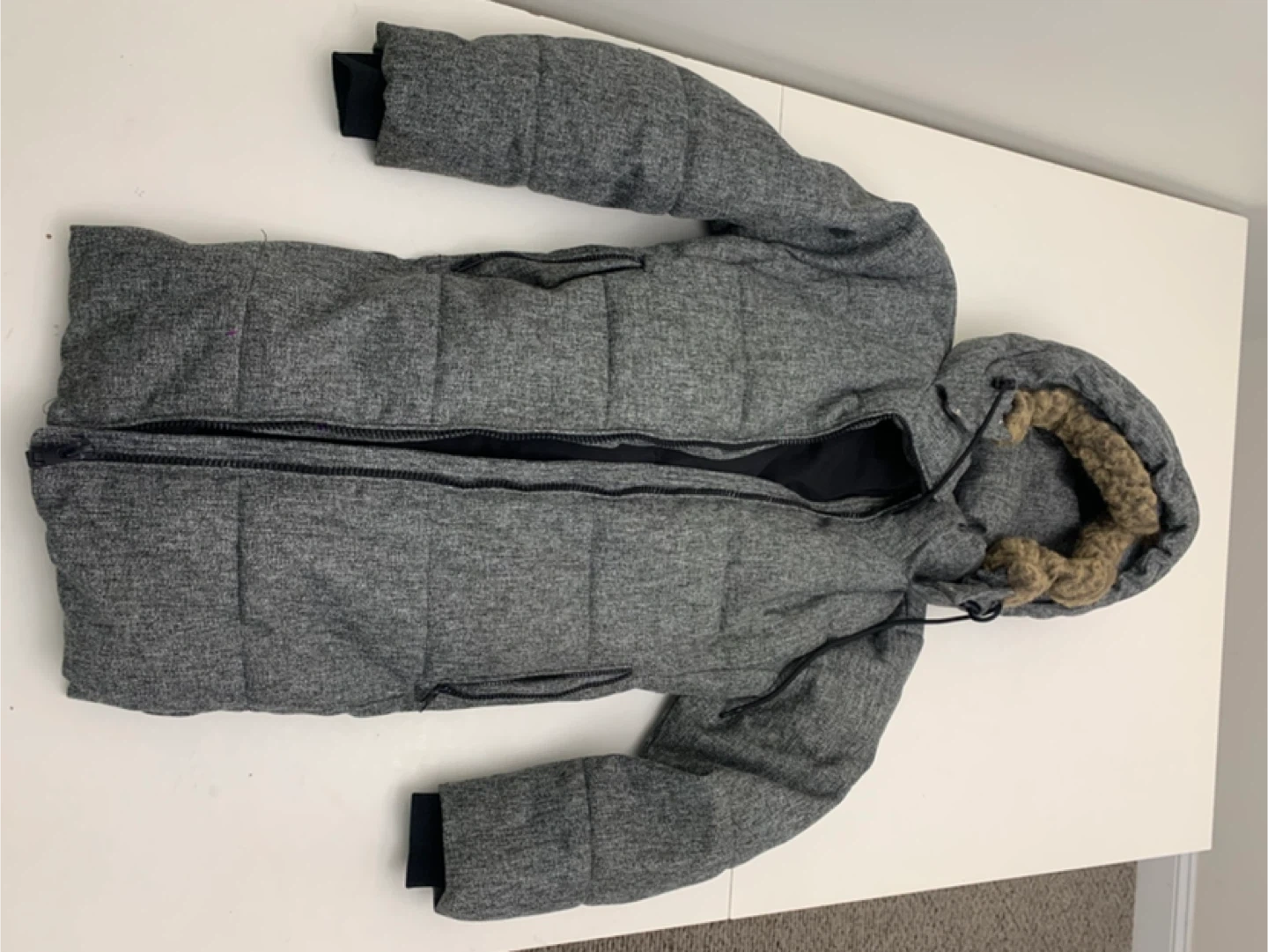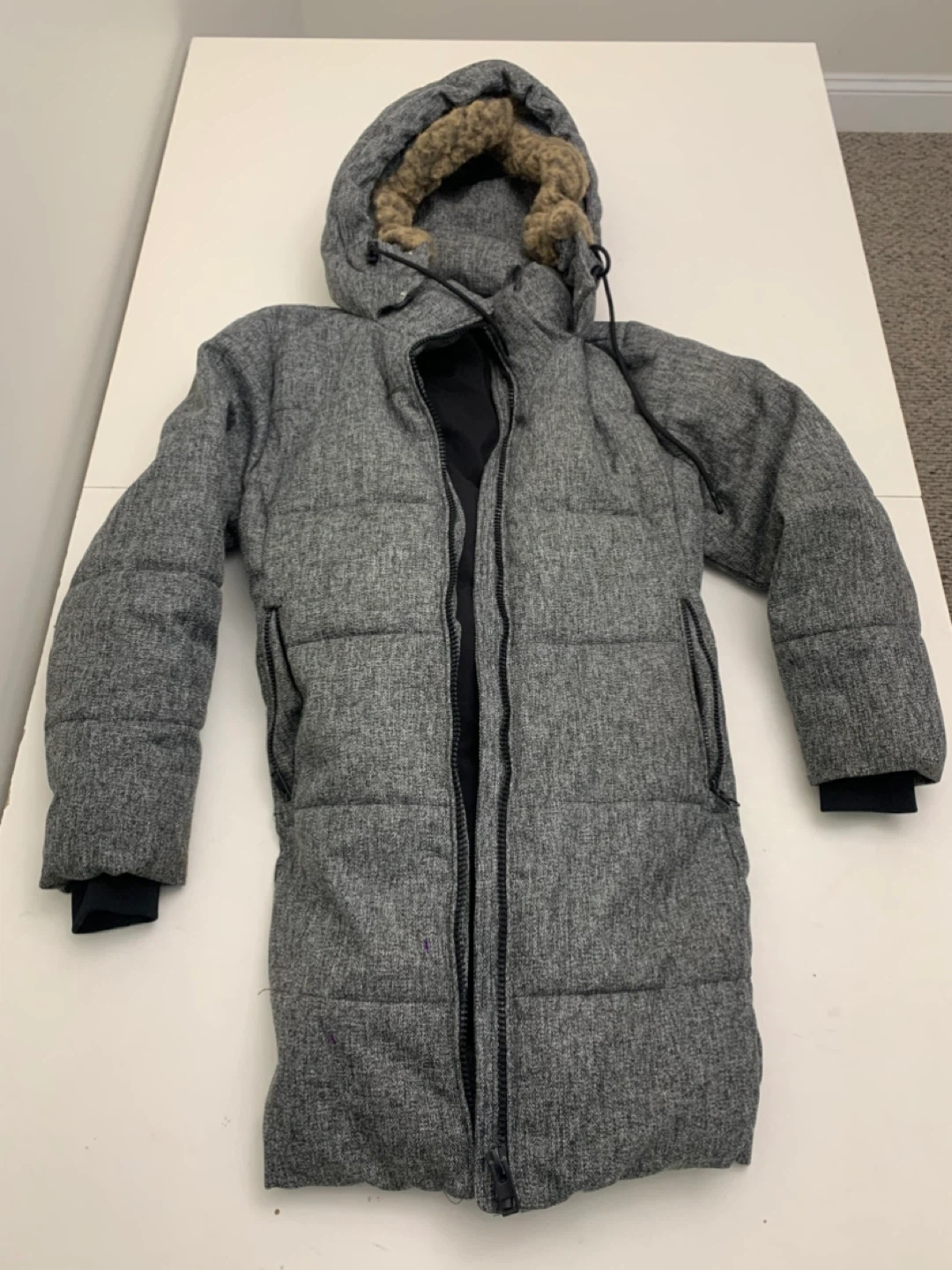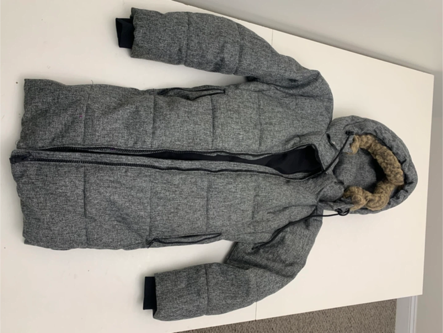 Here's a cozy Kismet puffer coat in a stylish grey colour! It's a size medium and has a faux fur trim on the hood. Perfect for staying warm during the colder months