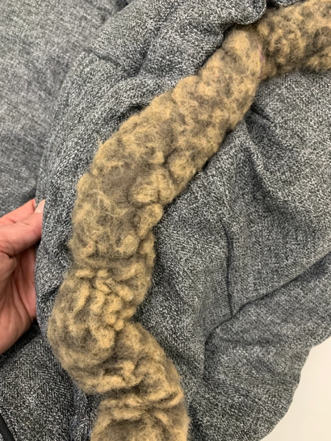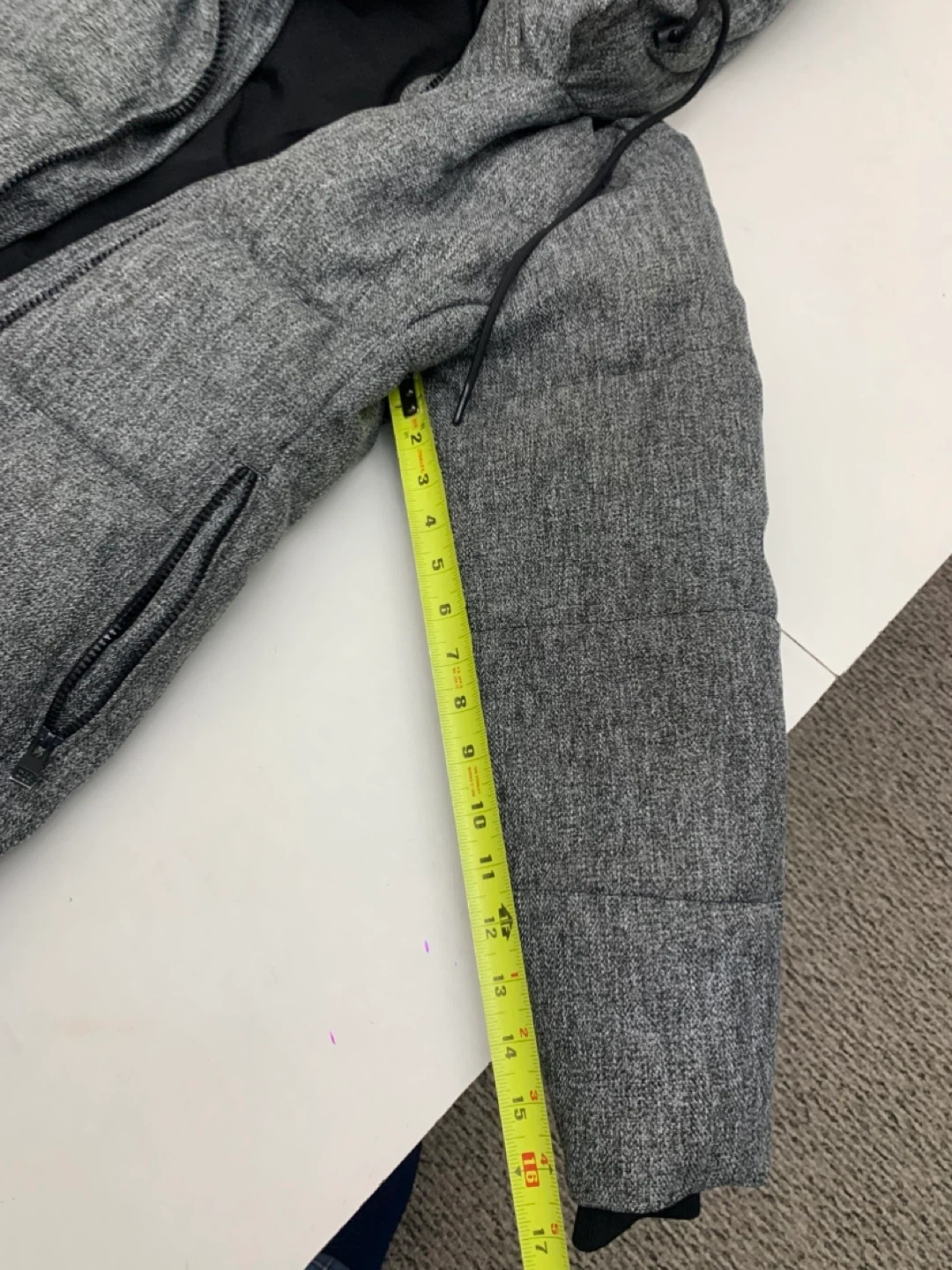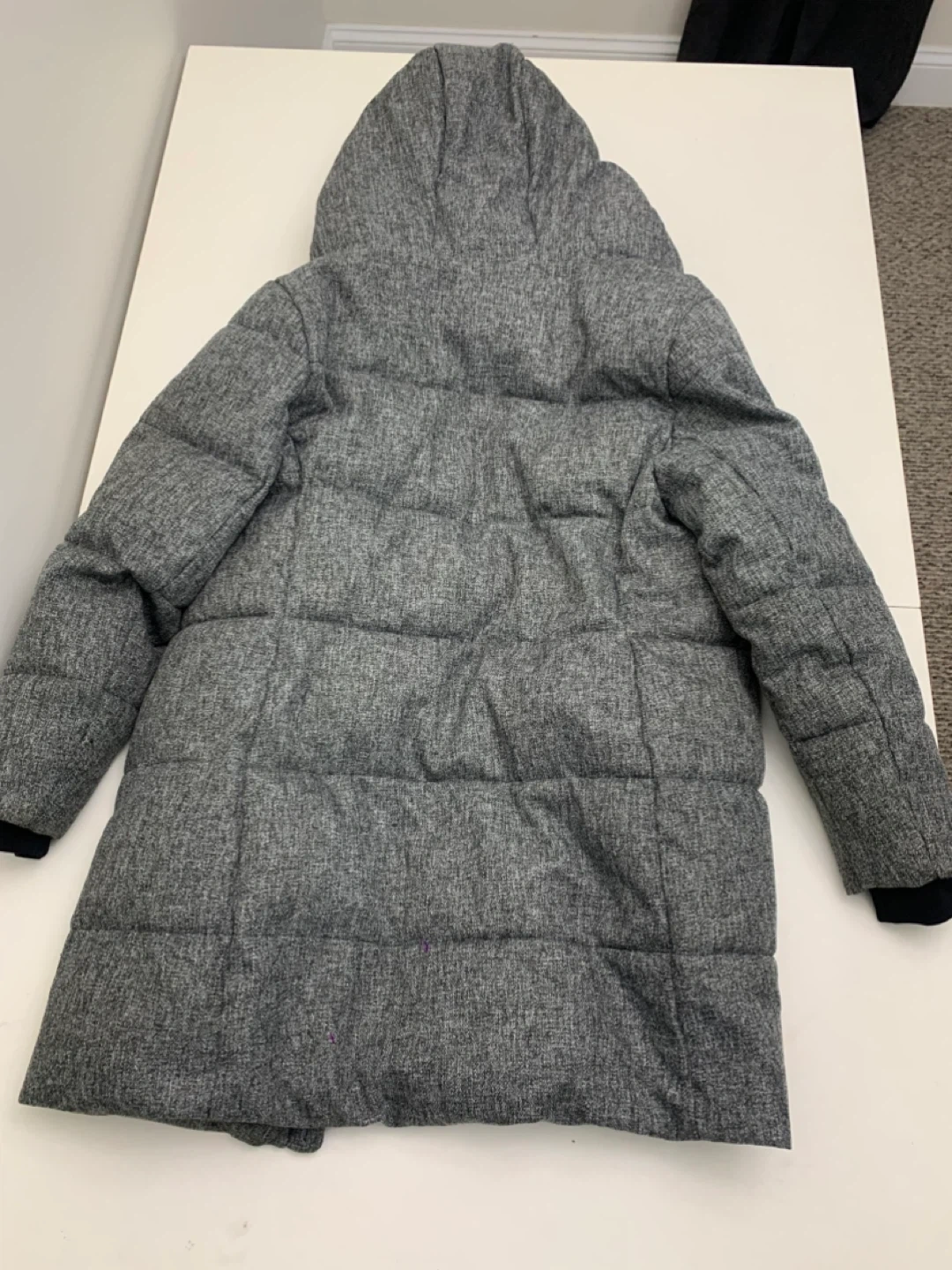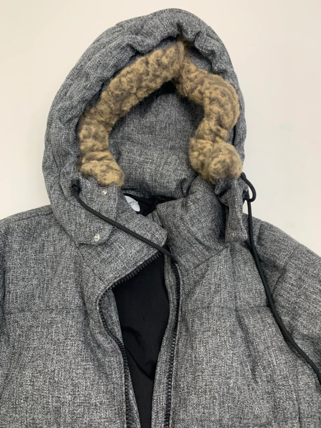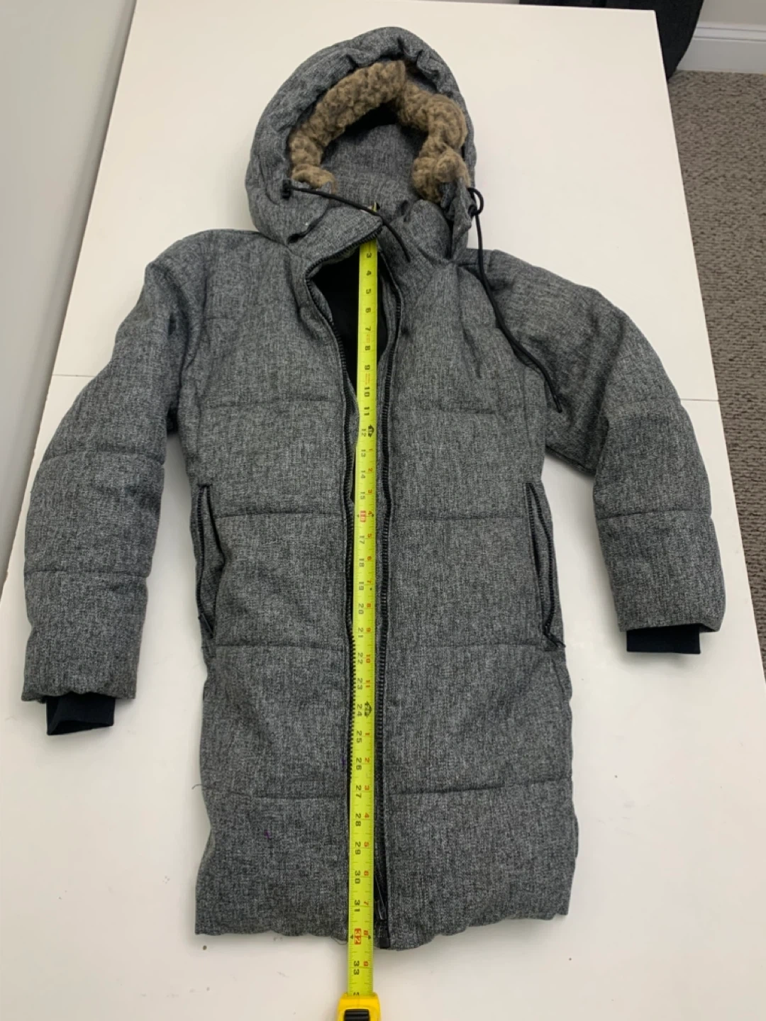 Here's a cozy Kismet puffer coat in a stylish grey colour! It's a size medium and has a faux fur trim on the hood. Perfect for staying warm during the colder months