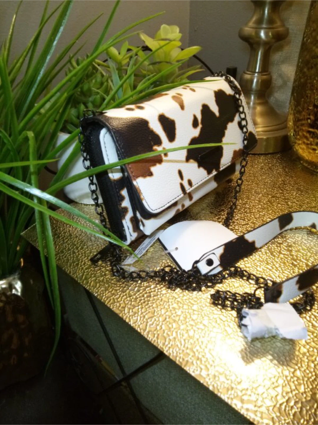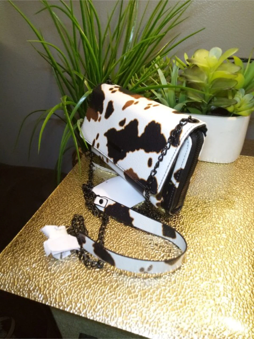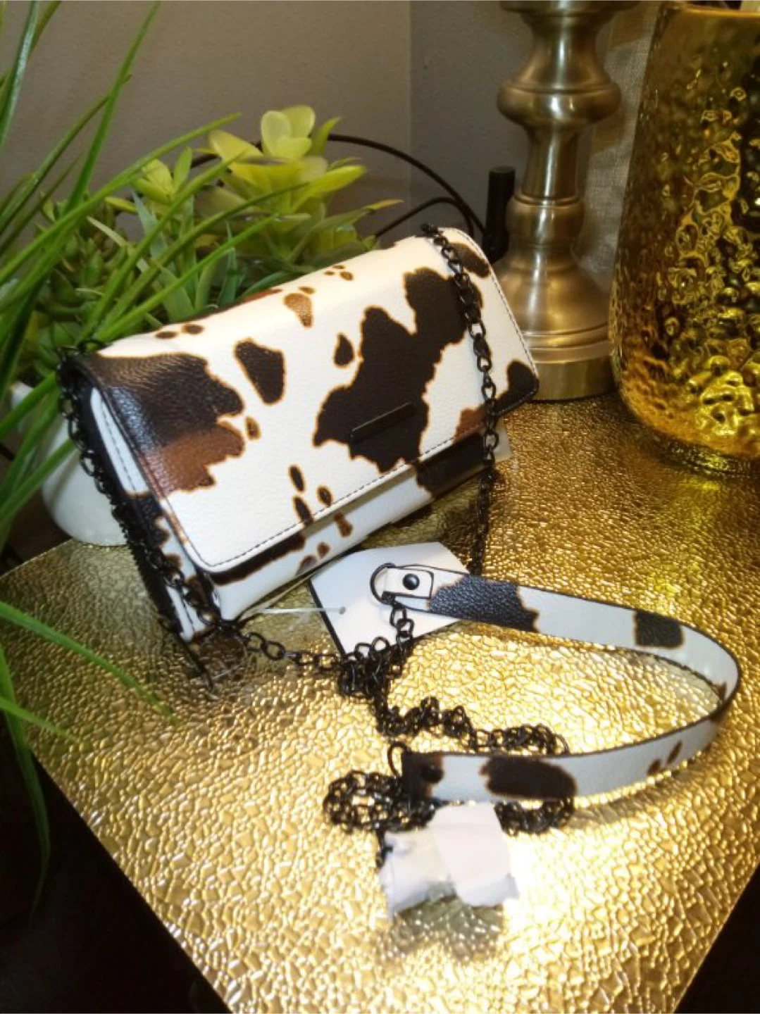 This crossbody bag features a fun cow print design! It has a chain strap and a wrist strap. Perfect for adding a unique touch to your outfit!