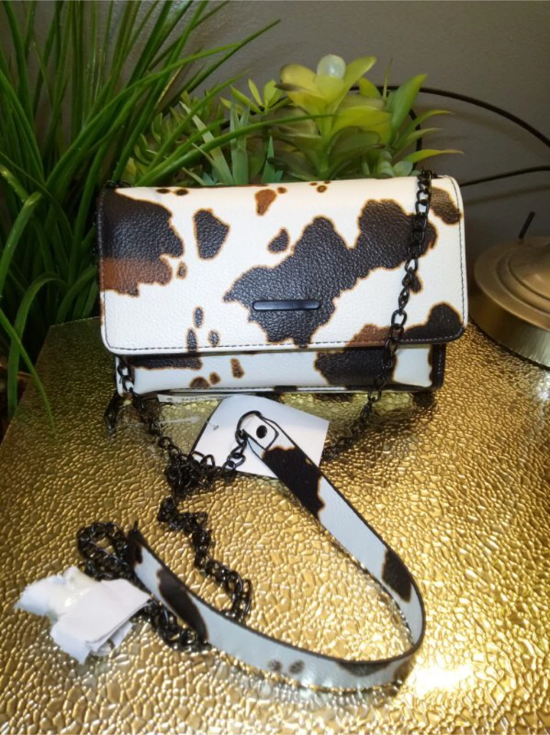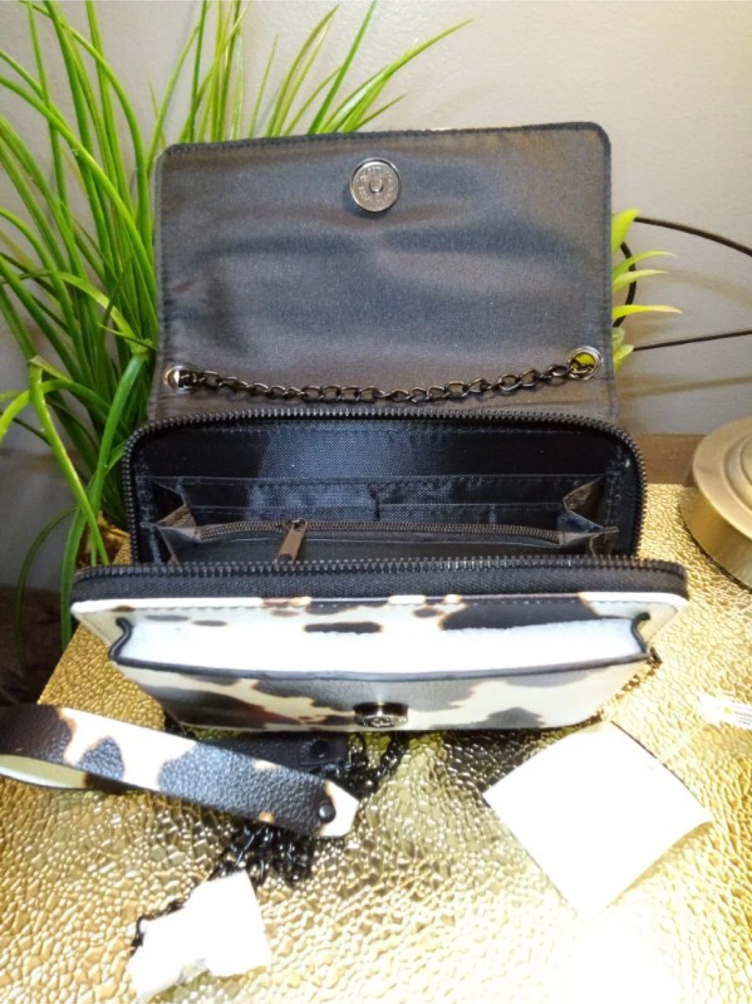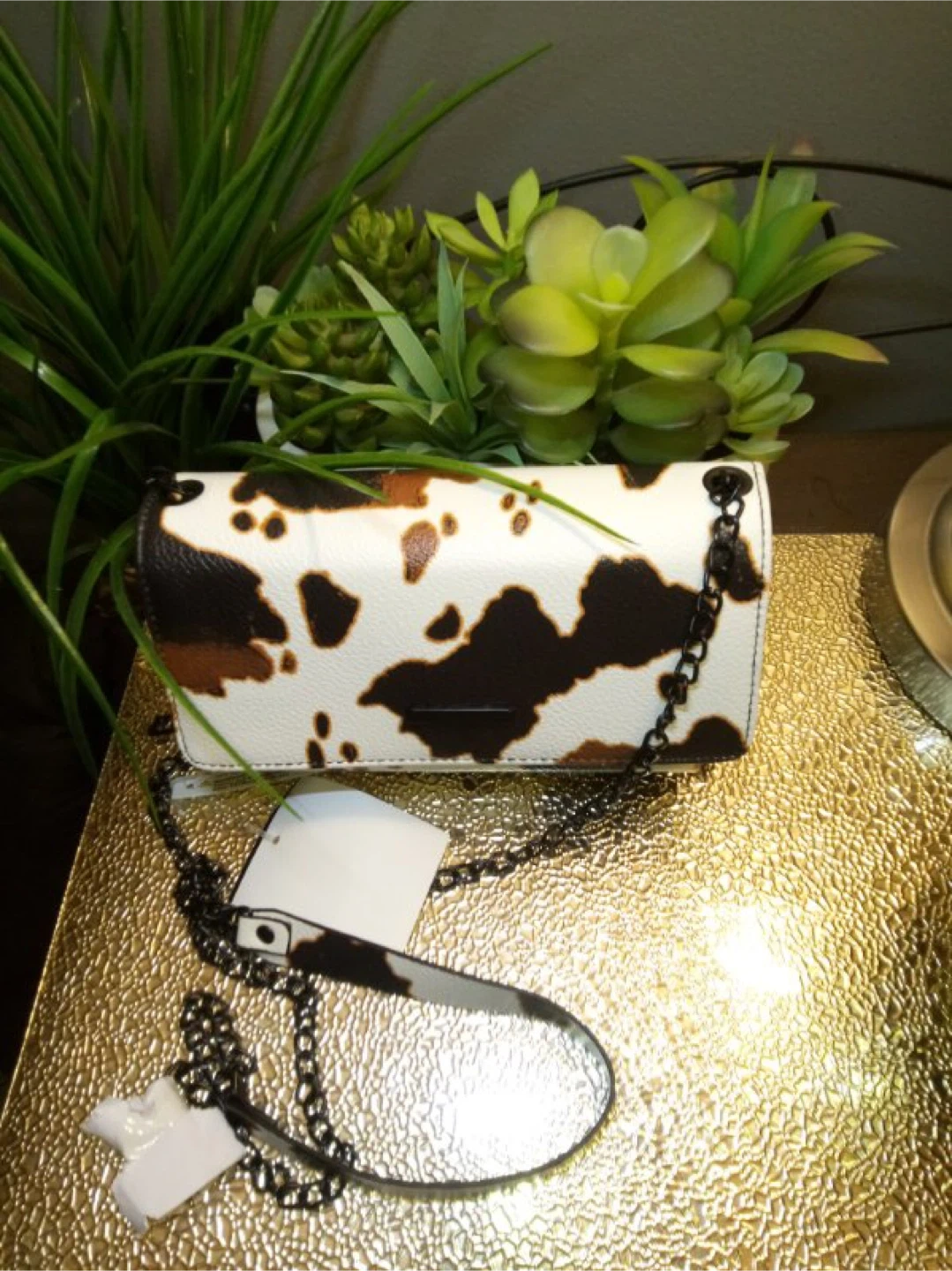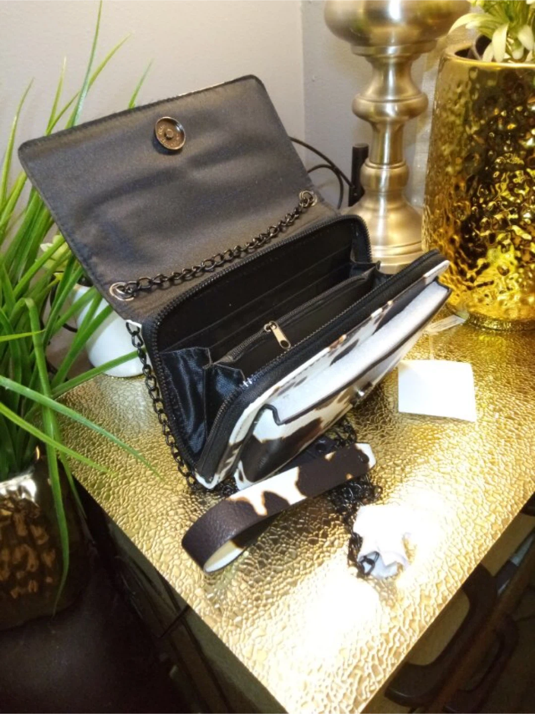 This crossbody bag features a fun cow print design! It has a chain strap and a wrist strap. Perfect for adding a unique touch to your outfit!