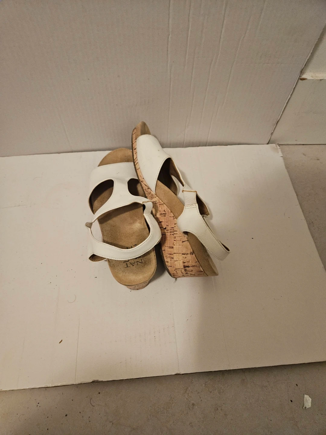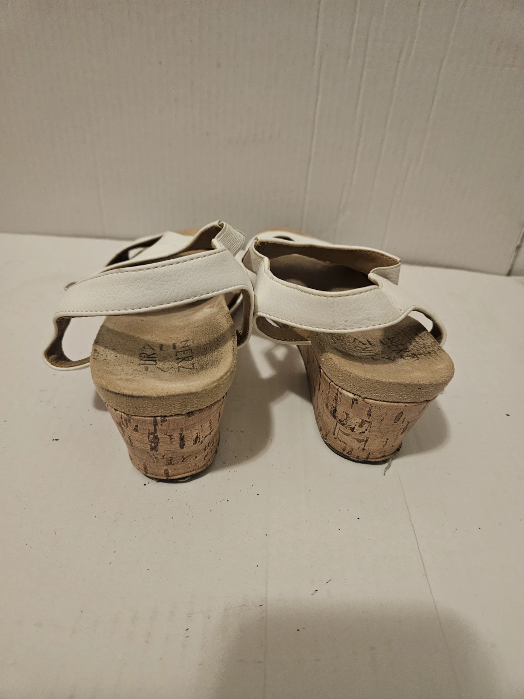 Selling a pair of Naturalizer white wedge sandals in US size 7.5. They're in gently used condition and still have lots of life left! Perfect for a casual summer look. It have small elastic on both sides.