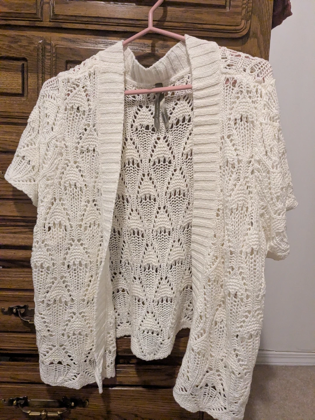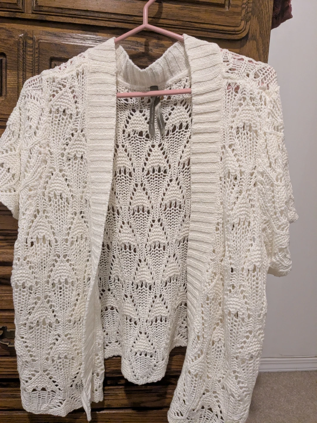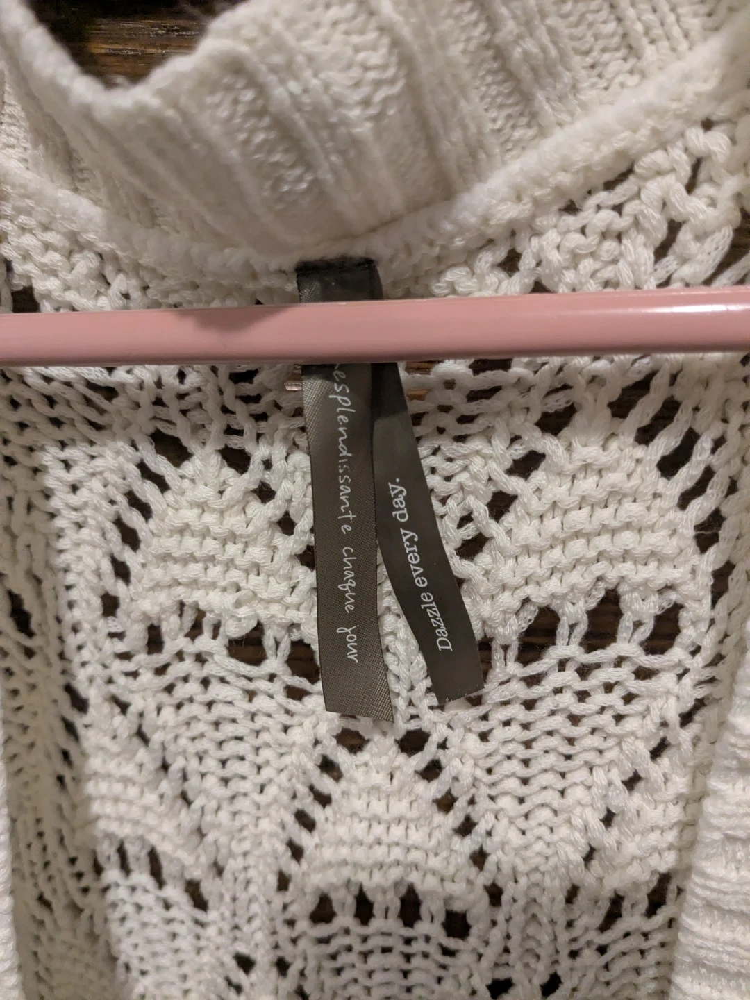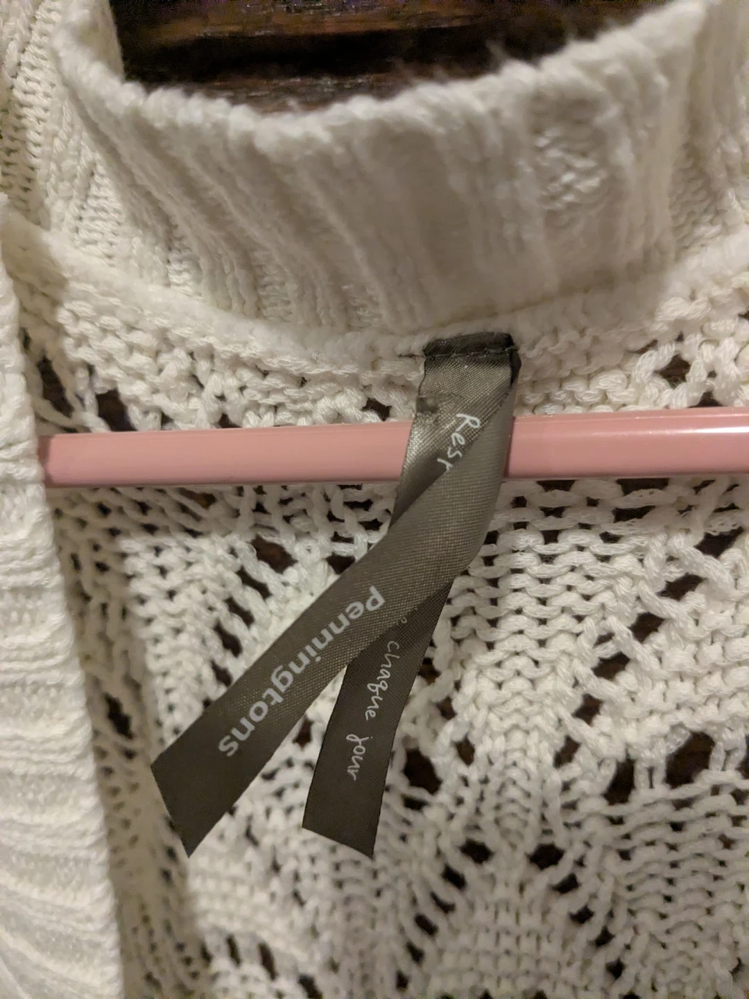A lovely white knit cardigan from Penningtons! It's in great condition and ready to add a touch of cozy elegance to your wardrobe. Perfect for layering on those cool evenings or adding a stylish touch to any outfit