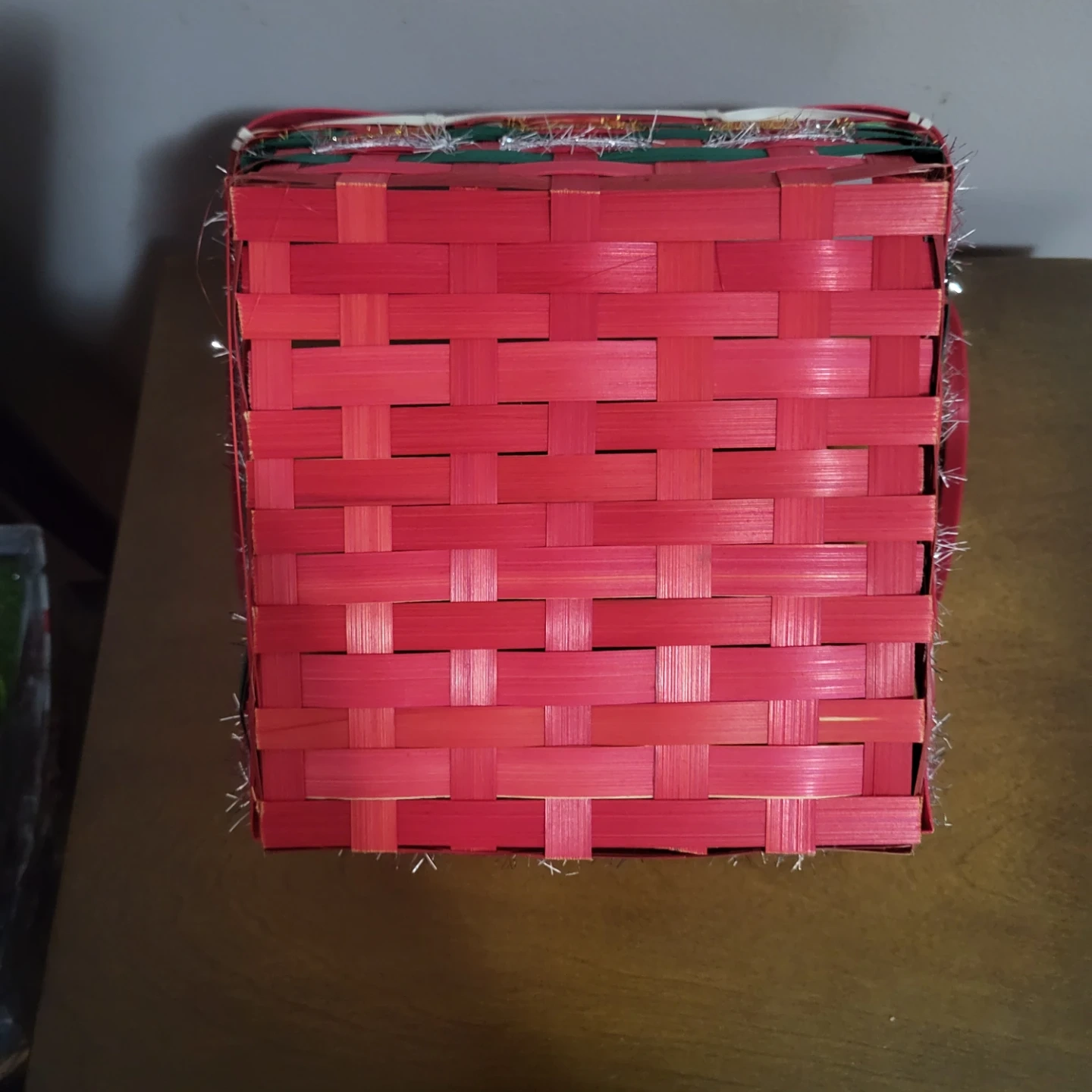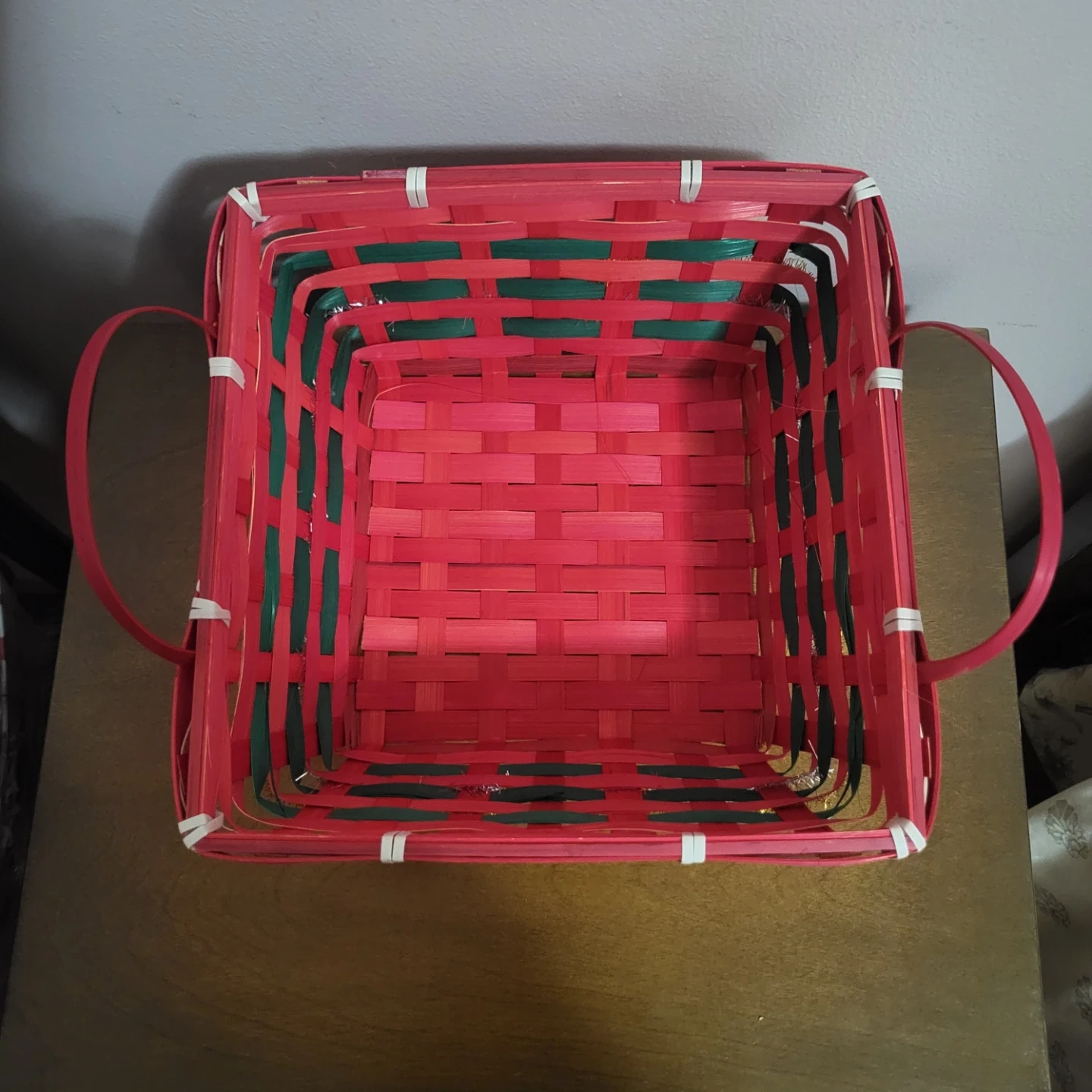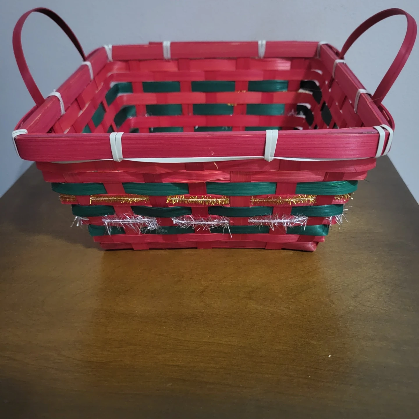 Here's a cute red woven basket! It's got a square shape and handy handles on the sides. The weave pattern has some green and gold accents, making it a festive piece for storage or decor