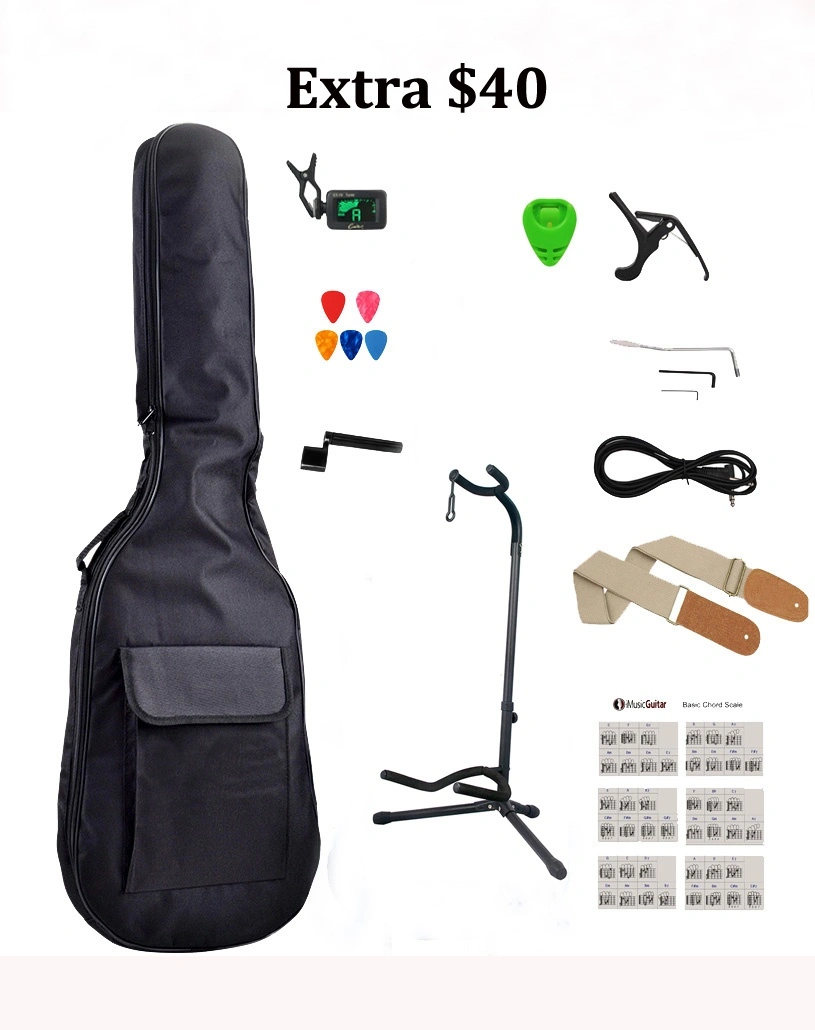 Extra $40: 5 mm padded gig bag, Guitar stand, Adjustable strap, Instrument cable, Clip-on tuner, 5 picks, Basic chord scale, string winder, extra string set, Tremolo arm, and wrenches.