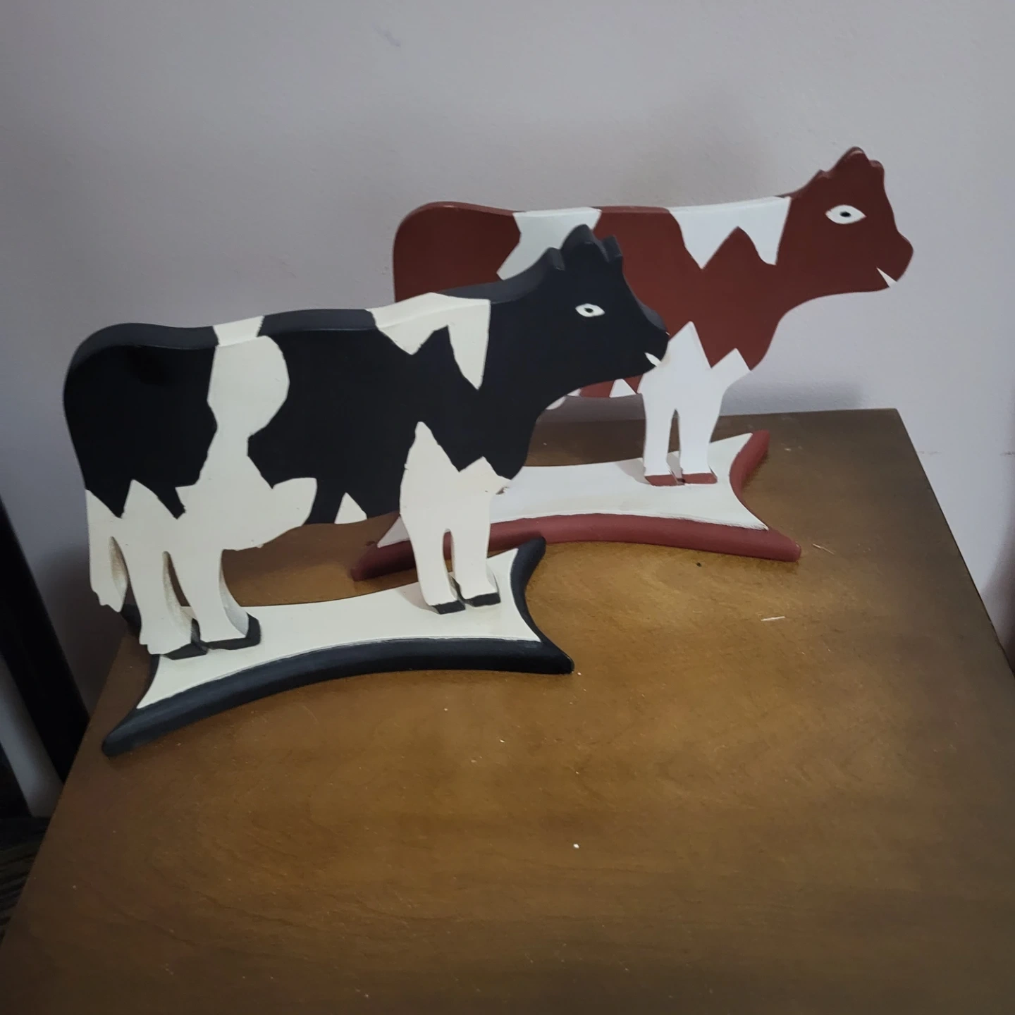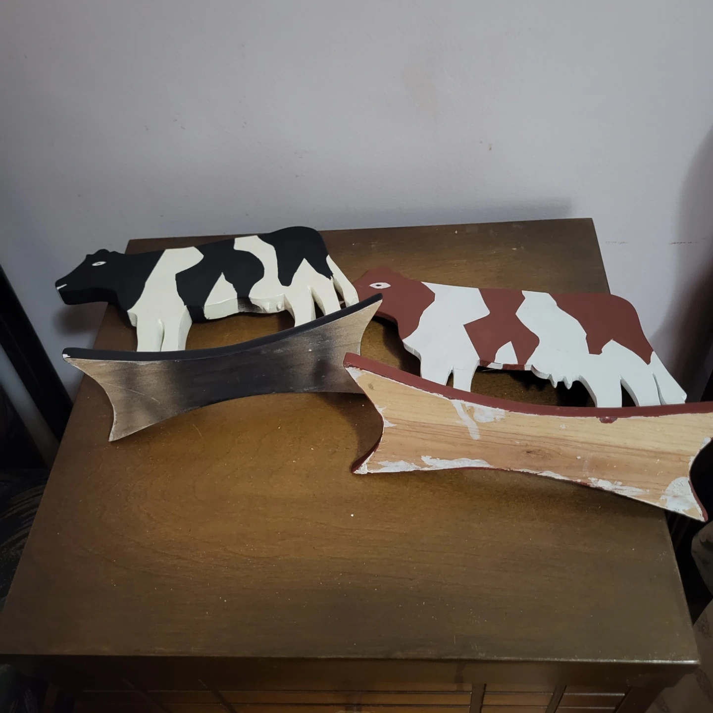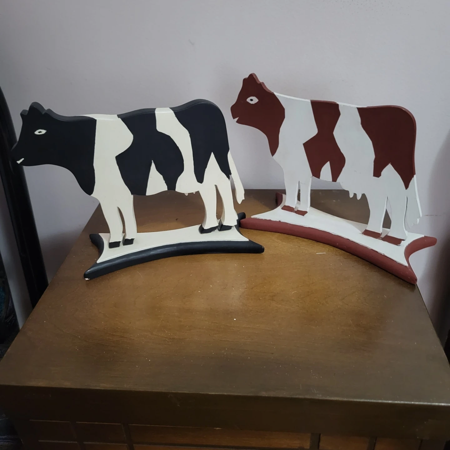 Selling two cute wooden cow decorations! One is black and white, and the other is brown and white. They would look great on a shelf or mantle!