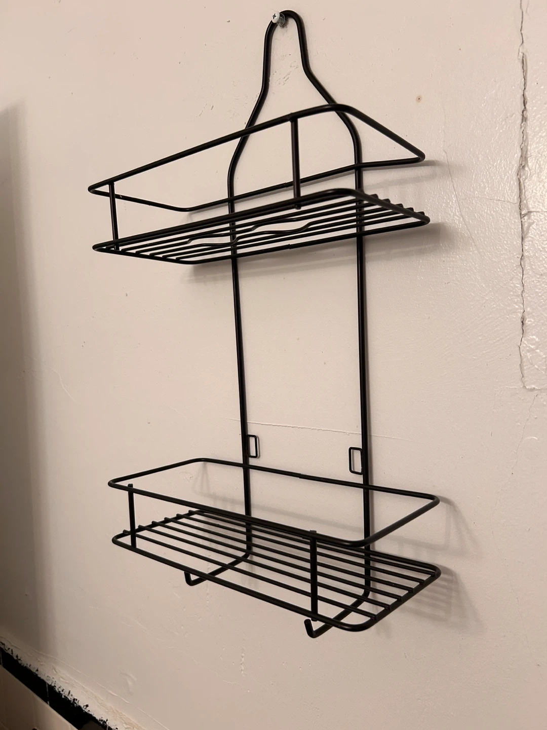 Here's a handy black metal bathroom shelf! It's in great shape and ready to organize your space. It measures approximately 19” in height and 10” width. Perfect for adding some extra storage in your bathroom or any other room!