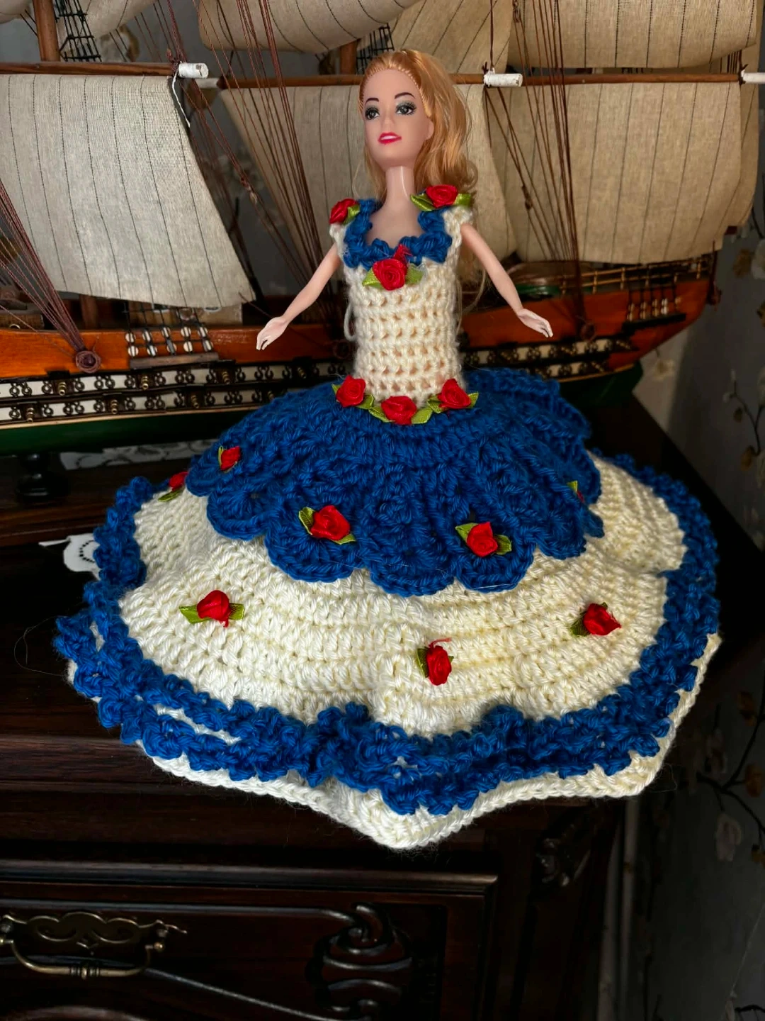Selling a charming, handmade crocheted dress for a doll! It features a beautiful blue and white design with delicate red rose accents. This unique piece would be a lovely addition to any doll collection or a special gift for a doll enthusiast