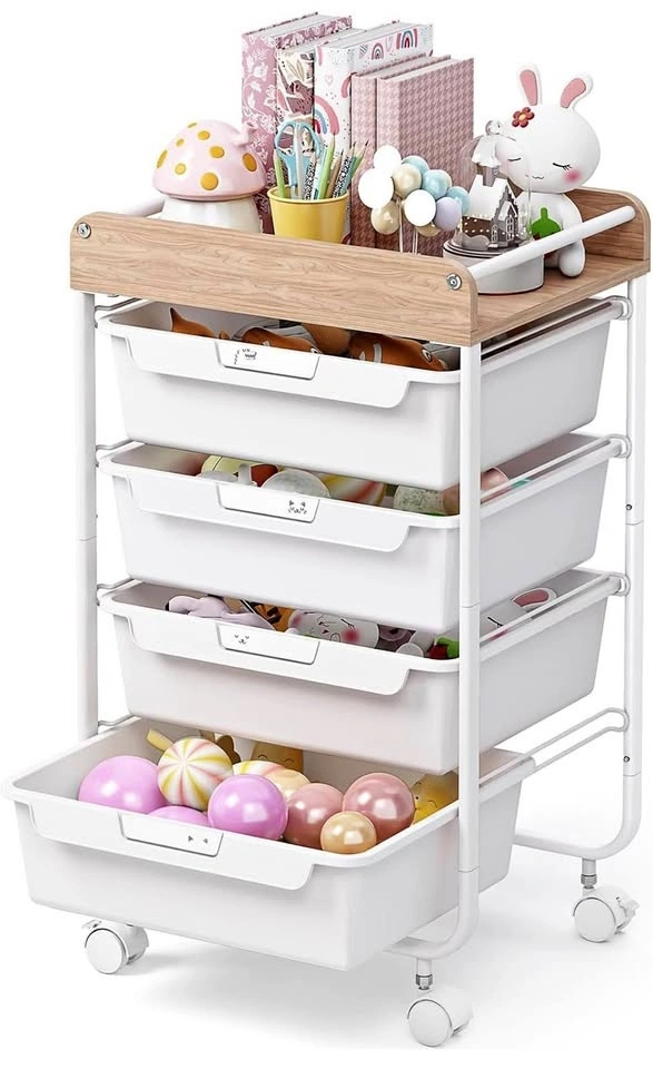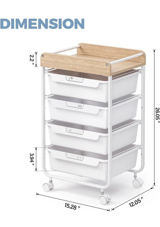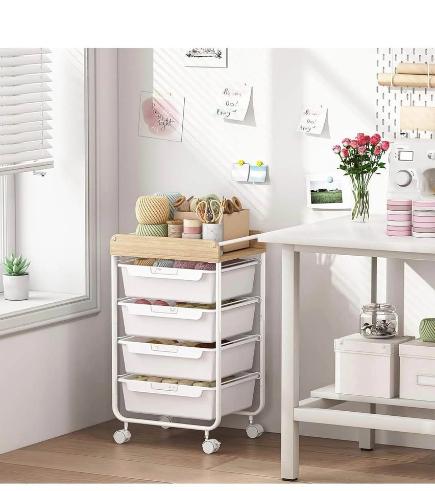 4 Drawer Rolling Utility Cart with Wooden Top and Handle, Craft Storage Cart with Lockable Wheels, Multi-Purpose Organizer Drawer Cart for Home Office Bedroom Classroom,White