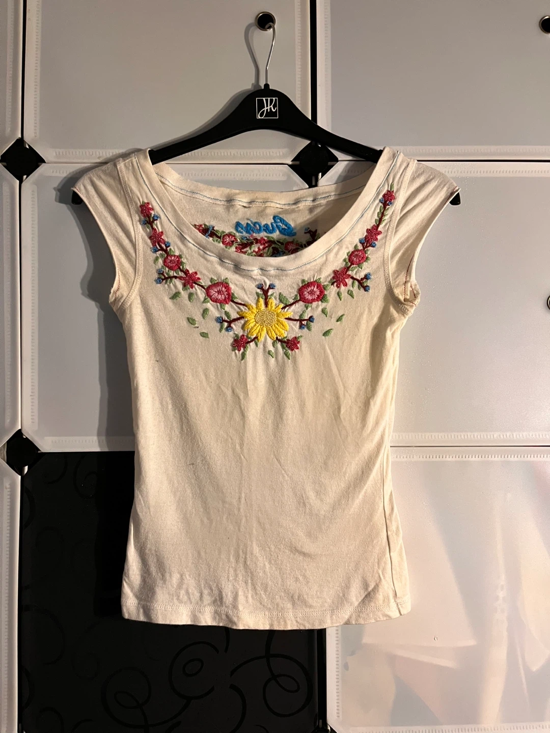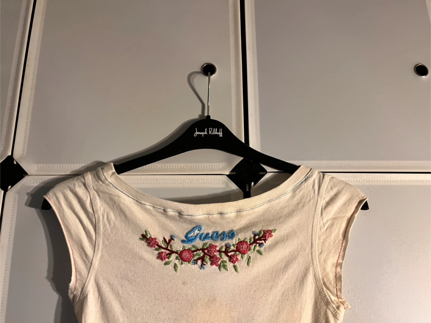 Cute Guess top with floral embroidery! It's a cream colour and in great condition. Perfect for spring or summer