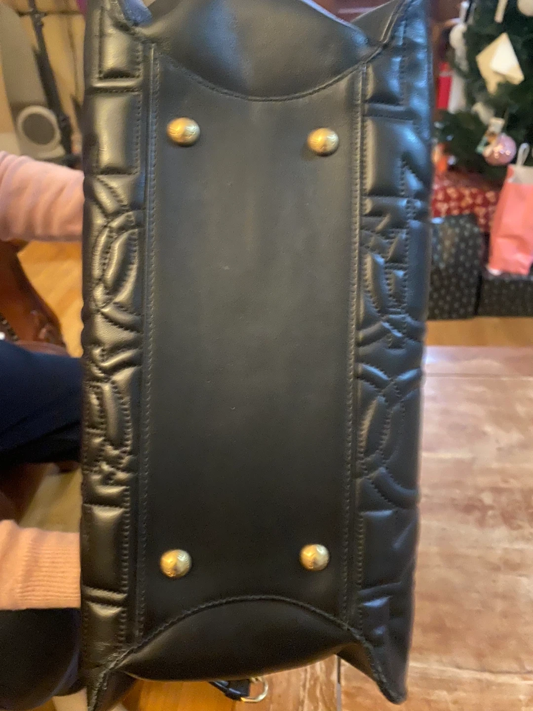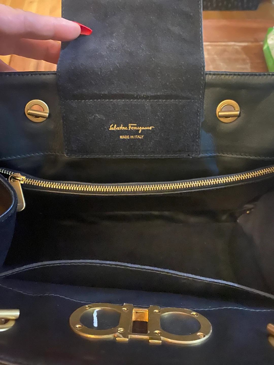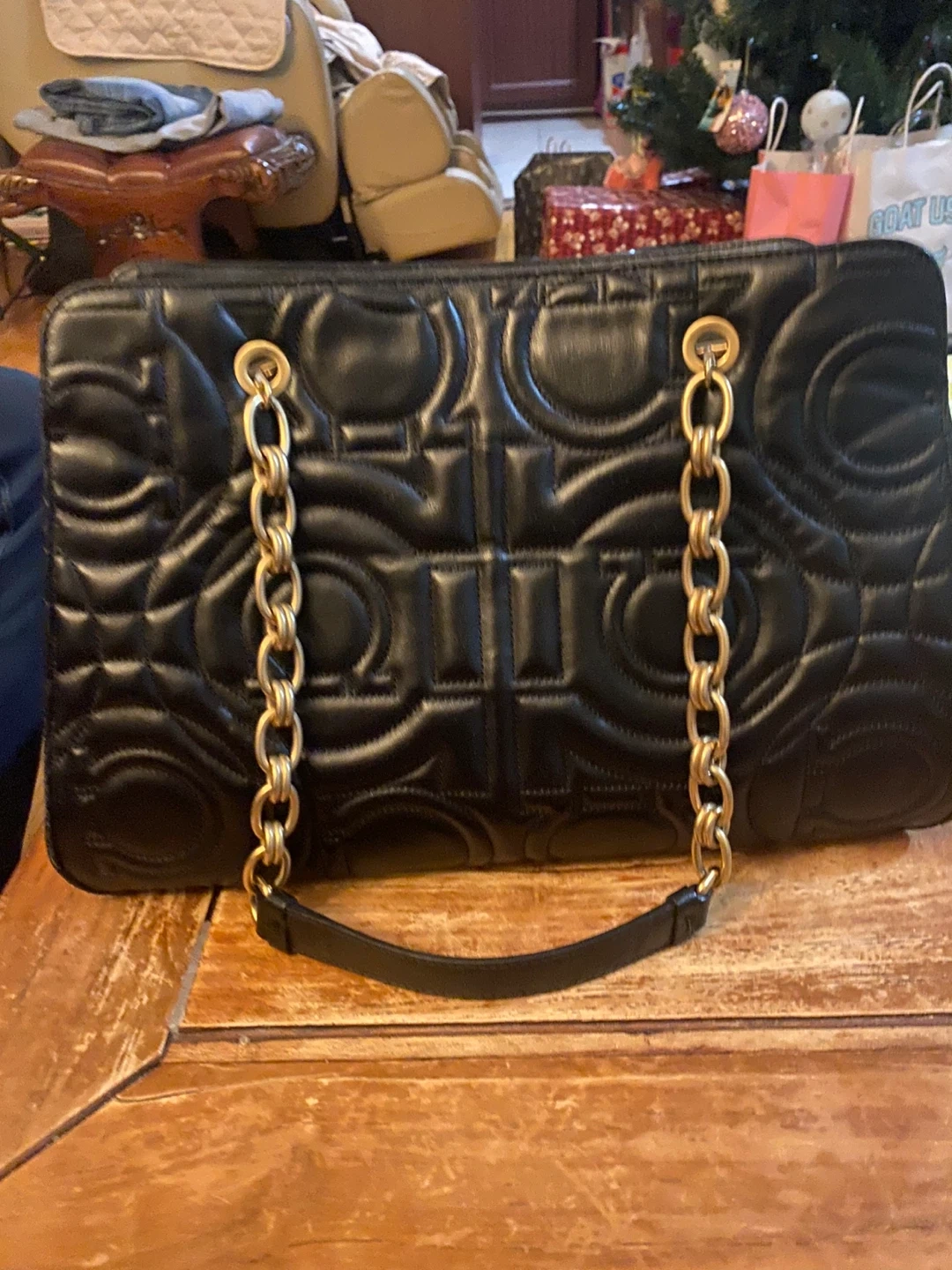 Here's a chic Salvatore Ferragamo tote bag in black leather. It features a quilted design with the iconic Ferragamo logo pattern and gold-tone chain accents. The interior is lined and includes a zipper pocket. Perfect for adding a touch of luxury to your everyday style!