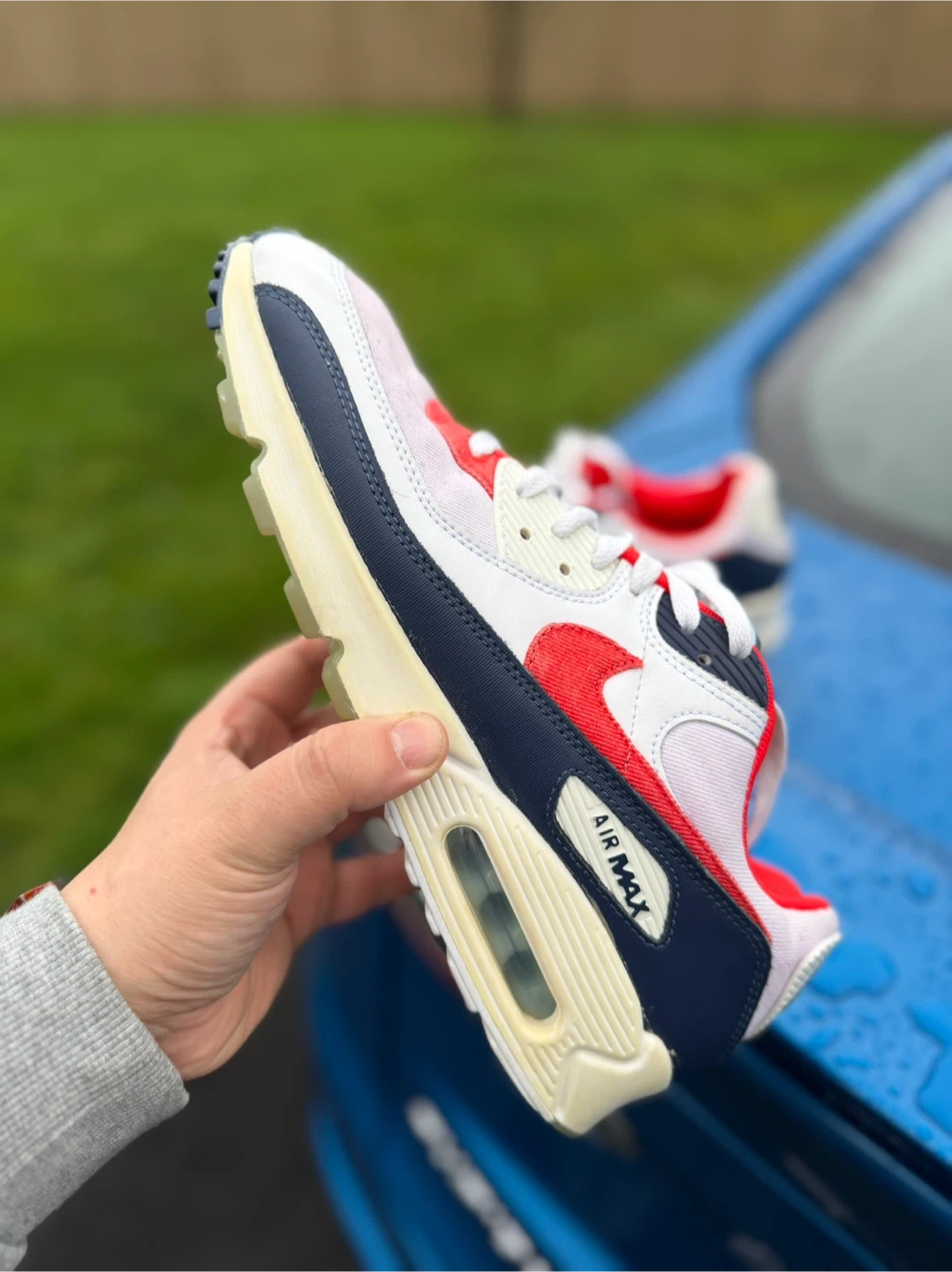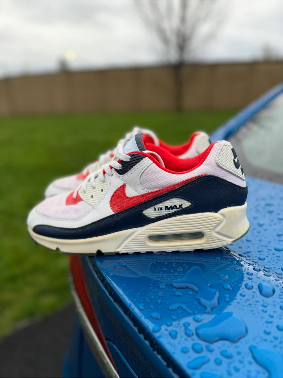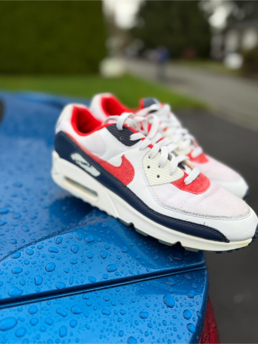 Selling a pair of Nike Air Max 90s! They feature a classic design with a mix of white, red, and navy colours. The shoes are in good condition, perfect for casual wear or workouts. Check out the photos for a closer look!