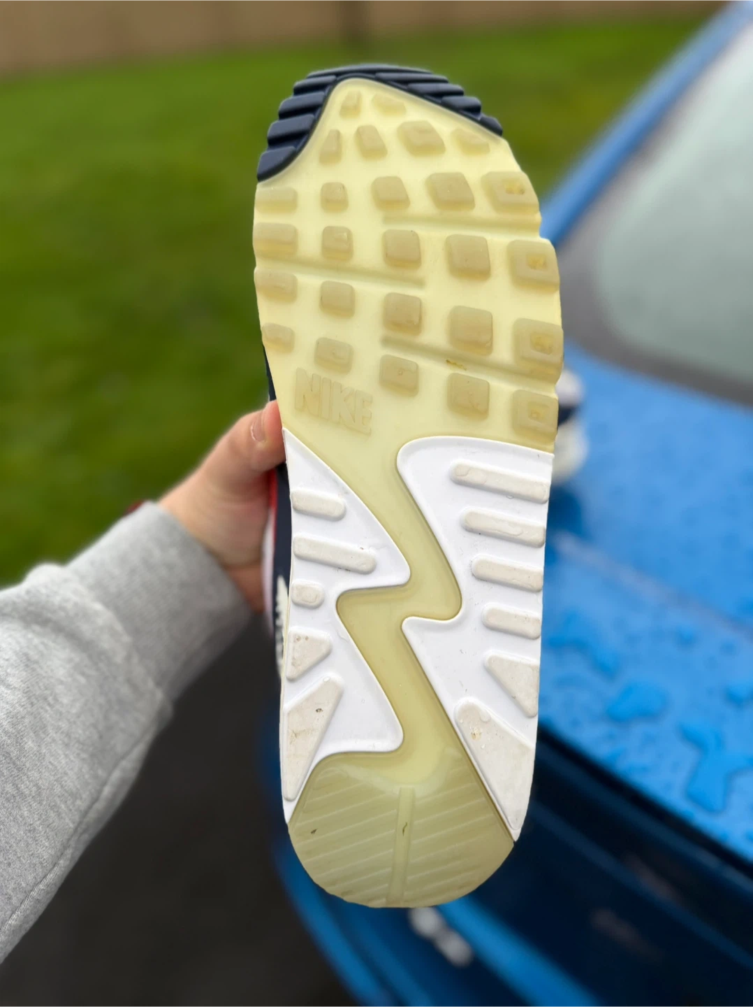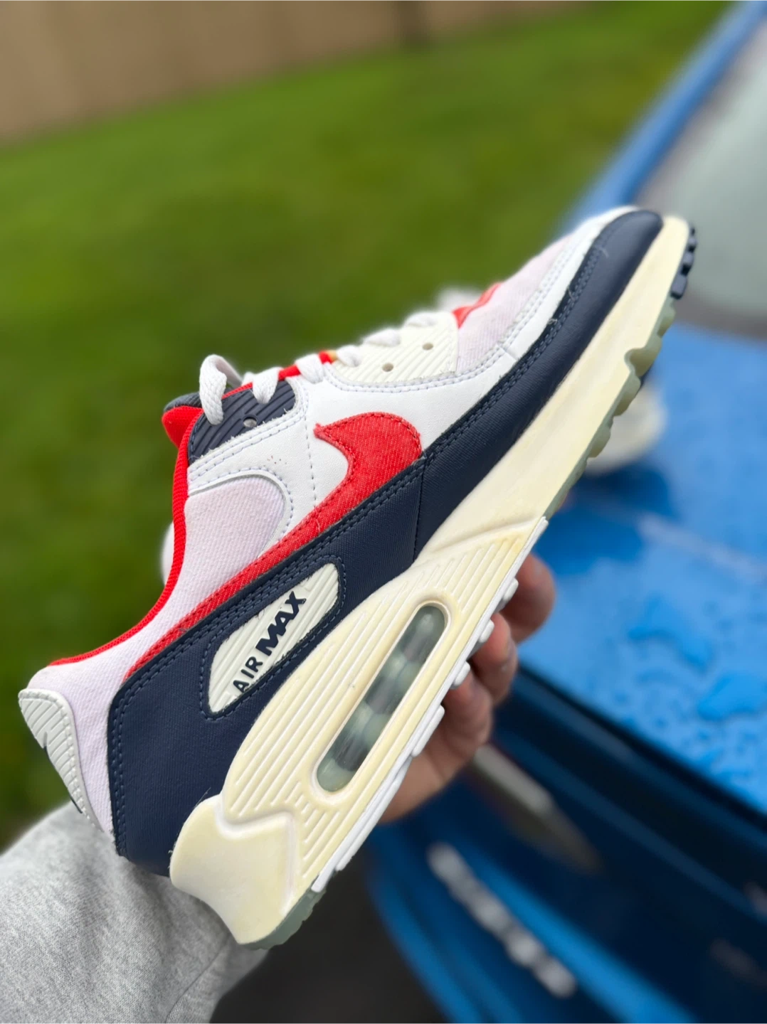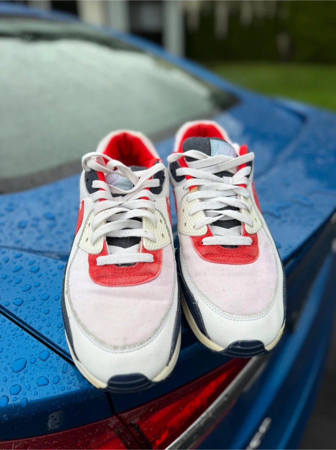 Selling a pair of Nike Air Max 90s! They feature a classic design with a mix of white, red, and navy colours. The shoes are in good condition, perfect for casual wear or workouts. Check out the photos for a closer look!
