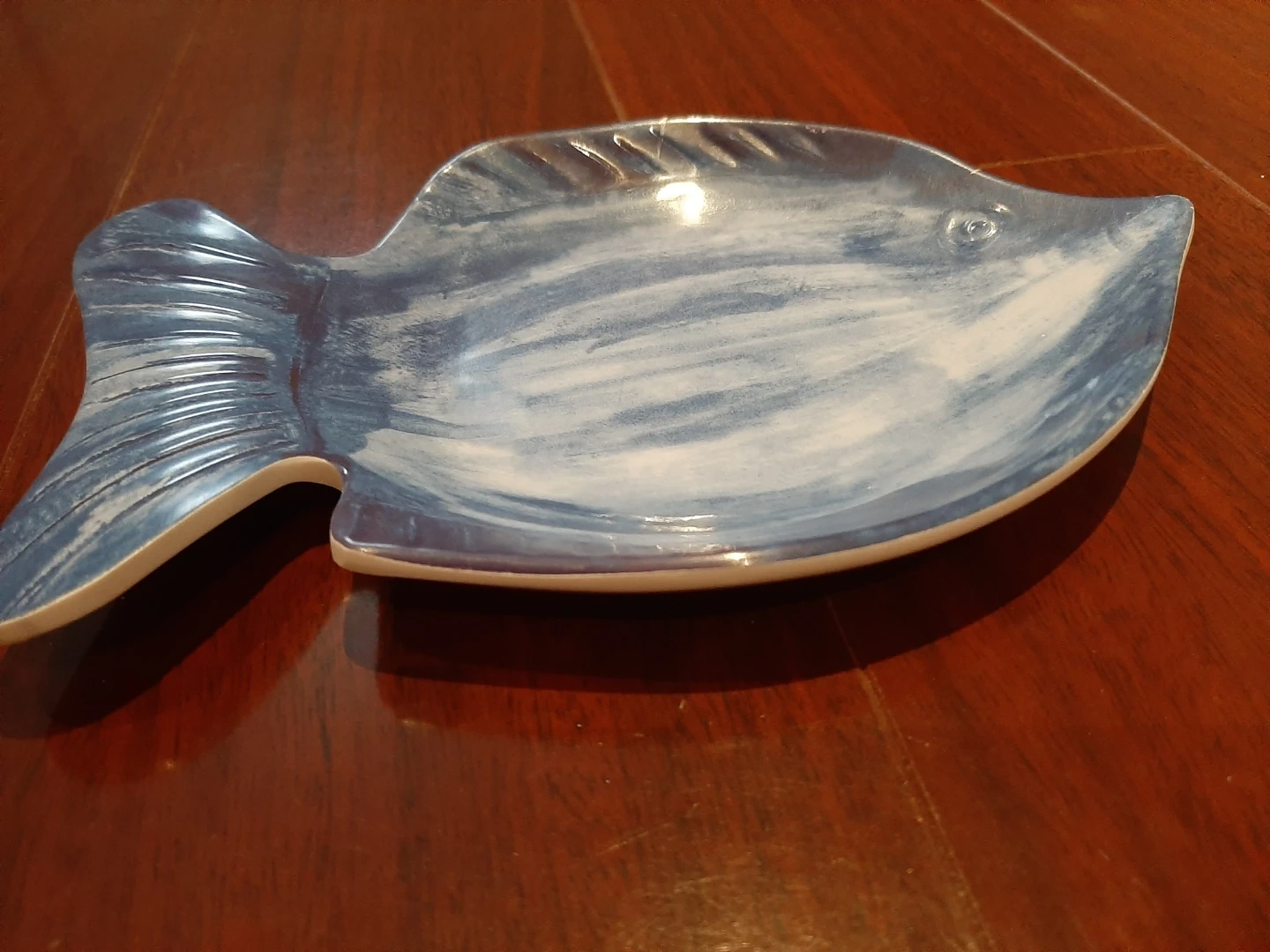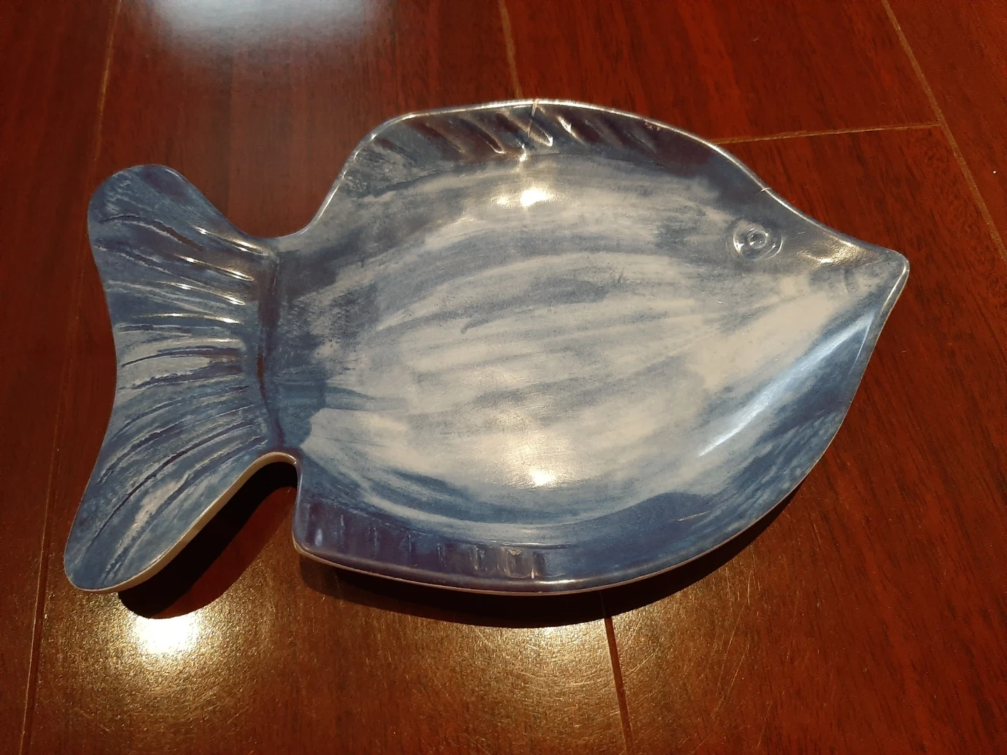 Here's a cute fish-shaped plate! It's perfect for serving snacks or as a decorative piece. The plate is in great condition and ready to add a touch of whimsy to your home. It's small and hard plastic.