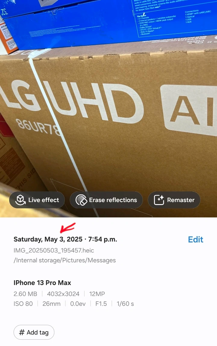 Selling an LG 86UR78 86" UHD AI TV. The box indicates that it has a wireless subwoofer and supports eARC and ARC for deeper bass. It also supports Bluetooth Surround Ready and has ThinQ AI and Apple Airplay 2