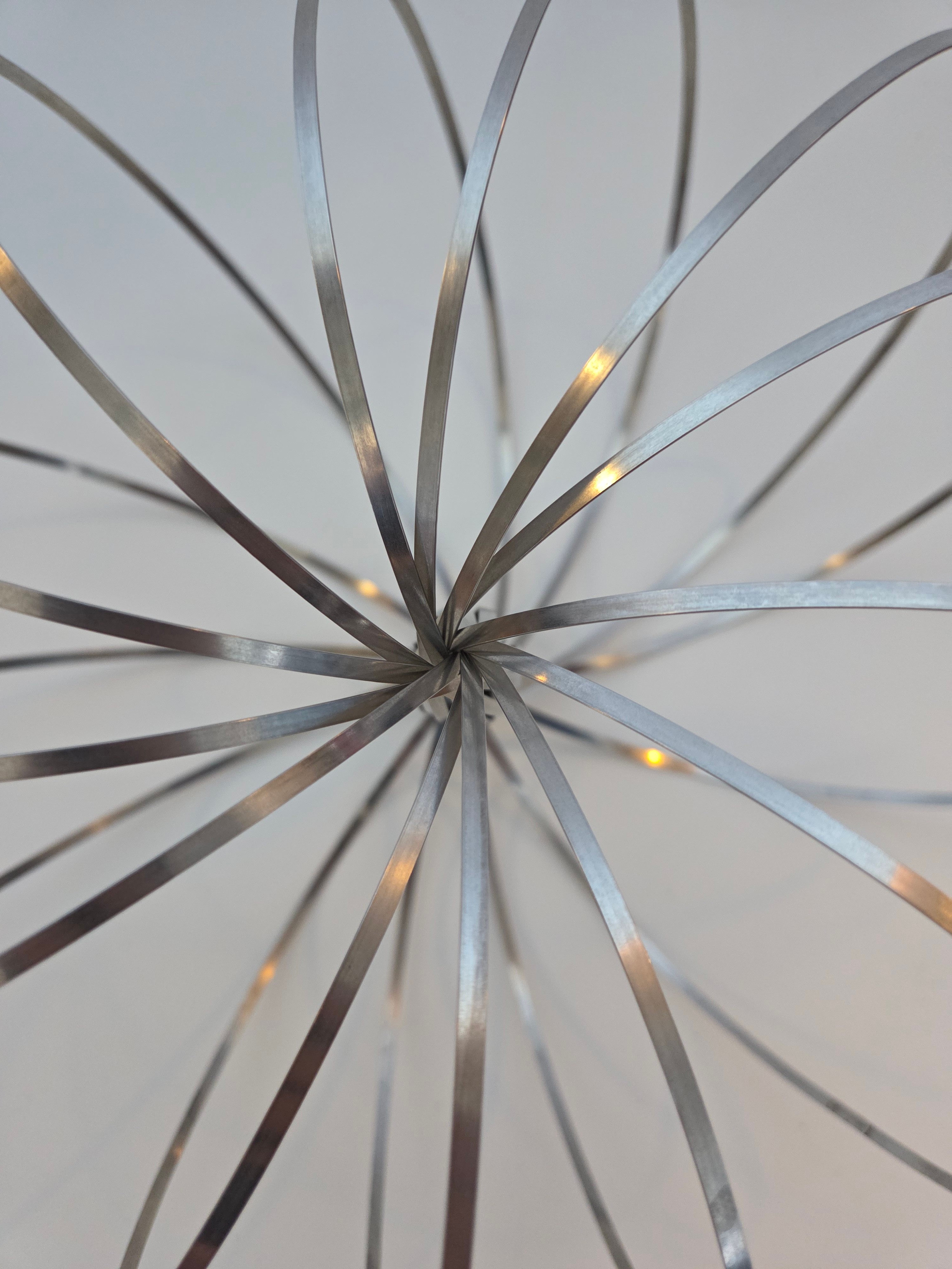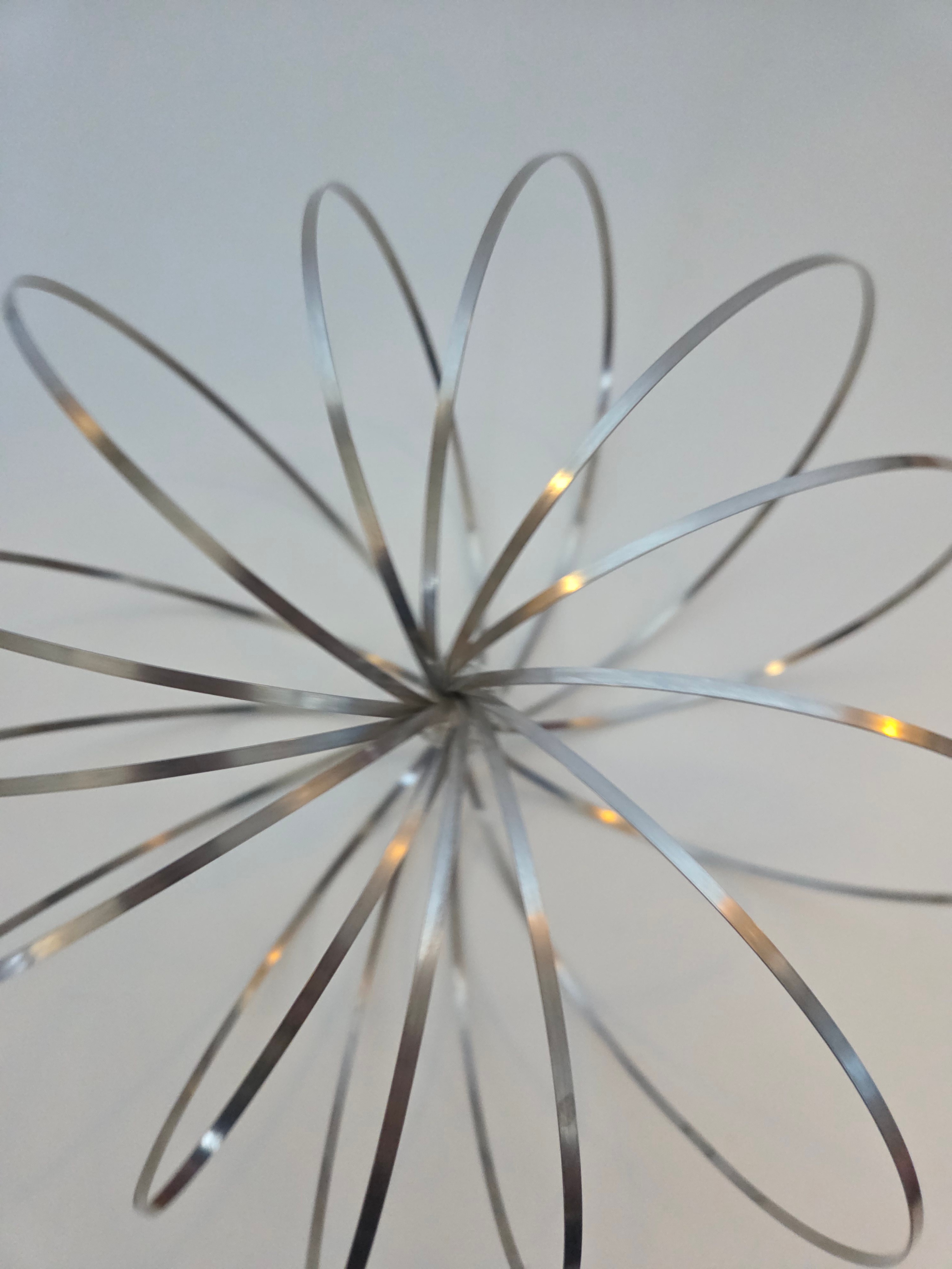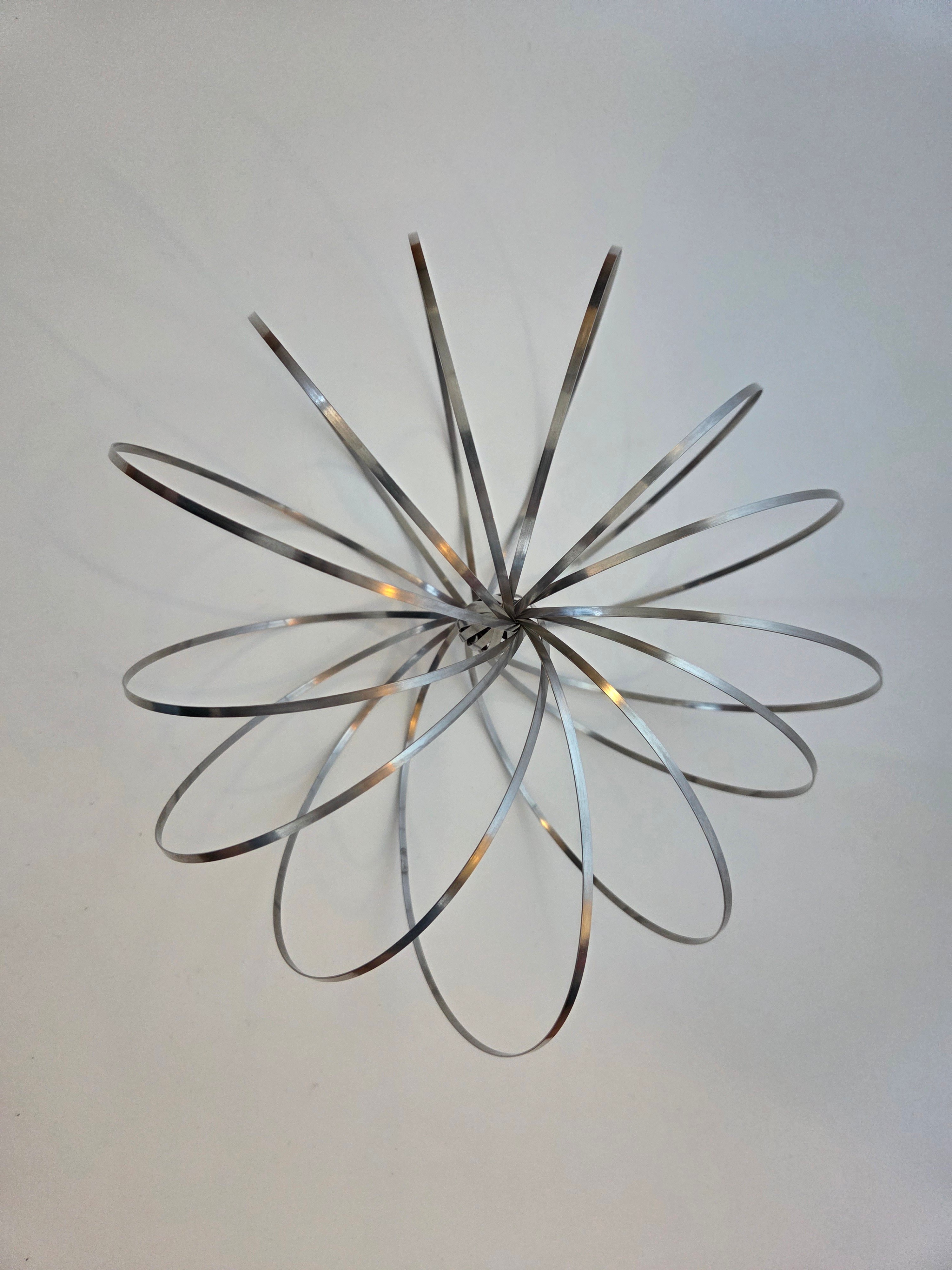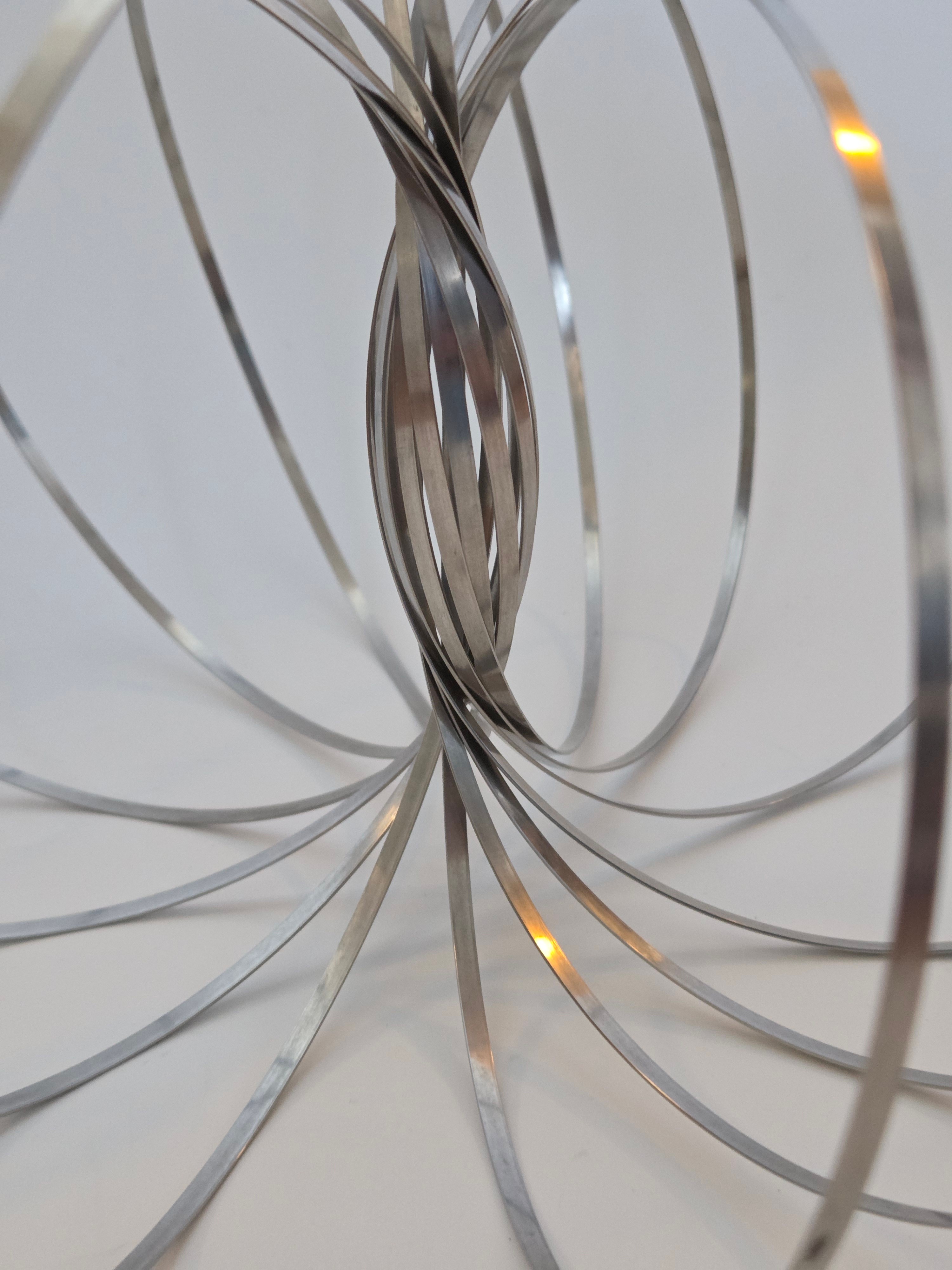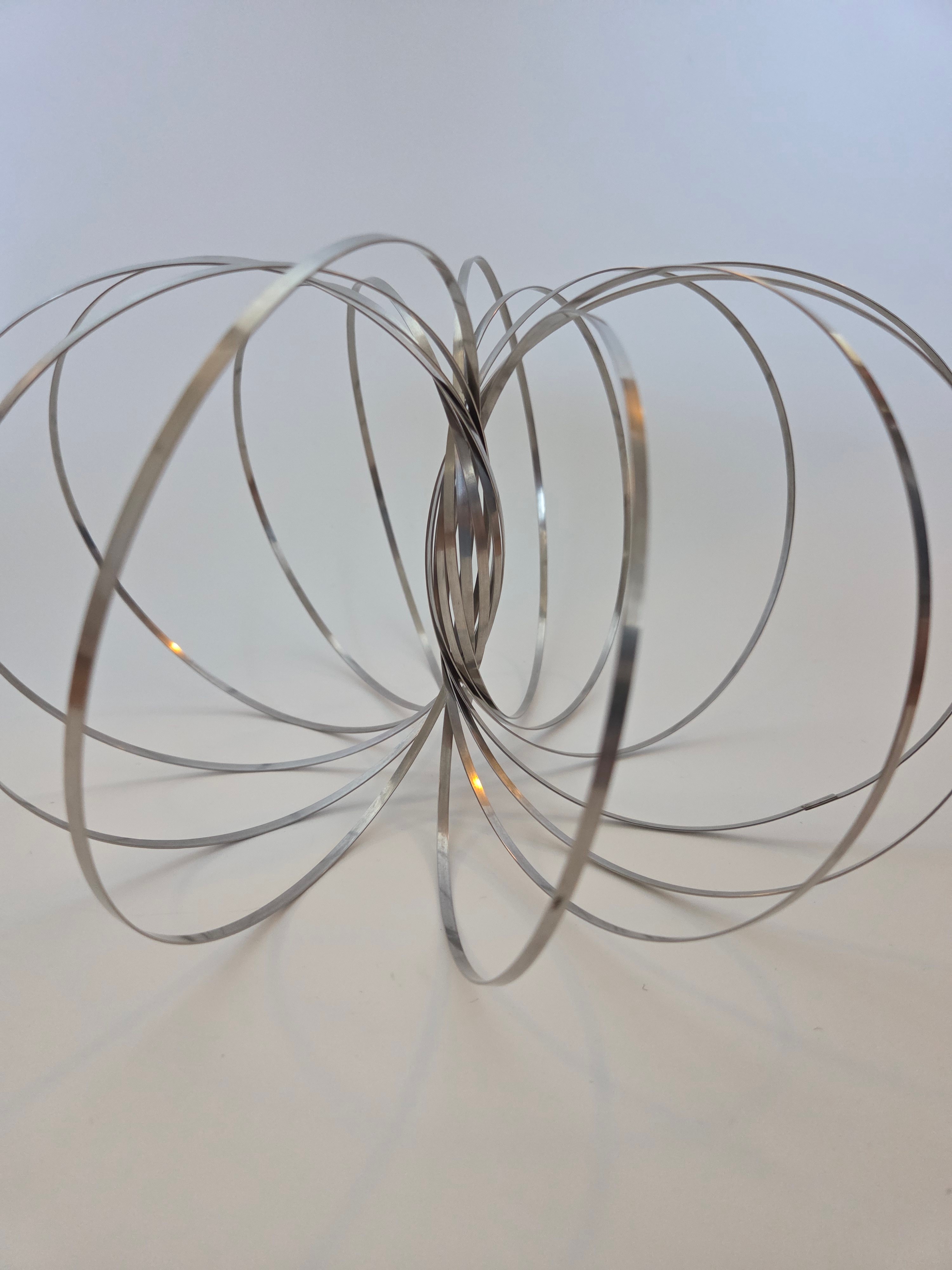 Fun kinetic “flow ring” made of stainless-steel spring bands. It collapses flat and pops into a mesmerizing 3D torus that rolls up and down your arms or a tube – great as a fidget, party trick, or STEM demo. • Material: stainless steel strip (smooth edges). • Condition: gently used, no kinks, only tiny hairline scuffs from normal play. • Size (approx.): – Collapsed: Ø 13 cm × 2 cm tall (5.1 in × 0.8 in) – Expanded sphere: Ø 24–26 cm (9.4–10.2 in) • What’s included: 1 flow ring. • Ages: fun for teens and adults; supervise younger kids. Pickup near 24 Southport St, Toronto, M6S 4Z1. Can bundle with other items.