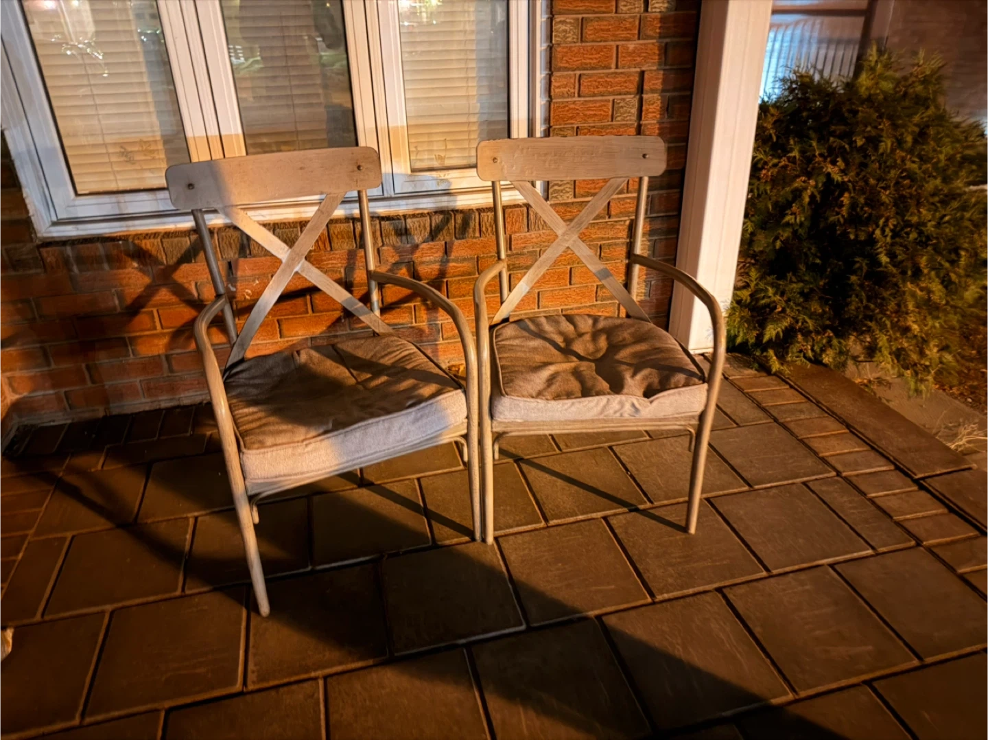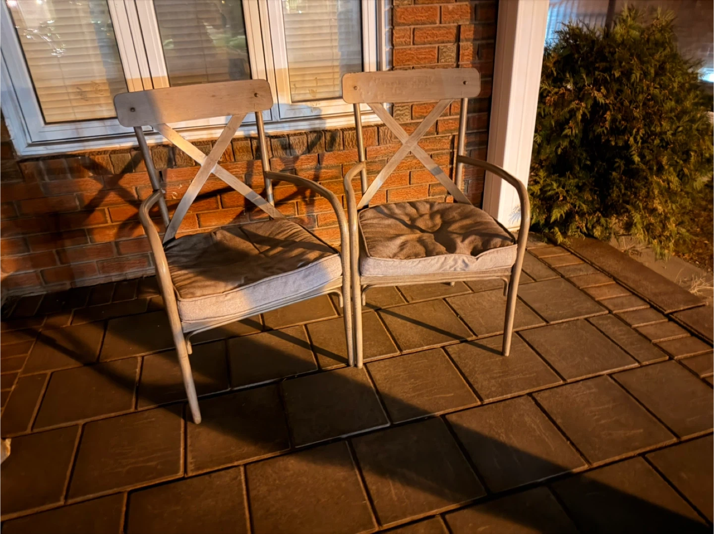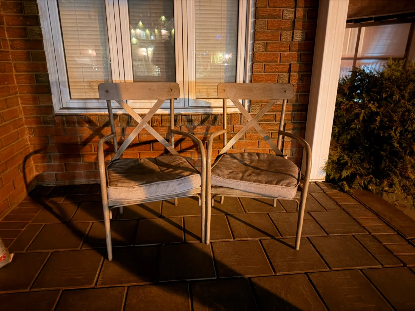 Selling a pair of outdoor patio chairs! They have a nice, neutral colour and a comfortable cushion. Perfect for enjoying the warmer weather on your porch or patio