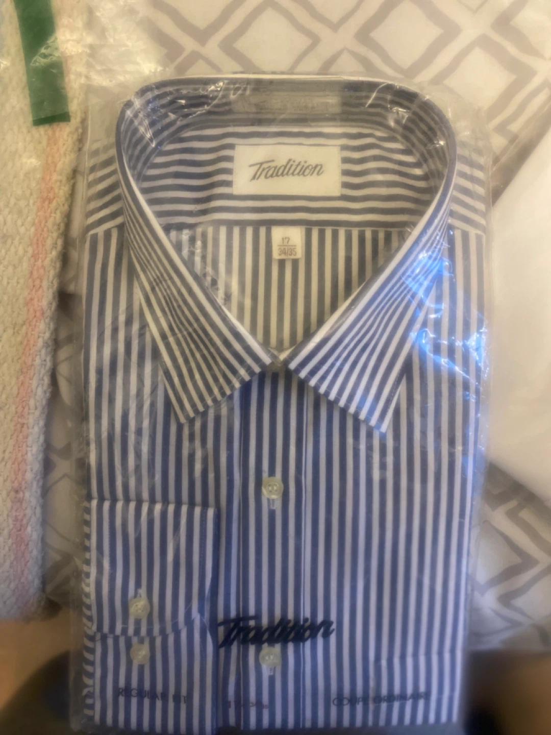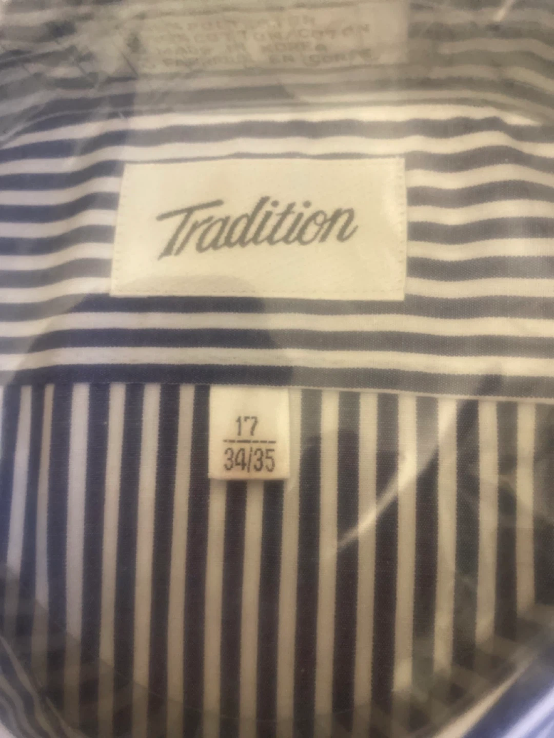 Selling a brand new Tradition dress shirt! It's a classic blue and white striped pattern. The size is 17 34/35. Perfect for work or a special occasion!