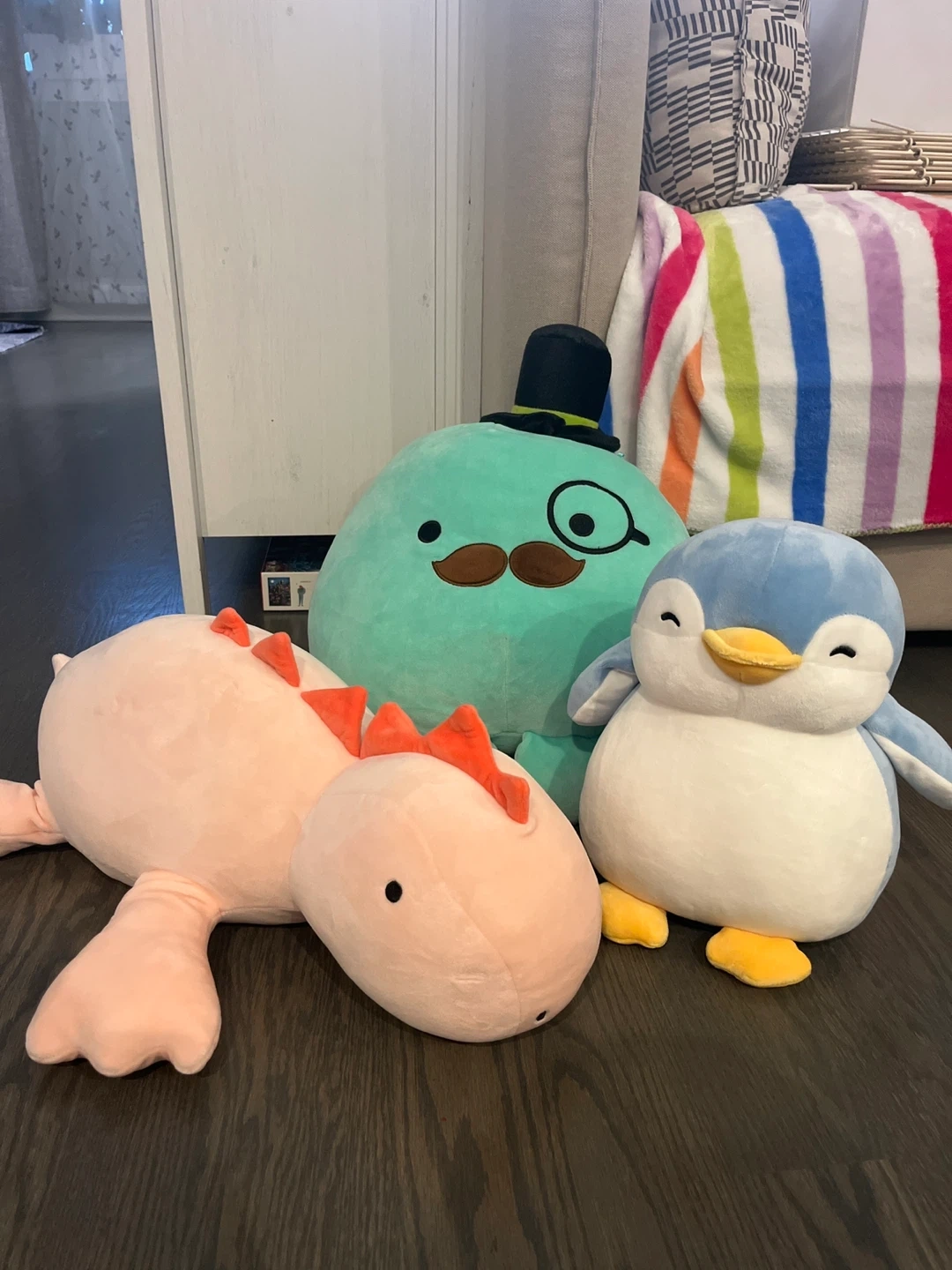 Selling a collection of cute plush toys! There's a light pink dinosaur, a blue penguin, and a green gentleman with a mustache and top hat. They're all in good condition and ready for a new home!
