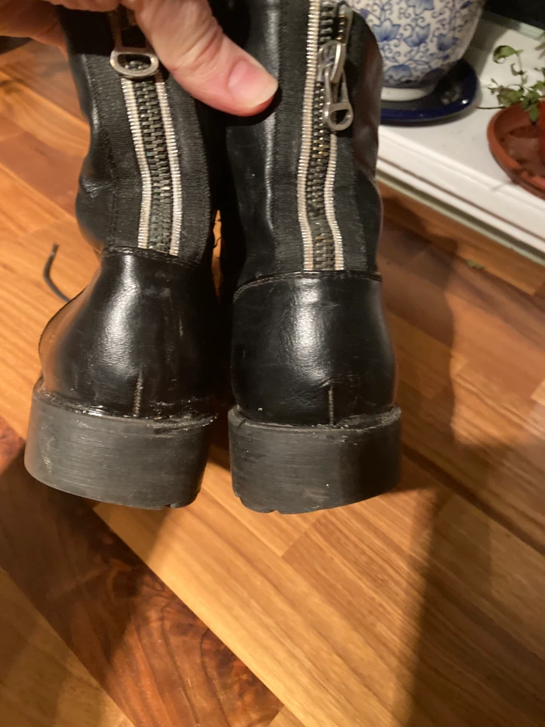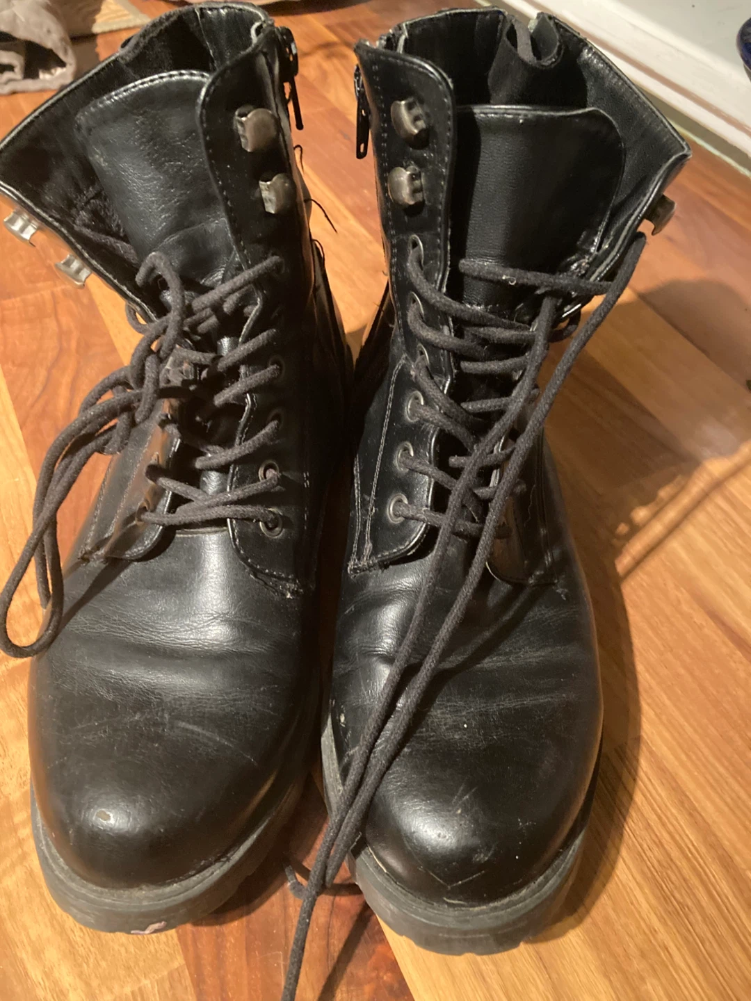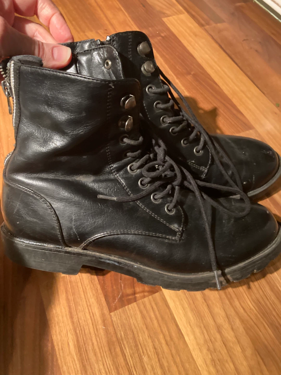 Selling a pair of black lace-up combat boots. Women’s size 7.5. They have a zipper detail on the back. They show some signs of wear, but are still in good condition for everyday use!
