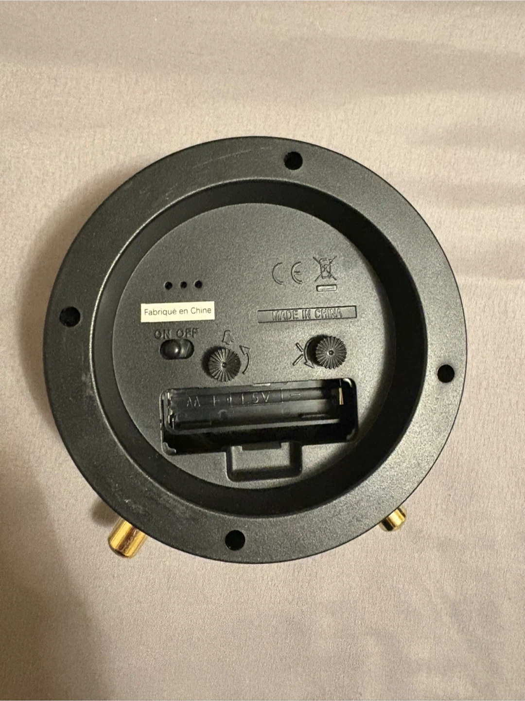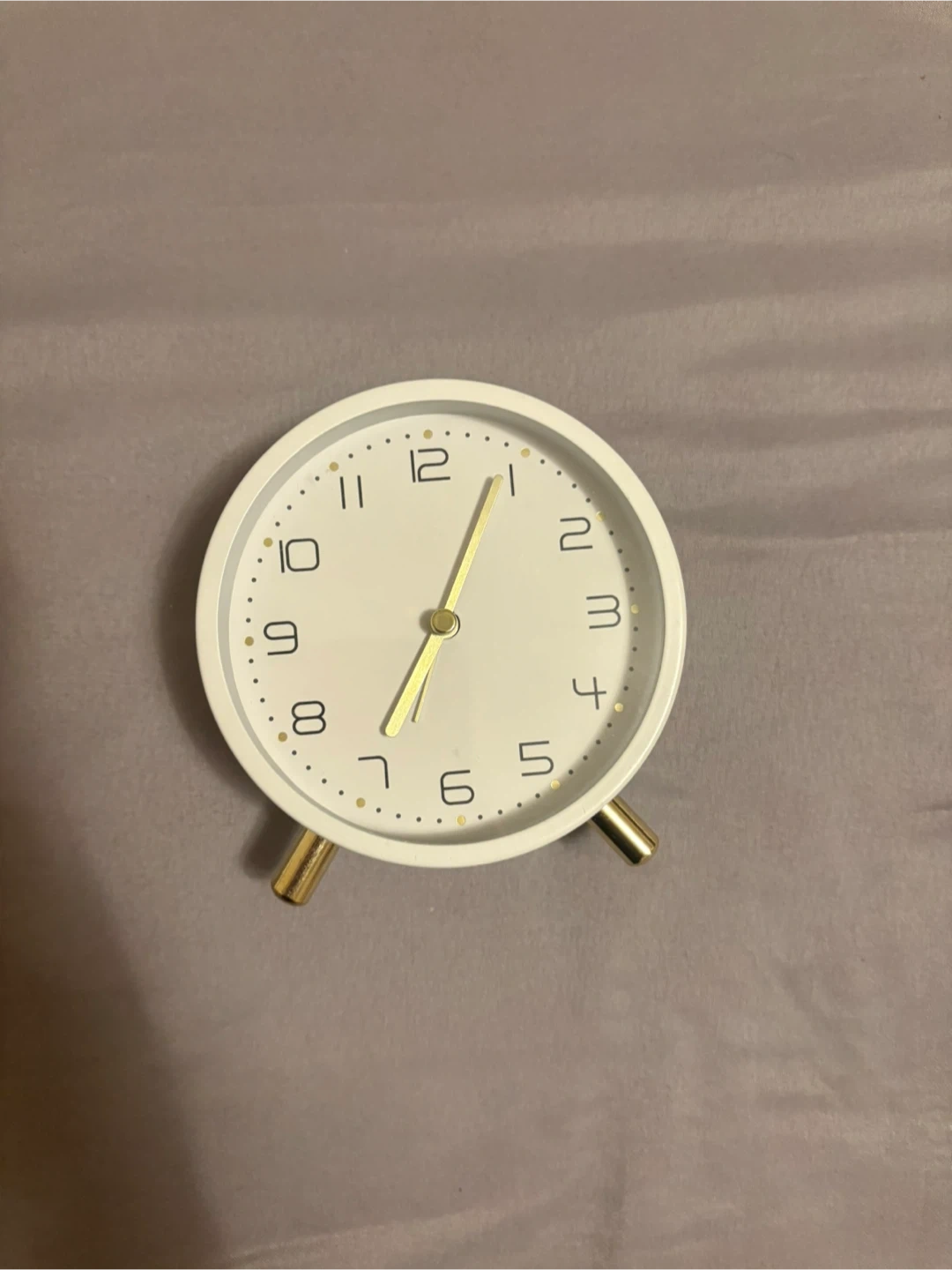 Selling a cute analogue alarm clock with a white face and gold legs! It's in great condition and would look great on a nightstand or desk