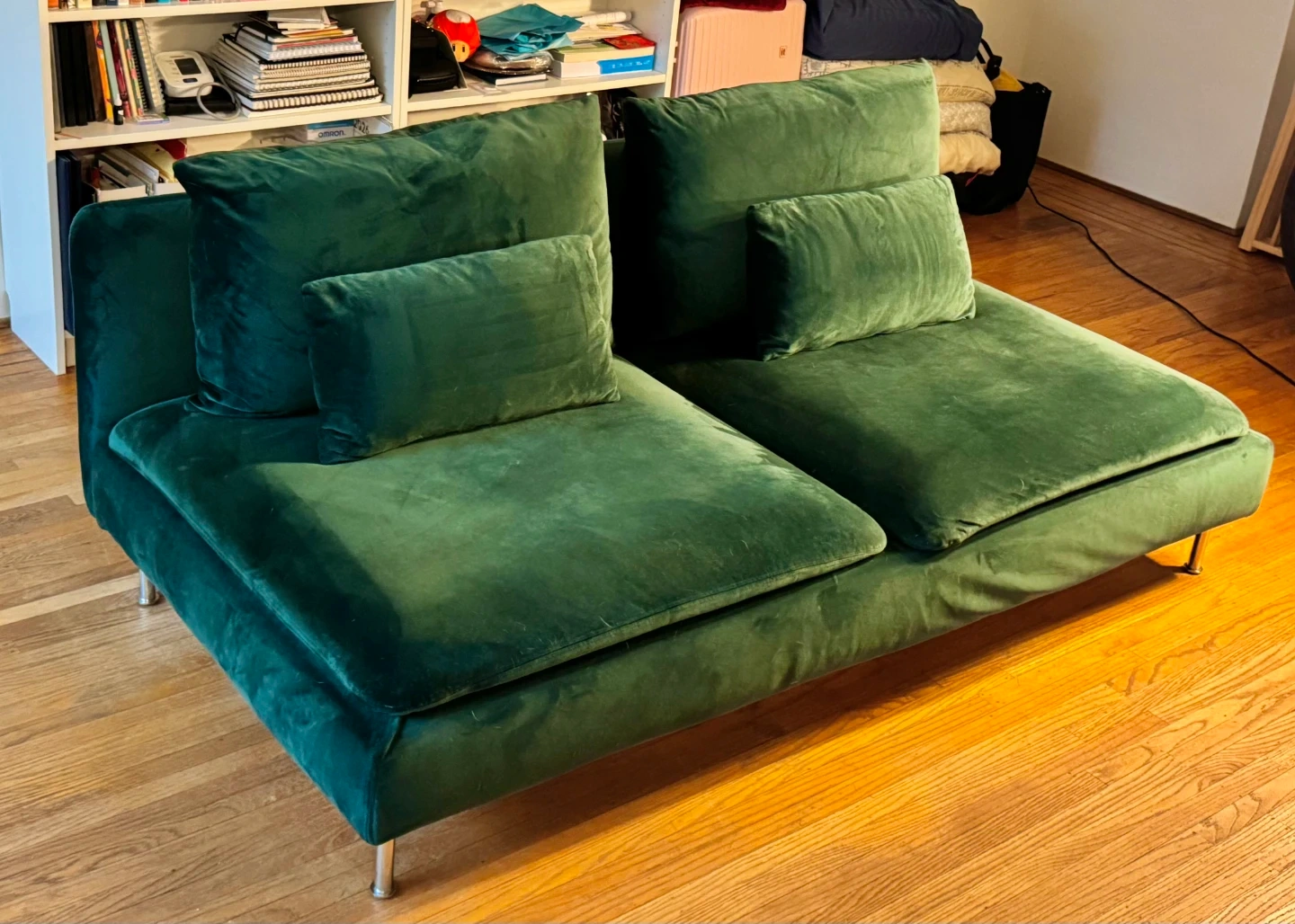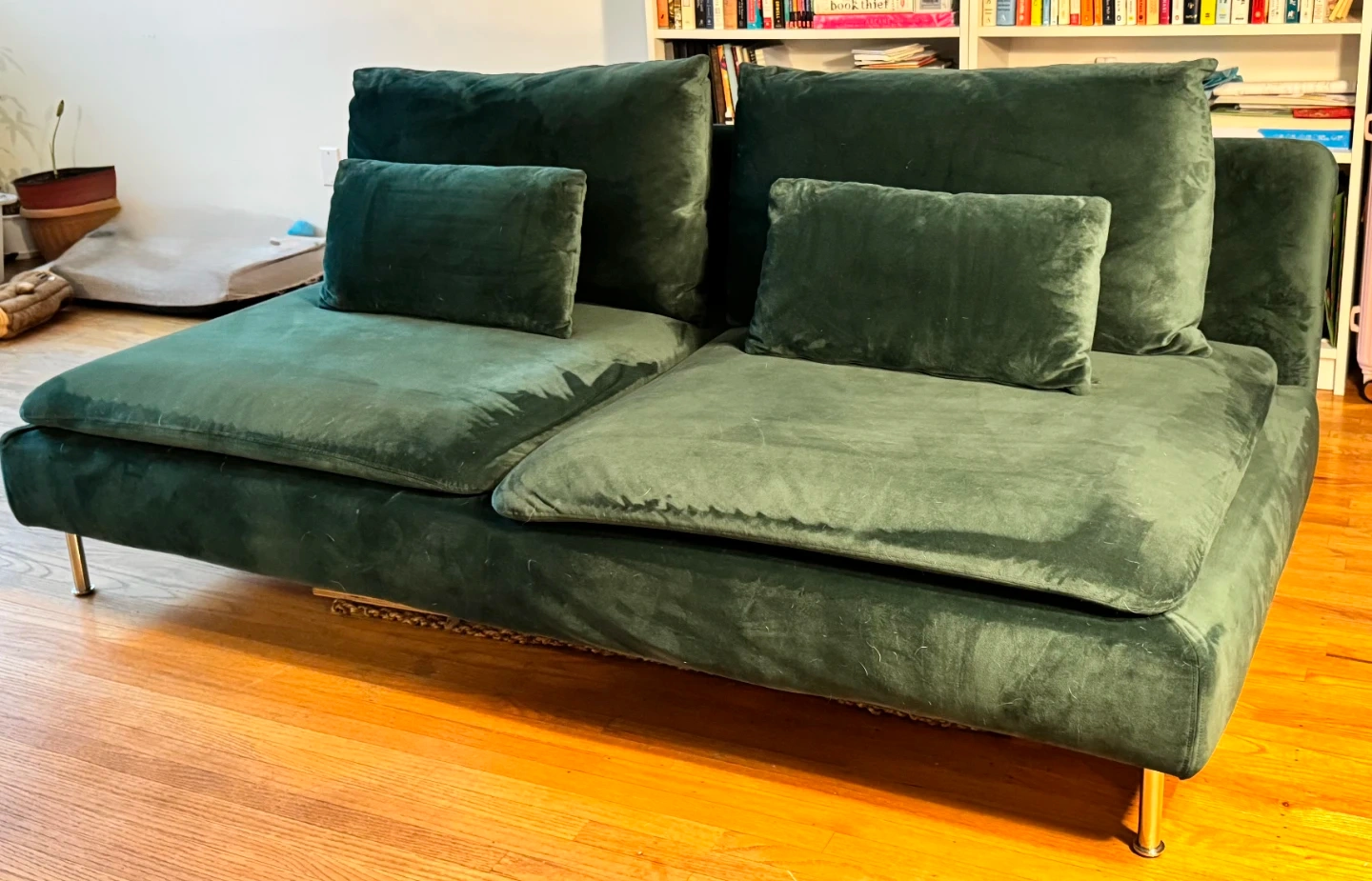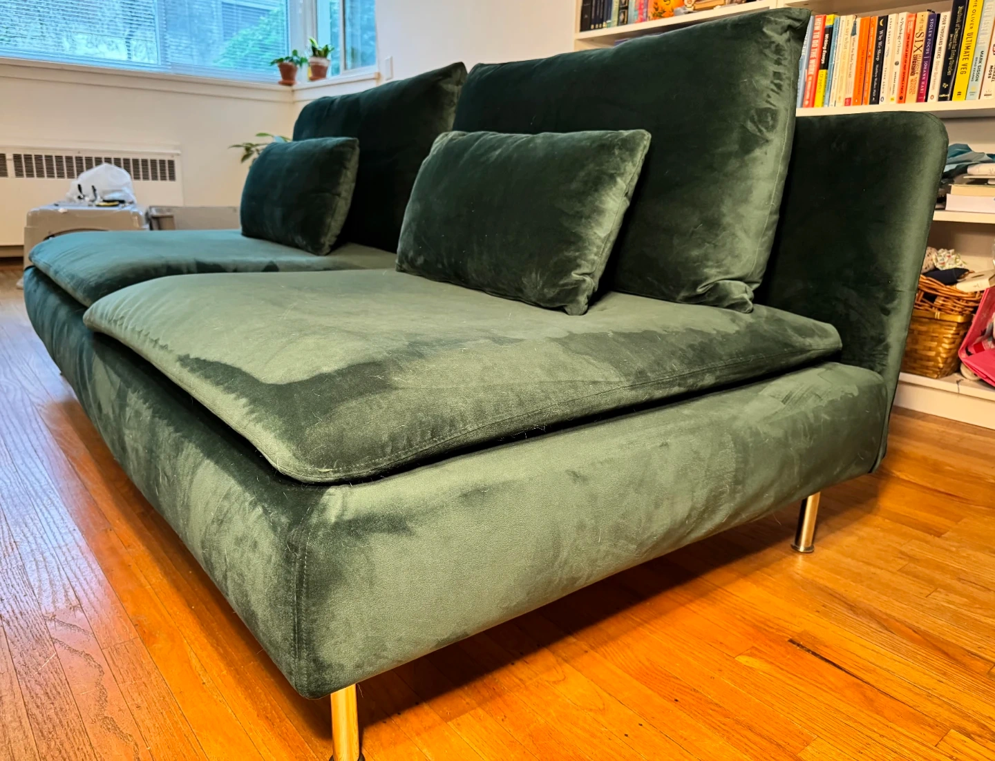 Sofa has deep seats with loose back cushions. Pine green velvet covers were custom-made and are machine washable and dryer-friendly.